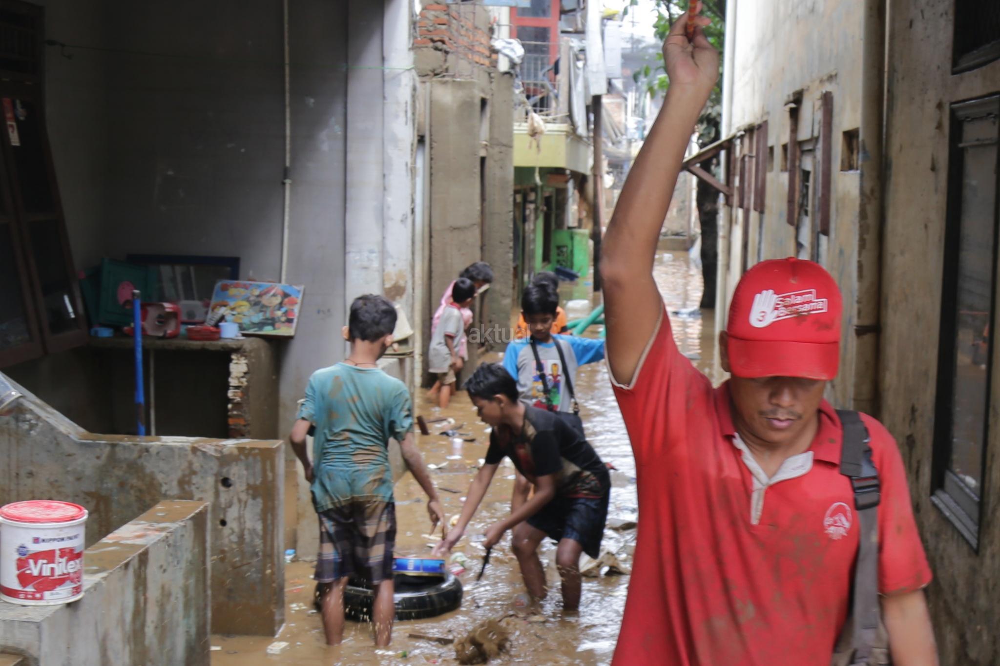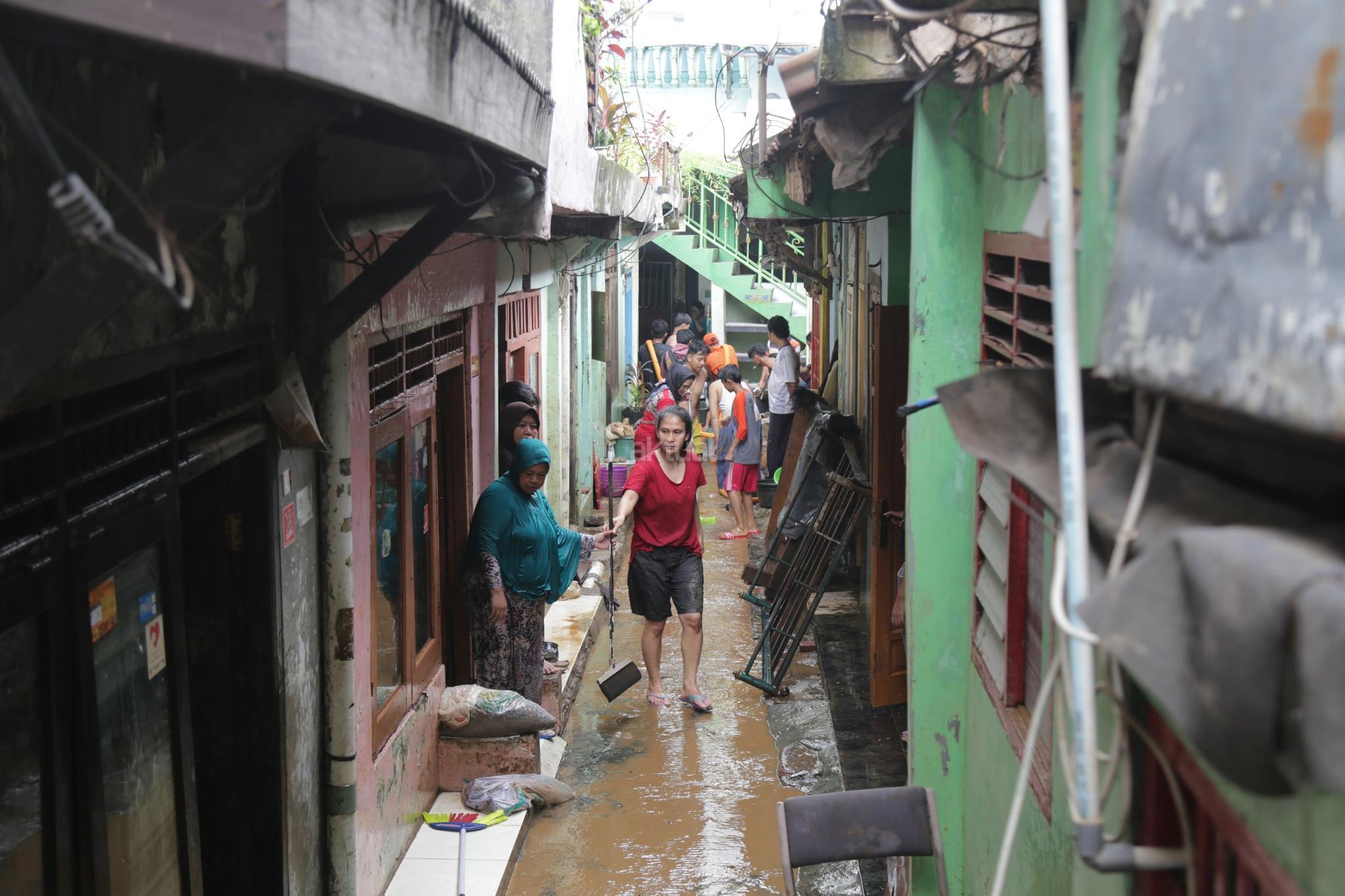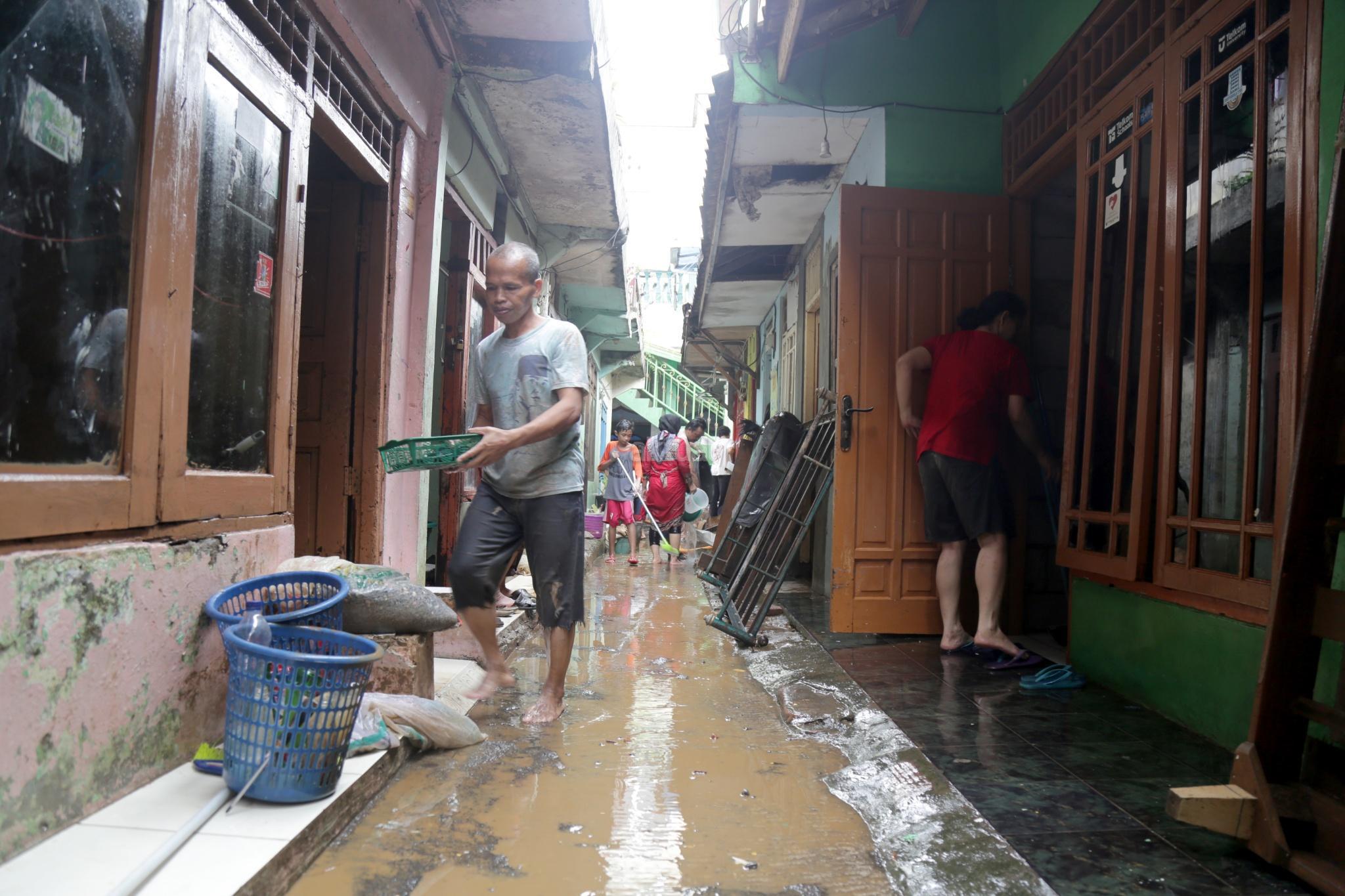 Warga membersihkan sisa banjir yang melanda kawasan Rawa Jati, Kalibata, Jakarta Selatan, Selasa (6/2/18). Kawasan tersebut terendam banjir akibat luapan air dari Sungai Ciliwung. AKTUAL/Tino Oktaviano