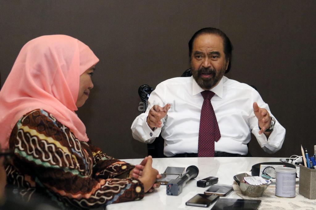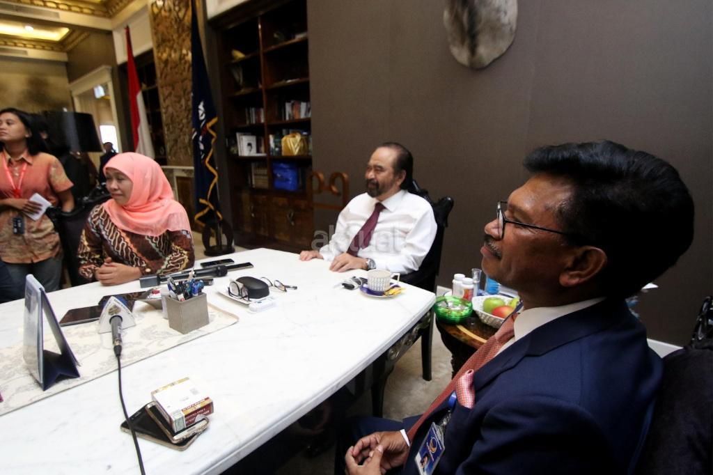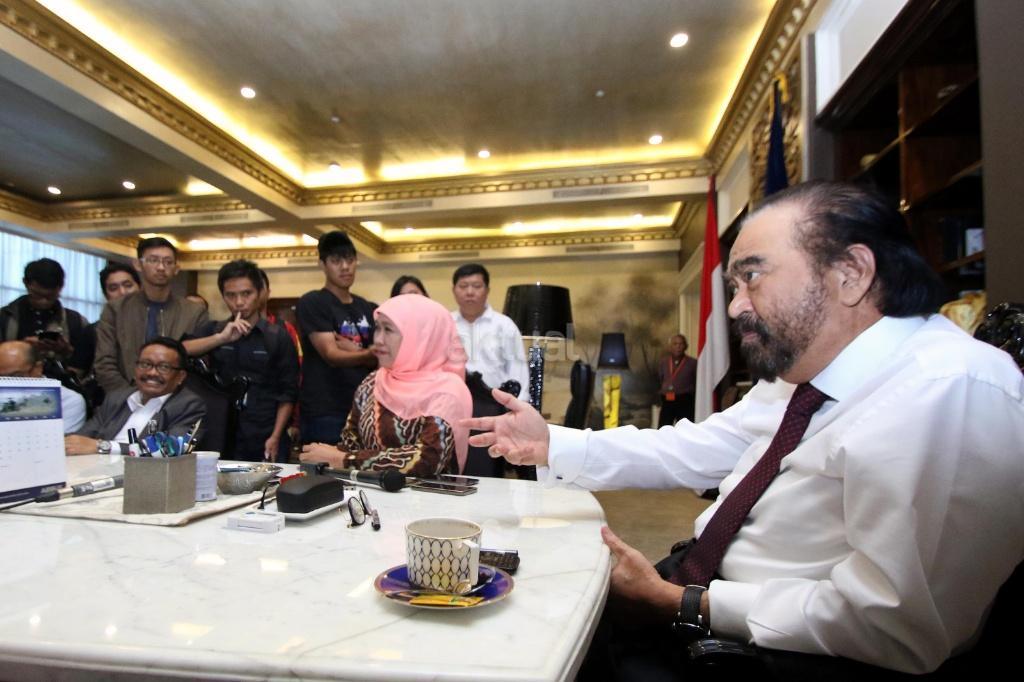 Menteri Sosial Khofifah Indar Parawansa (kiri) berbincang dengan Ketua Umum Partai Nasional Demokrat (Nasdem) Surya Paloh (kanan) terkait Pilgub Jatim 2018 di kantor DPP Partai Nasional Demokrat (Nasdem), Jakarta, Rabu (11/10/2017). Kedatangan Khofifah Indar Parawansa menemui Surya Paloh untuk membahas soal siapa yang akan ditunjuk untuk mendampingi Khofifah sebagai Wakilnya dalam Pemilihan Gubernur (Pilgub) Jawa Timur pada 2018 mendatang. AKTUAL/Munzir