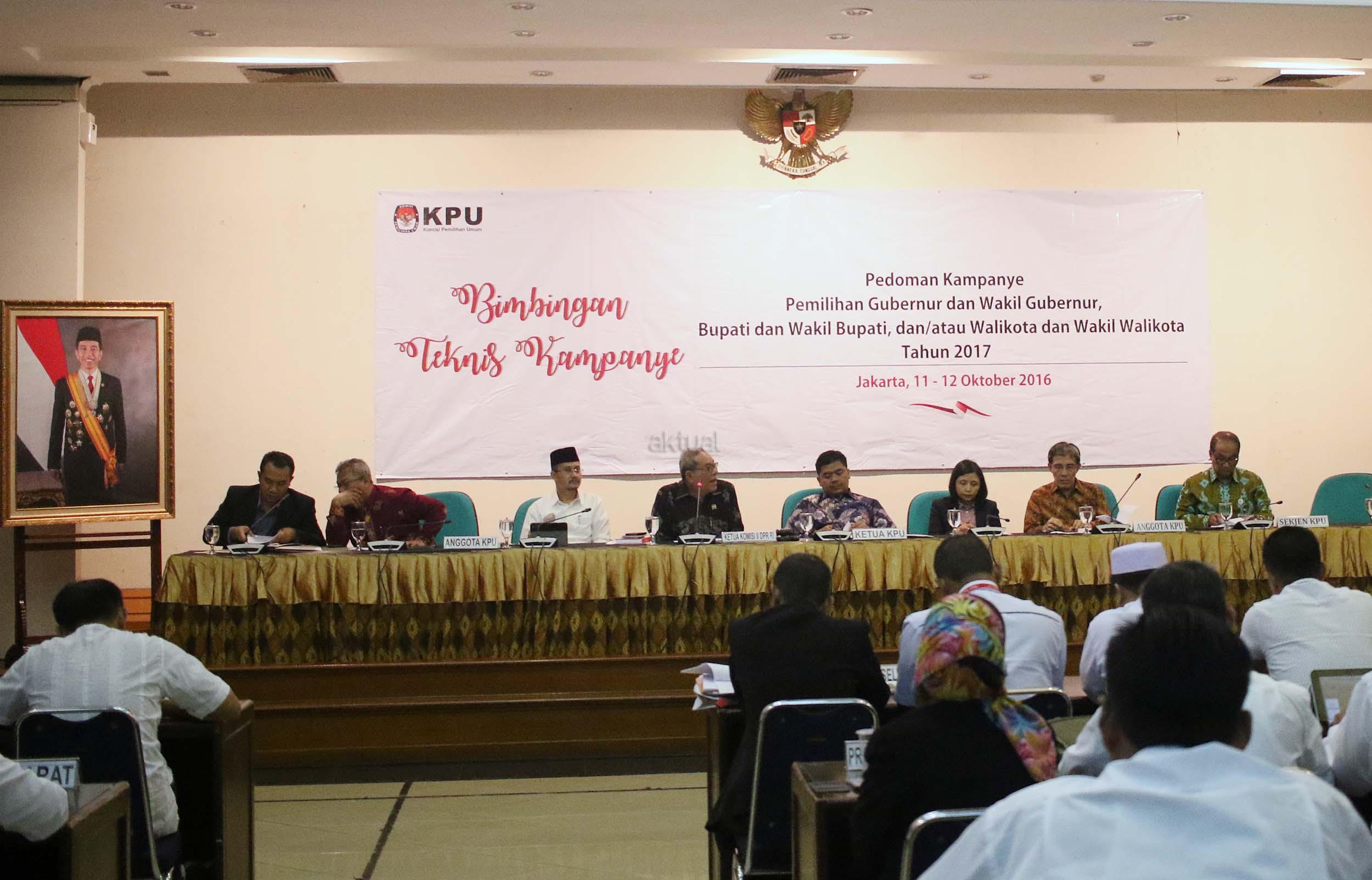 Kiri-kanan ; Komisioner KPU RI Sigit Pamungkas, Komisioner KPU RI Arif Budiman, Komisioner KPU RI Ferry Kurnia Rizkiyansyah, Ketua Komisi II DPR RI Rambe Kamarul Zaman, Ketua Komis Pemilihan Umum Juri Ardiantoro, Komisioner KPU RI Ida Budhiati, Komisioner KPU RI Hadar Nafis Gumay saat menggelar Bimbingan Teknis Pedoman Teknis Kampanye Pemilihan Gubernur dan Wakil Gubernur, Bupati dan Wakil Bupati, dan/atau Walikota dan Wakil Walikota Tahun 2017 di Ruag Sidang Utama KPU RI, Jakarta, Selasa (11/10). Kegiatan yang diikuti oleh 68 peserta dari anggota KPU Provinsi ini bertujuan pada peningkatan pemahaman aspek regulasi pelaksanaan kampanye sekaligus mengumpulkan daftar inventaris masalah, sehinga diharapkan mampu menditeksi kemungkinan potensi permasalahan yang berimplementasi pada pelanggaran kampanye yang berujung pada persengketaan hukum. Aktual/Munzir