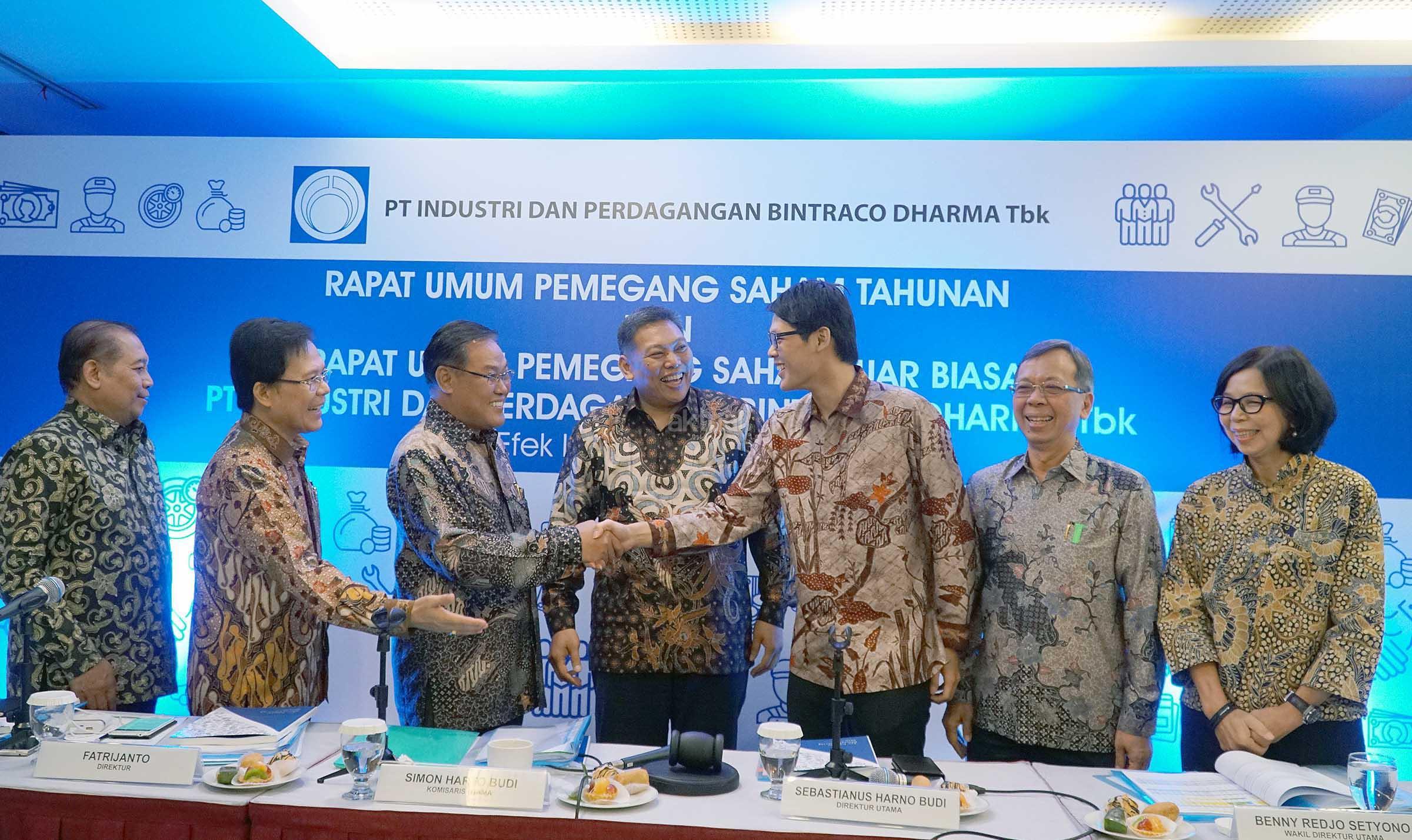 Presiden Komisaris PT Industri dan Perdagangan Bintraco Dharma Tbk (Bintraco), Simon Harto Budi (ketiga dari kiri) menyalami Komisaris baru, Jonathan Budi disaksikan jajaran Direksi dan Komisaris lainnnya seusai RUPS Tahunan dan RUPSLB di Jakarta, Senin (22/5). Bintraco membukukan laba bersih sebesar Rp 165 Miliar di tahun 2016 atau meningkat sebesar 52% dari Rp 108 Miliar di tahun 2015.Pendapatan bersih Bintraco tercatat Rp 6,8 triliun atau tumbuh sebesar 20% dari Rp 5,7 triliun di tahun 2015 yang terutama didorong oleh pertumbuhan unit penjualan mobil Toyota,sejalan dengan diluncurkannya model model mobil baru di penghujung tahun 2015 dan selama tahun 2016.Dalam RUPS, disetujui penggunaan laba bersih sebagai dividen tunai dengan nilai sebesar Rp 49,5 miliar atau Rp 33 per lembar saham. AKTUAL/Eko S Hilman