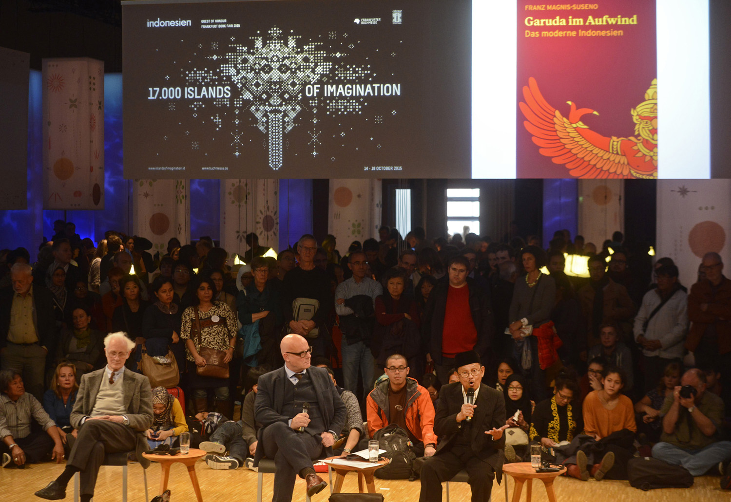 Mantan Presiden BJ Habibie (kanan) menjadi pembicara bersama Franz Magnis Suseno (kiri) dalam diskusi pada hari terakhir "Frankfurt Book Fair 2015", di Jerman, Minggu (18/10). Diskusi tersebut membahas buku Franz Magnis dengan judul "Neue Schwingen fur Garuda: Indonesien zwischen Tradition und Moderne" (Garuda Rising - Contemplating Modern Indonesia). ANTARA FOTO/Fanny Octavianus/ama/15.