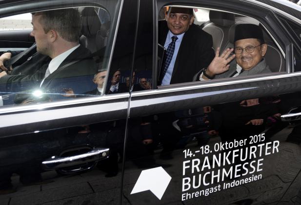 Mantan Presiden BJ Habibie usai menjadi narasumber dalam bedah buku karya Franz Magnis Suseno berjudul "Garuda Rising: Contemplating Modern Indonesia" pada hari terakhir "Frankfurt Book Fair 2015", di Jerman, Minggu (18/10). Selain menjadi narasumber pada festival buku terbesar itu, Habibie juga akan menjalani pengobatan lutut di Jerman. ANTARA FOTO/Fanny Octavianus/ama/15.