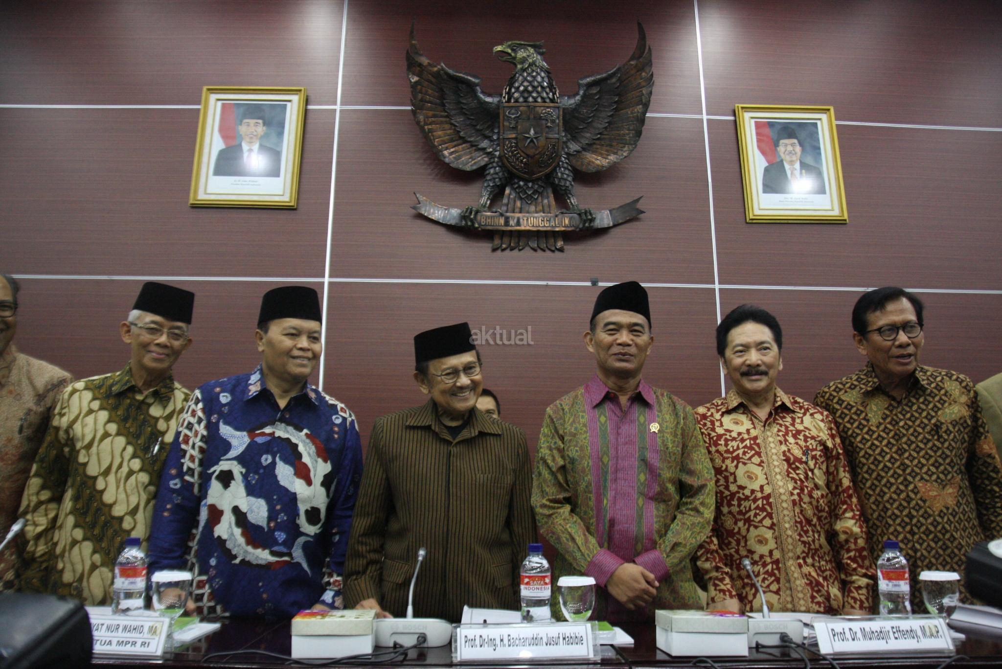 Presiden Ke 3 Prof Dr-Ing Bacharuddin jusuf Habibie (ketiga kiri) bersama Wakil Ketua MPR Hidayat Nur Wahid (kedua kiri) dan Menteri Pendidikan Muhadjir Effendi (ketiga kanan) berfoto bersama sebelum Rapat Pleno dengan Lembaga Pengkajian MPR RI di Ruang GBHN, Kompleks Parlemen, Senayan, Jakarta, Selasa (22/8). Rapat Pleno dengan membahas tema "Proses Transformasi Pembelajaran Karakter Bangsa Sebagai Implementasi Pasal 31 ayat 3 dan Pasal 32 UUD NRI Tahun 1945". AKTUAL/Tino Oktaviano