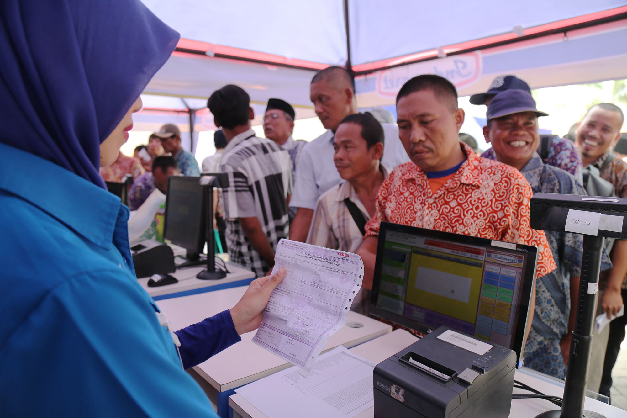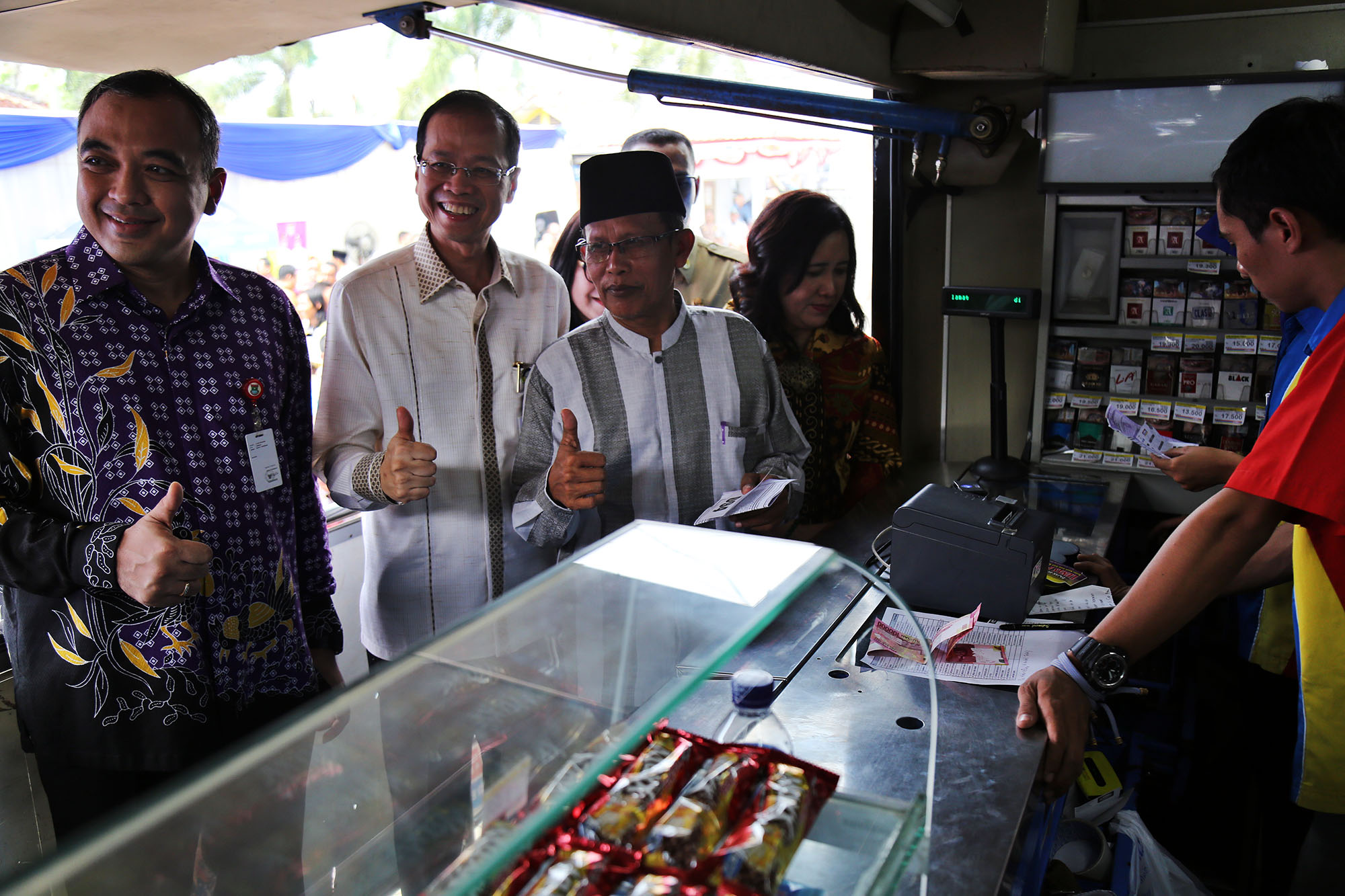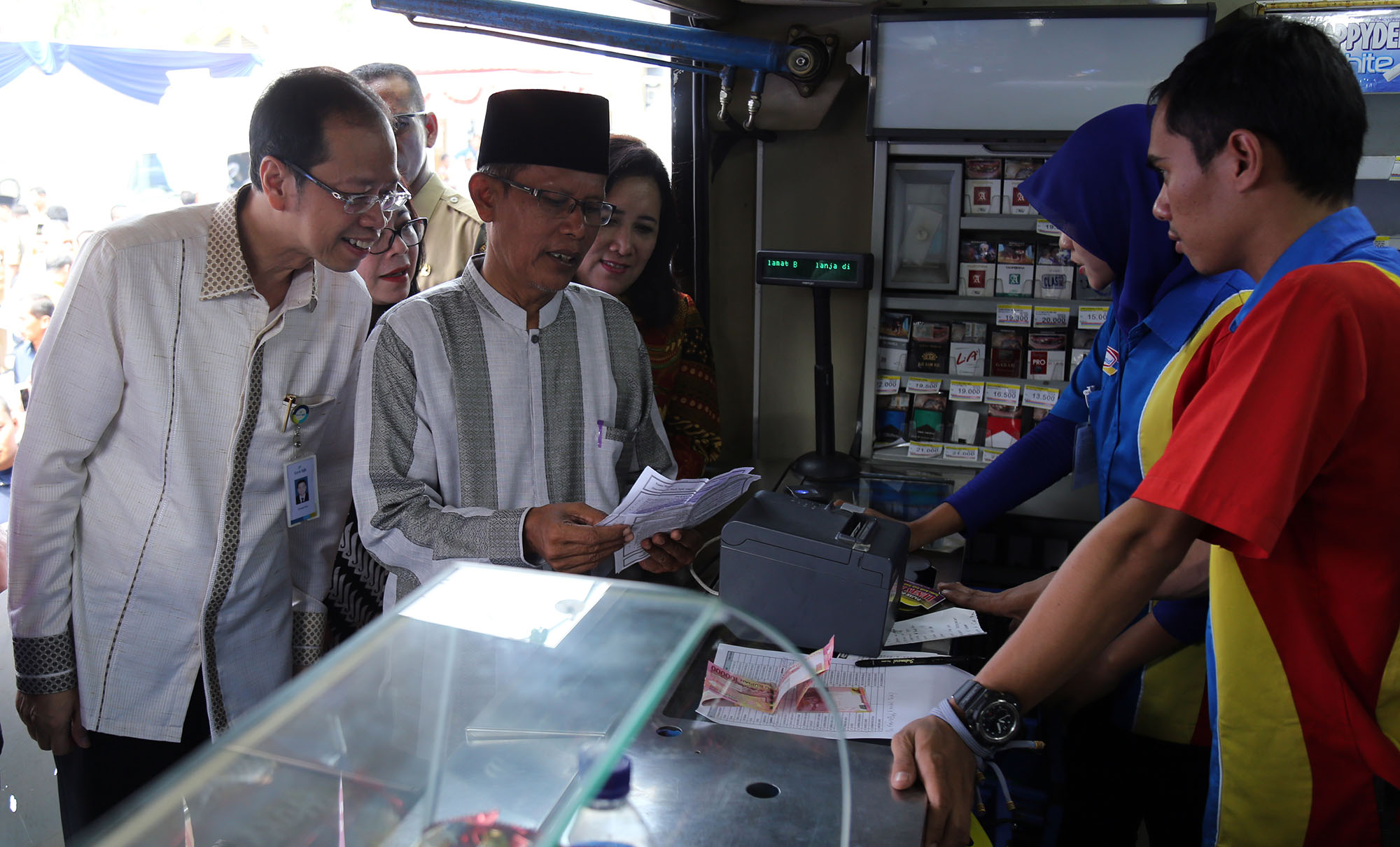 Direktur Utama Bank BJB Ahmad Irfan (kedua kiri) bersama Bupati Tangerang Ahmed Zaki Iskandar (kiri) berbincang dengan warga usai melakukan pembayaran Pajak Bumi dan Bangunan Pedesaan dan Perkotaan (PBB-P2) di Gerai Indomaret, Kronjo, Tangerang, Banten, Selasa (9/8). Bank BJB bekerja sama dengan Indomaret dalam pembayaran Pajak Bumi dan Bangunan Pedesaan dan Perkotaan (PBB-P2) bagi masyarakat di Kabupaten Tangerang guna meningkatkan pelayanan dan percepatan pembayaran, melalui kerjasama tersebut masyarakat dapat membayar PBB-P2 di gerai Indomaret. AKTUAL/TINO OKTAVIANO