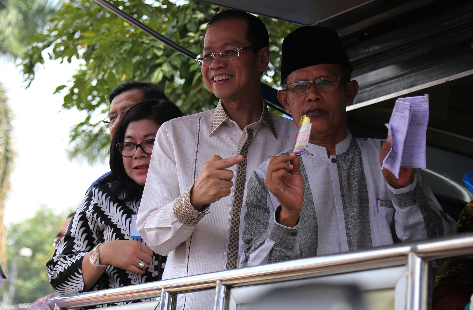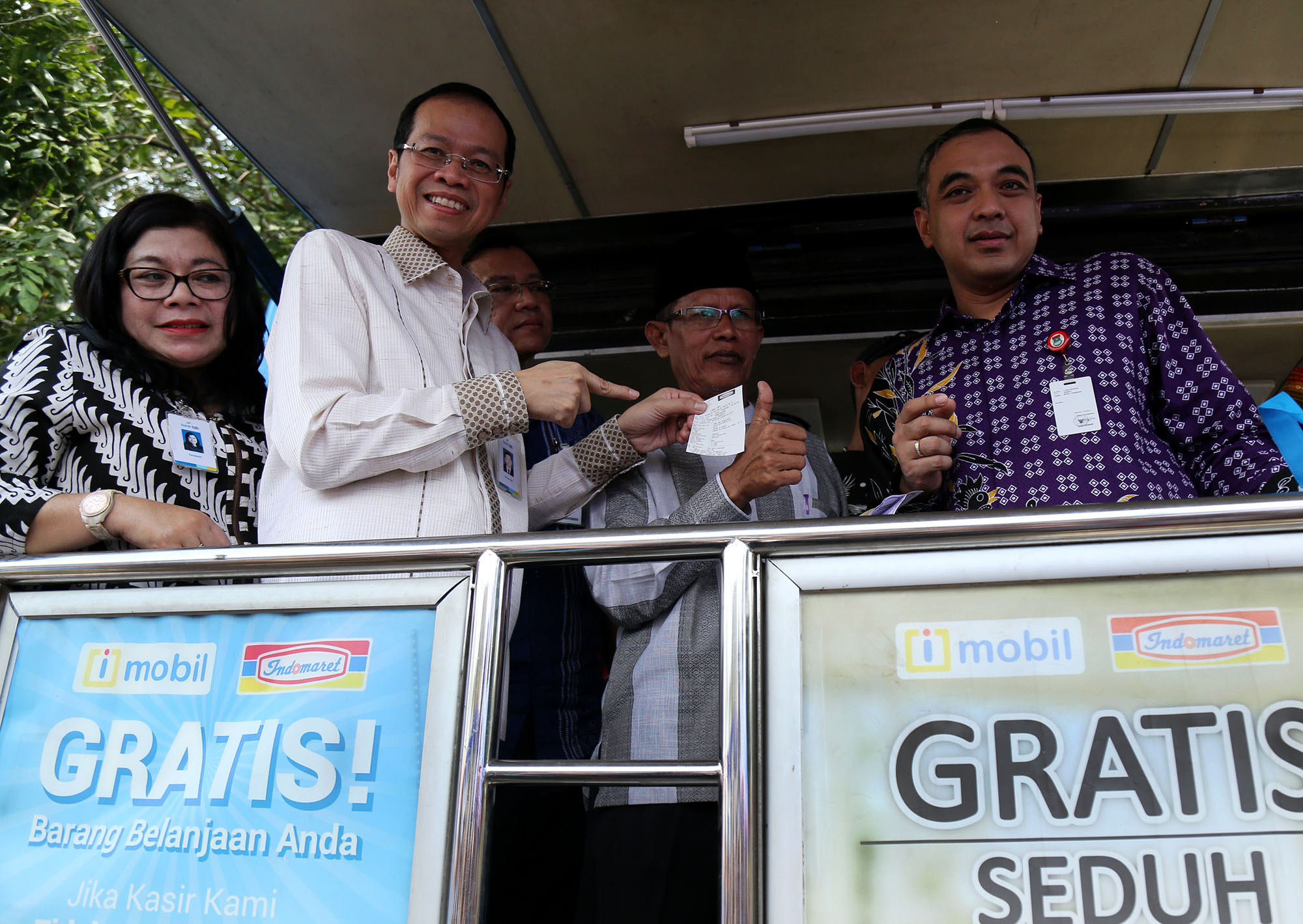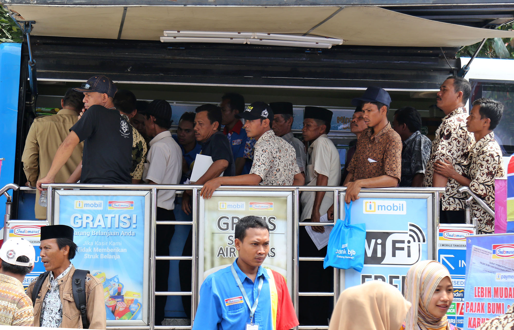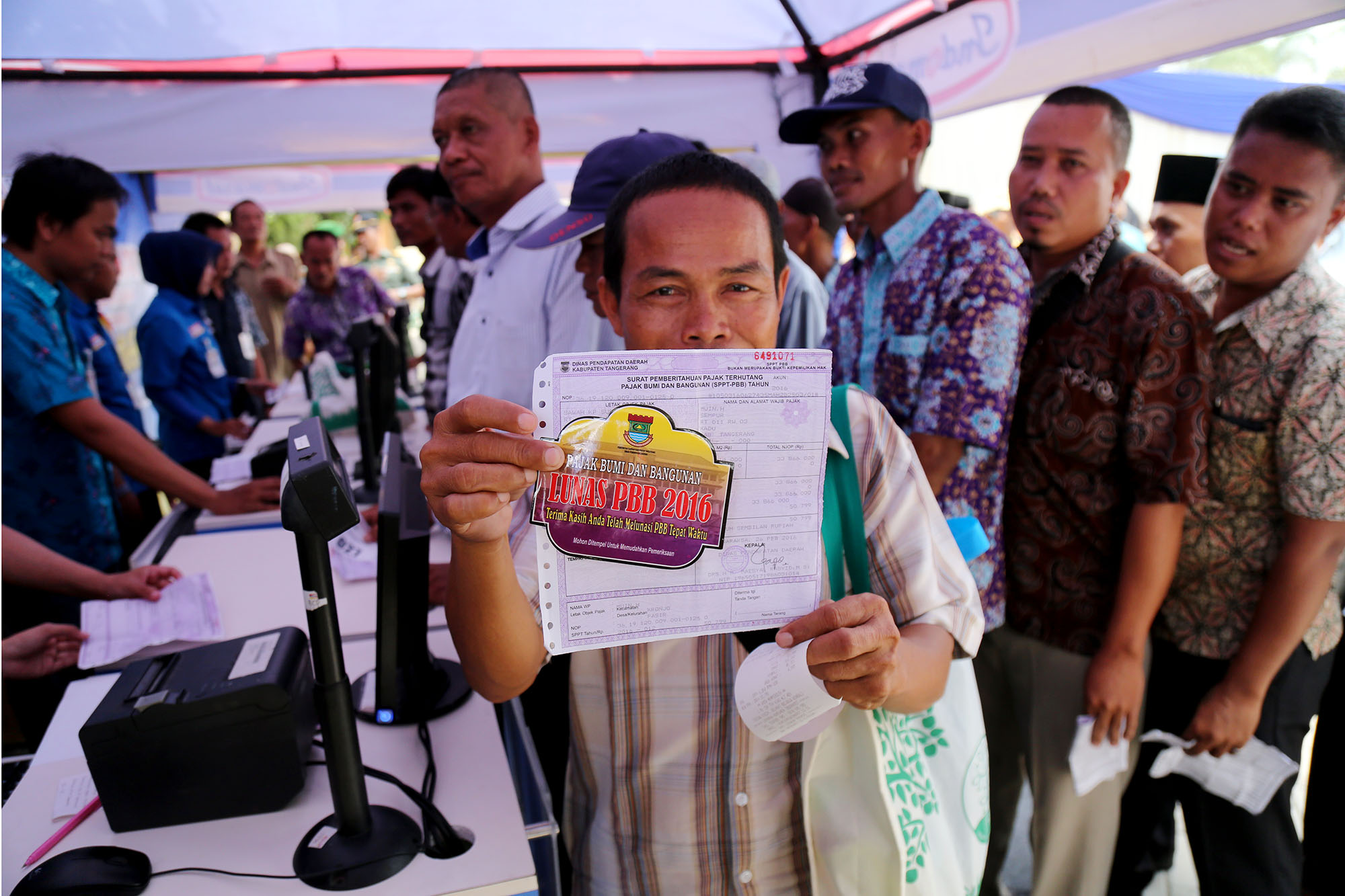 Direktur Utama Bank BJB Ahmad Irfan (kedua kiri) bersama Bupati Tangerang Ahmed Zaki Iskandar (kiri) berbincang dengan warga usai melakukan pembayaran Pajak Bumi dan Bangunan Pedesaan dan Perkotaan (PBB-P2) di Gerai Indomaret, Kronjo, Tangerang, Banten, Selasa (9/8). Bank BJB bekerja sama dengan Indomaret dalam pembayaran Pajak Bumi dan Bangunan Pedesaan dan Perkotaan (PBB-P2) bagi masyarakat di Kabupaten Tangerang guna meningkatkan pelayanan dan percepatan pembayaran, melalui kerjasama tersebut masyarakat dapat membayar PBB-P2 di gerai Indomaret. AKTUAL/TINO OKTAVIANO