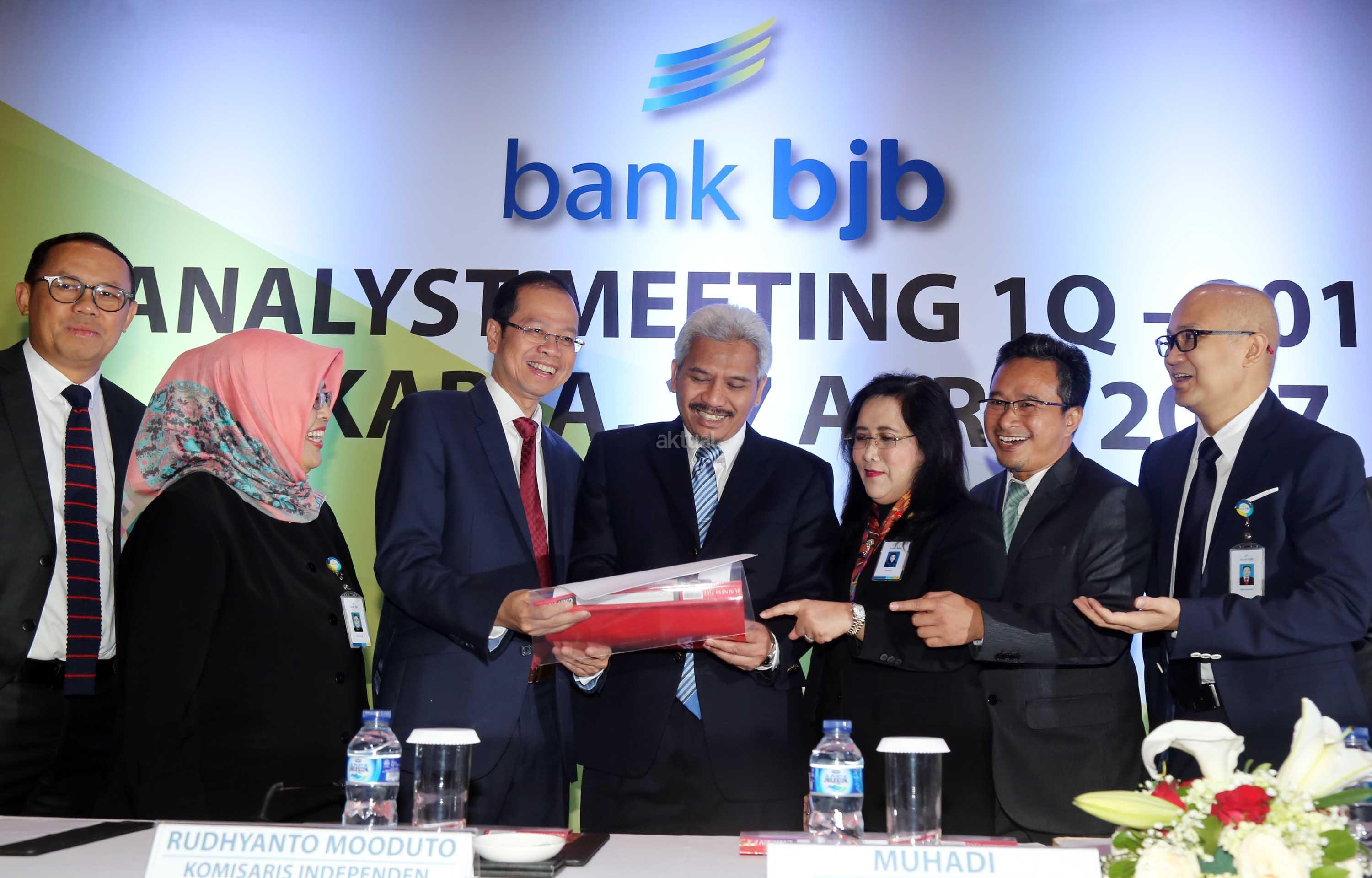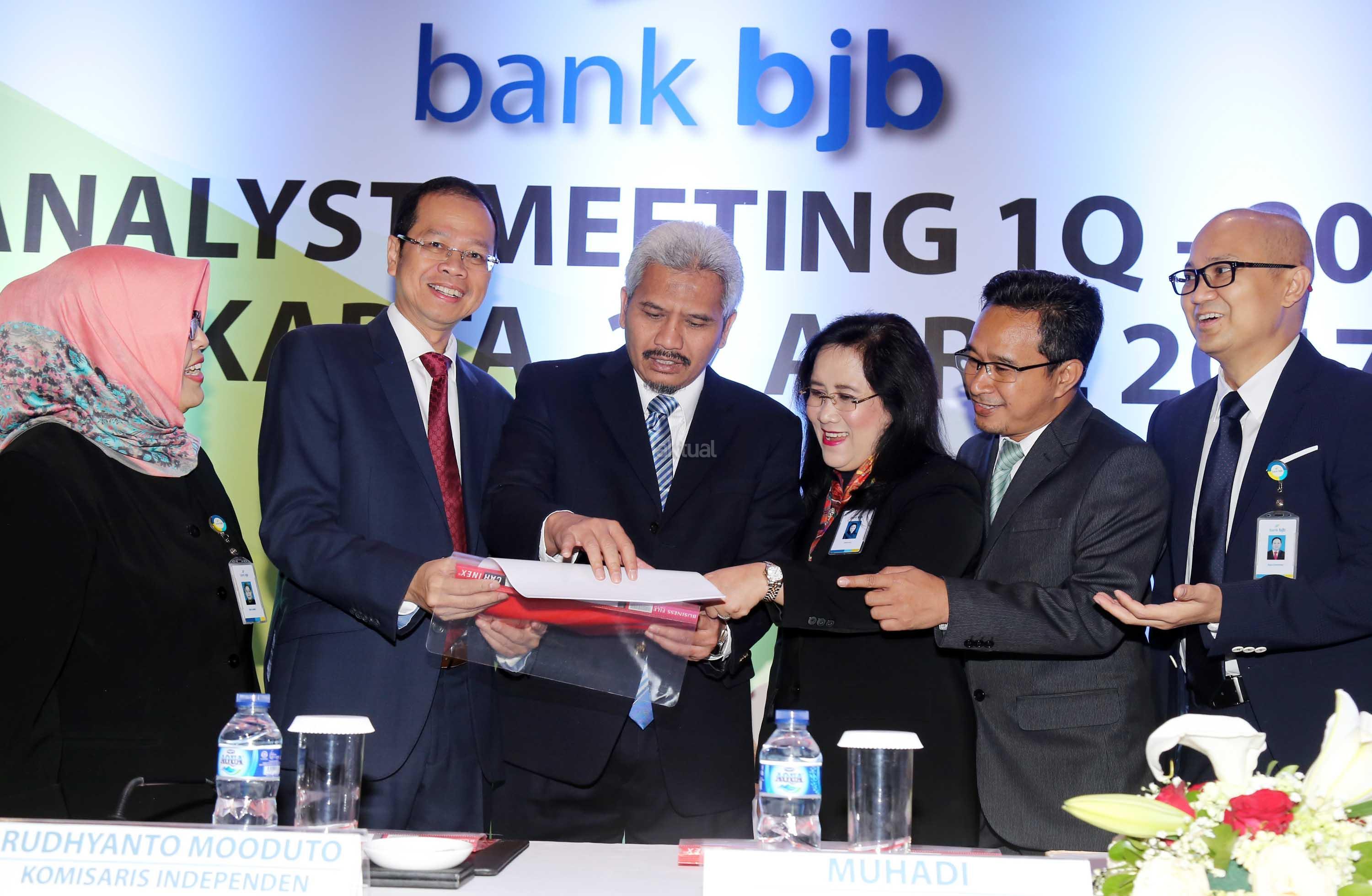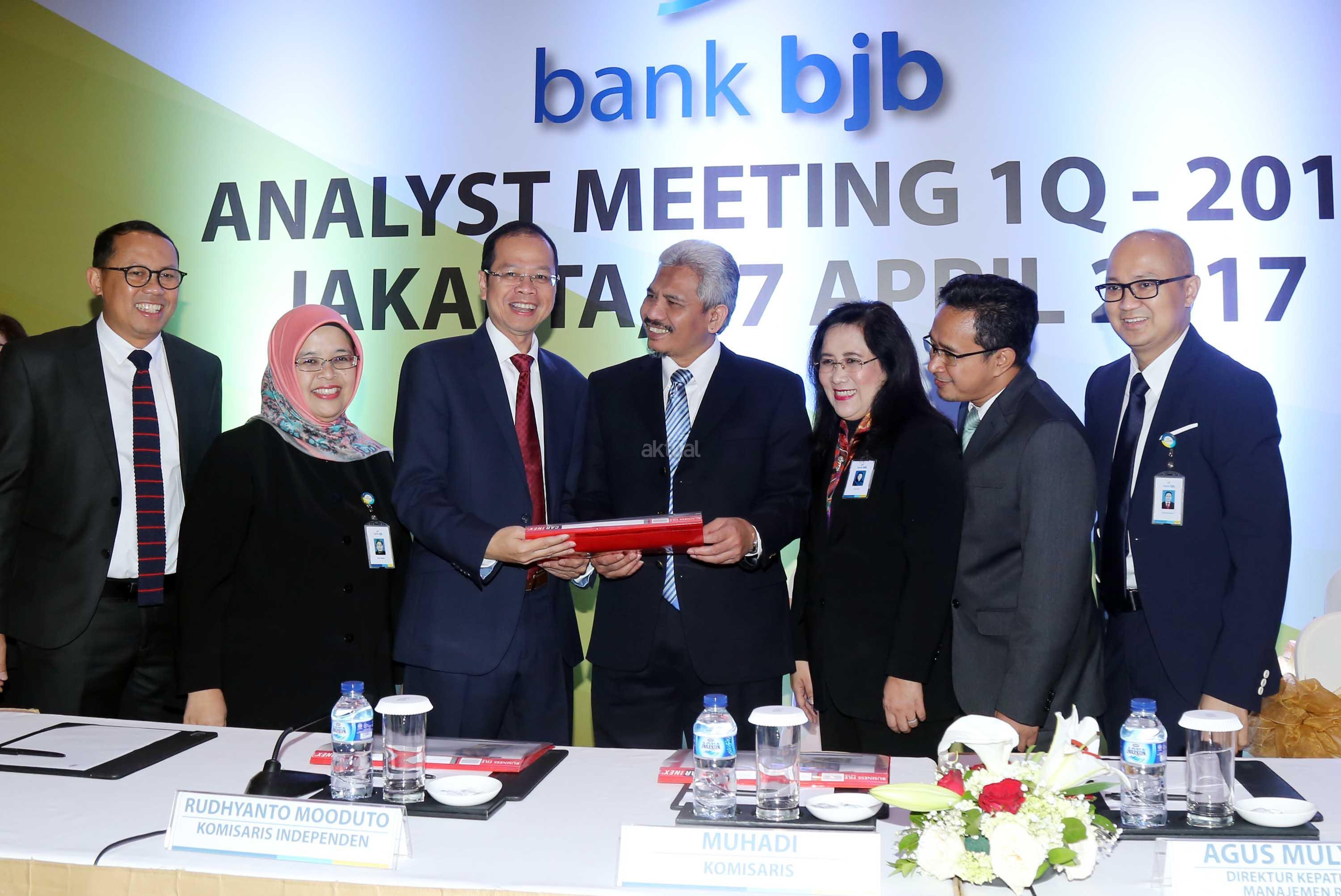 Direktur Utama Bank BJB Ahmad Irfan (tengah) didampingi jajaran direksi berbincang sebelum memaparkan laporan kinerja di JAkarta, KAmis (27/4). Bank Pembangunan Daerah Jawa Barat dan Banten atau Bank BJB menyebutkan hingga triwulan-I tahun 2017 telah menyalurkan kredit mencapai Rp 62,7 triliun, semua segmen kredit mengalami pertumbuhan dibandingkan periode sama tahun sebelumnya. Pertumbuhan kredit yang cukup baik ini diimbangi dengan keberhasilan bank BJB menjaga rasio kredit bermasalah (NPL) di level 1,62 persen atau jauh lebih baik dibandingkan triwulan I tahun 2016 yang sebesar 2,84 persen. AKTUAL/Tino Oktaviano