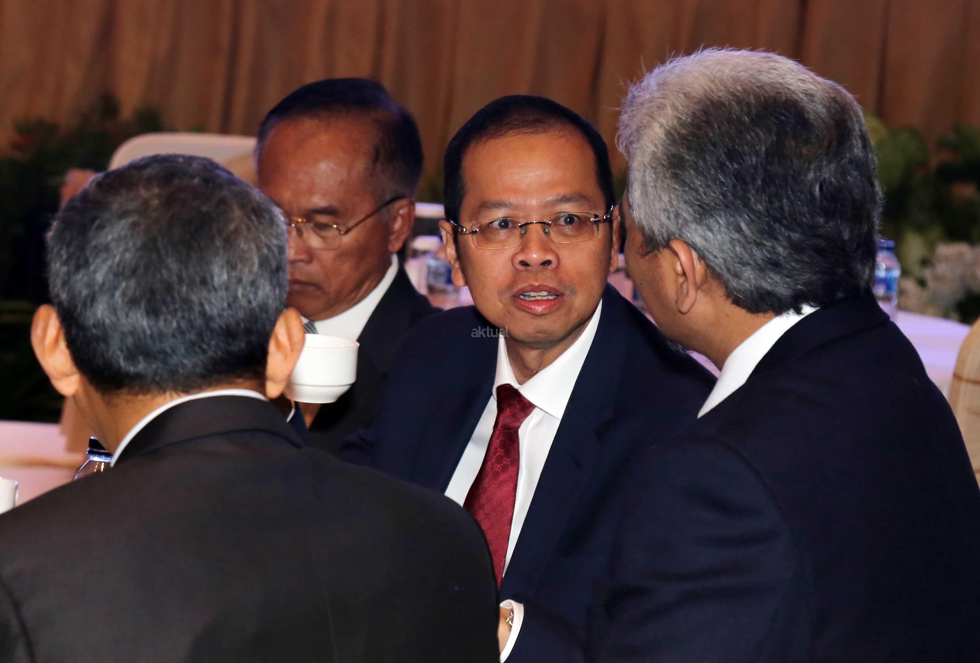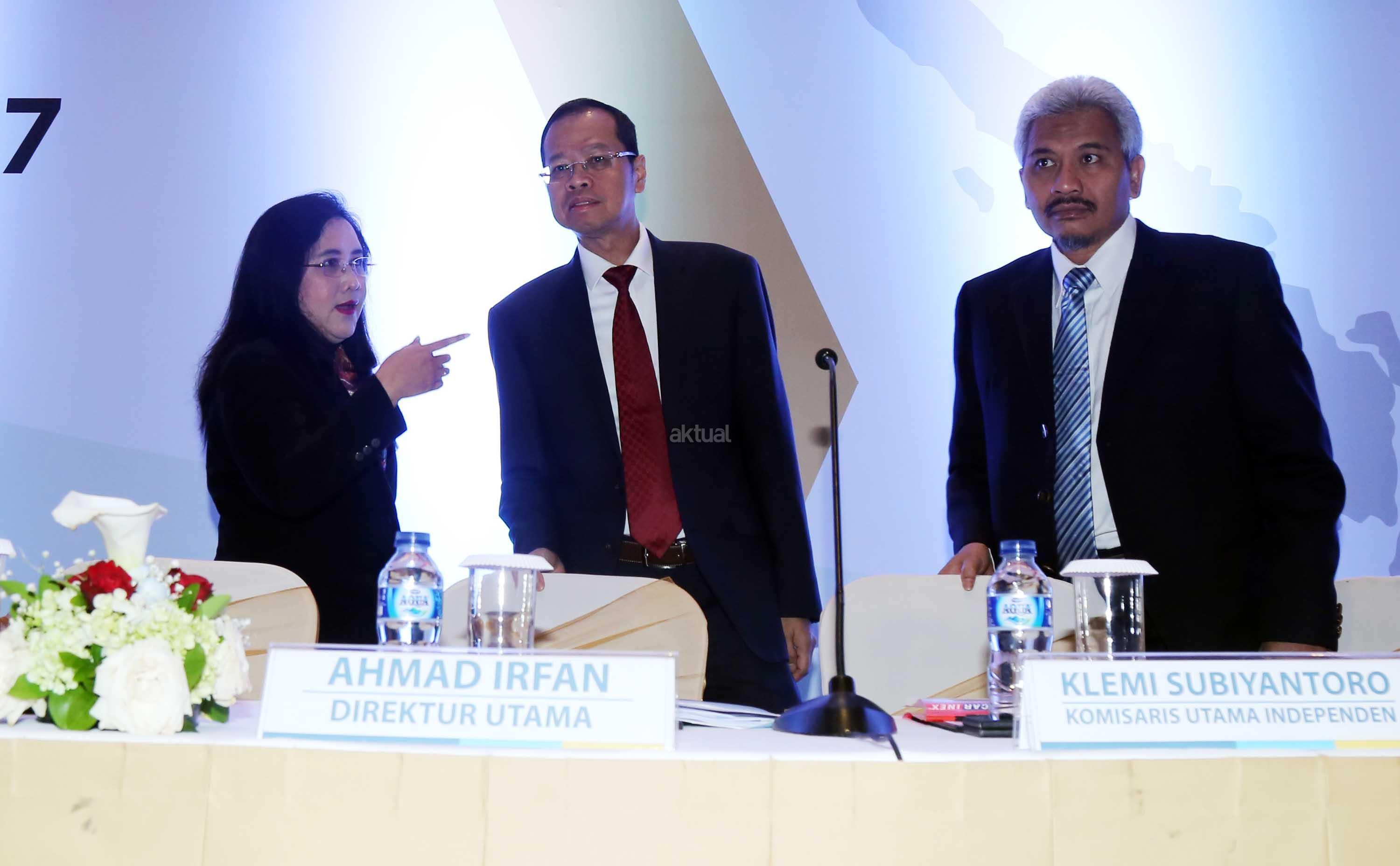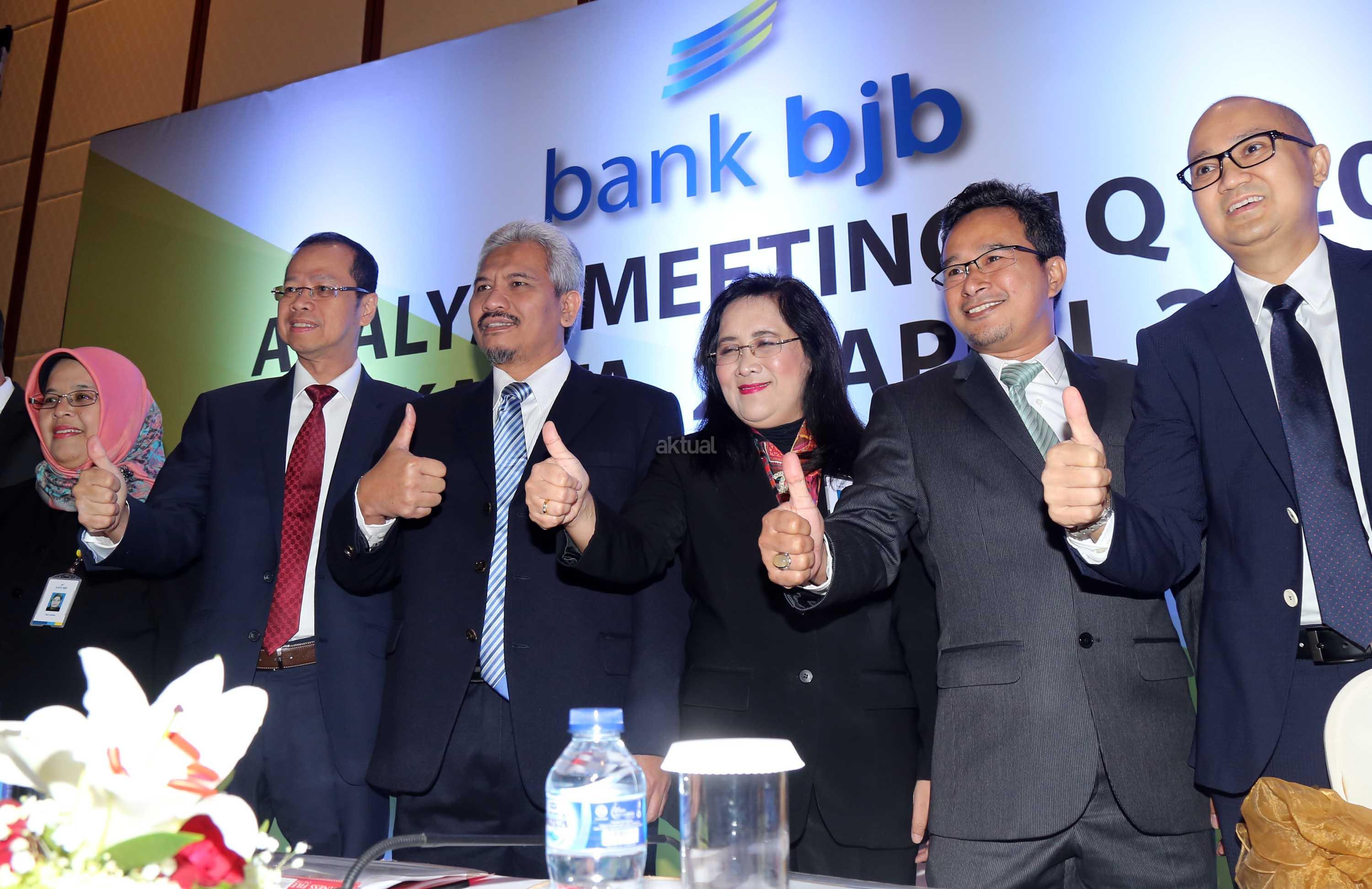 Direktur Utama Bank BJB Ahmad Irfan (tengah) didampingi jajaran direksi berbincang sebelum memaparkan laporan kinerja di JAkarta, KAmis (27/4). Bank Pembangunan Daerah Jawa Barat dan Banten atau Bank BJB menyebutkan hingga triwulan-I tahun 2017 telah menyalurkan kredit mencapai Rp 62,7 triliun, semua segmen kredit mengalami pertumbuhan dibandingkan periode sama tahun sebelumnya. Pertumbuhan kredit yang cukup baik ini diimbangi dengan keberhasilan bank BJB menjaga rasio kredit bermasalah (NPL) di level 1,62 persen atau jauh lebih baik dibandingkan triwulan I tahun 2016 yang sebesar 2,84 persen. AKTUAL/Tino Oktaviano