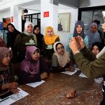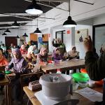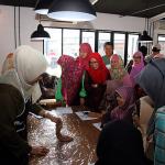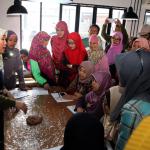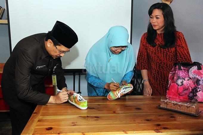 Presiden Direktur Blue Bird Group Holding yang juga sebagai Koordinator Program Blue Bird Peduli Noni Purnomo (kanan) menyaksikan Istri Wakil Wali Kota Bandung, Siti Muntamah (Tengah), dan Kepala Dinas Koperasi Eric Mohamad menandatangani sepatu hasil buatan dari perempuan dan anak muda serta istri-istri pengemudi yang tergambung dalam Kartini Blue Bird di Bandung, Jumat (28/10). Sambut Sumpah Pemuda melalui program CSR, Blue Bird Bandung berbagi kreasi dan berwirausaha kepada muda mudi dan istri-istriipengemudi. AKTUAL/HO