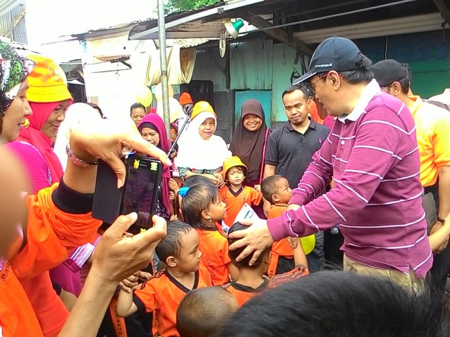 Djarot pun setelah memperkenalkan diri langsung bmenuju ke lokasi acara dia menyempatkan diri bercengkrama dan nyanyi bareng murid Pendidikan Anak Usia Dini yang ada wilayah itu.
