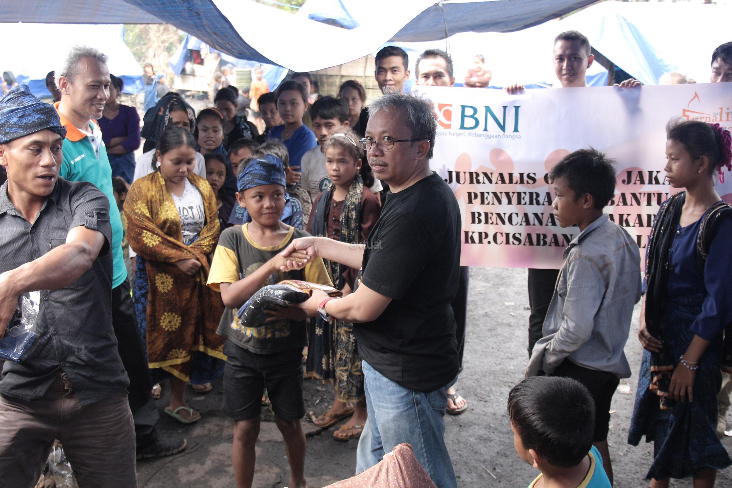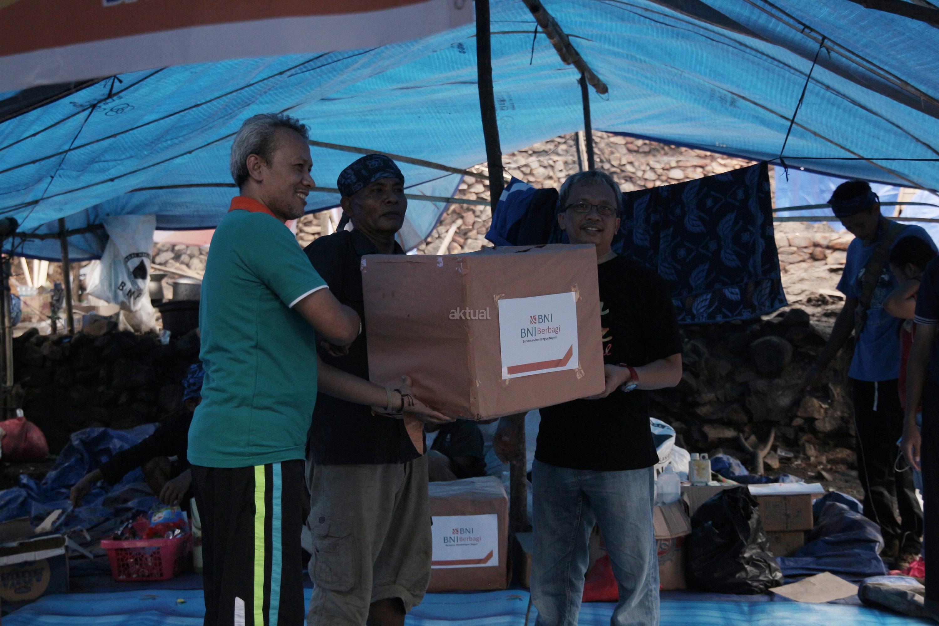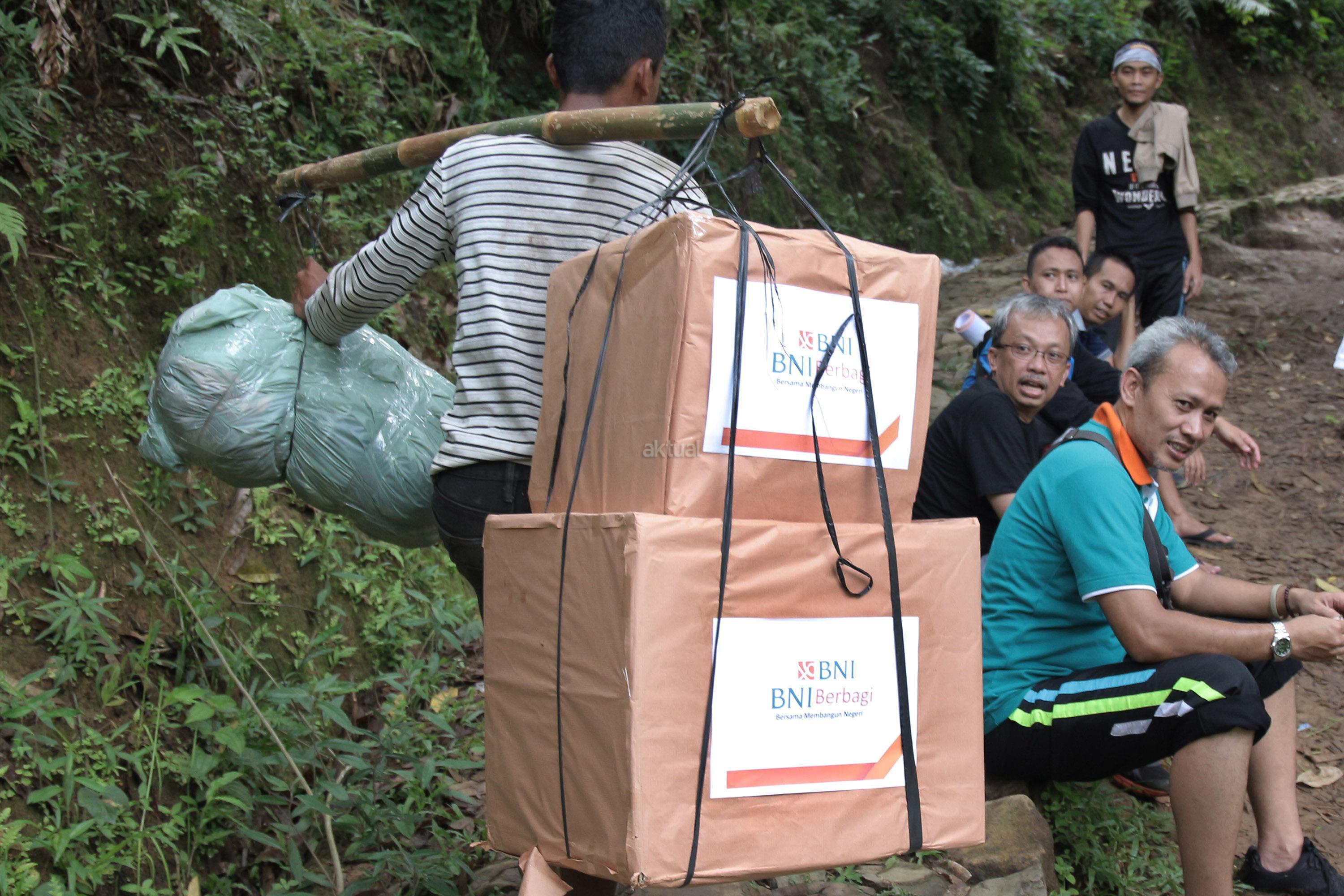 Pemimpin Bidang Pemasaran Bisnis BNI Serang Yudy Dwi Prio (kiri) bersama Pemimpin Bidang Pembinaan Pelayanan BNI Serang Herdianto Sediono (kanan) menyerahkan bantuan kepada warga Baduy saat kegiatan BNI Berbagi di Kampung Cisaban II, Desa Kanekes, Banten, Kamis (01/6). BNI memberikan bantuan senilai 100juta berupa barang perabotan rumah tangga dan pakaian adat. AKTUAL/Tino Oktaviano4