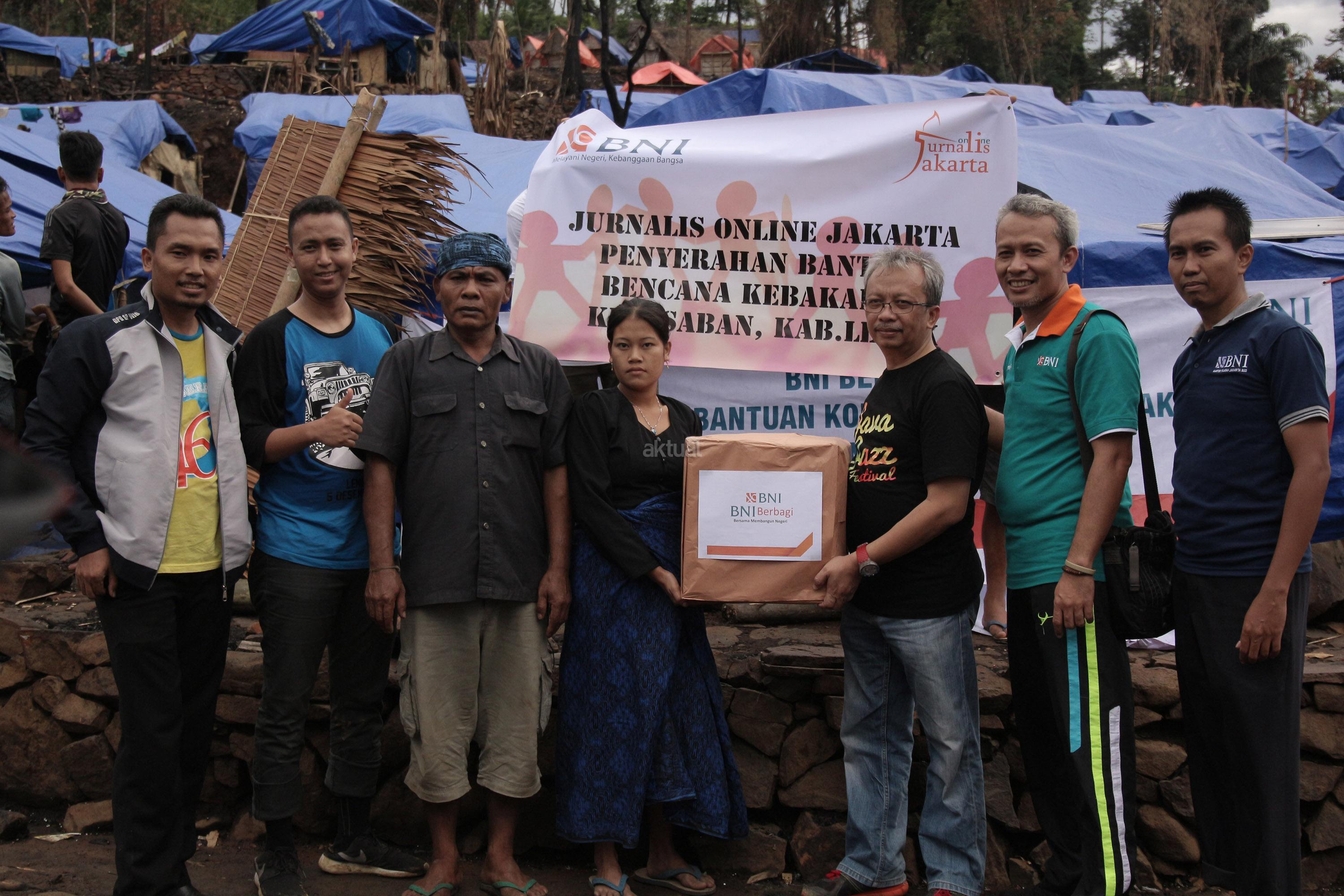 Pemimpin Bidang Pembinaan Pelayanan BNI Serang Herdianto Sediono (tiga dari kanan) bersama Pemimpin Bidang Pemasaran Bisnis BNI Serang Yudy Dwi Prio (dua dari kanan) menyerahkan bantuan kepada warga Baduy saat kegiatan BNI Berbagi di Kampung Cisaban II, Desa Kanekes, Banten, Kamis (01/6). BNI memberikan bantuan senilai 100juta berupa barang perabotan rumah tangga dan pakaian adat. AKTUAL/Tino Oktaviano