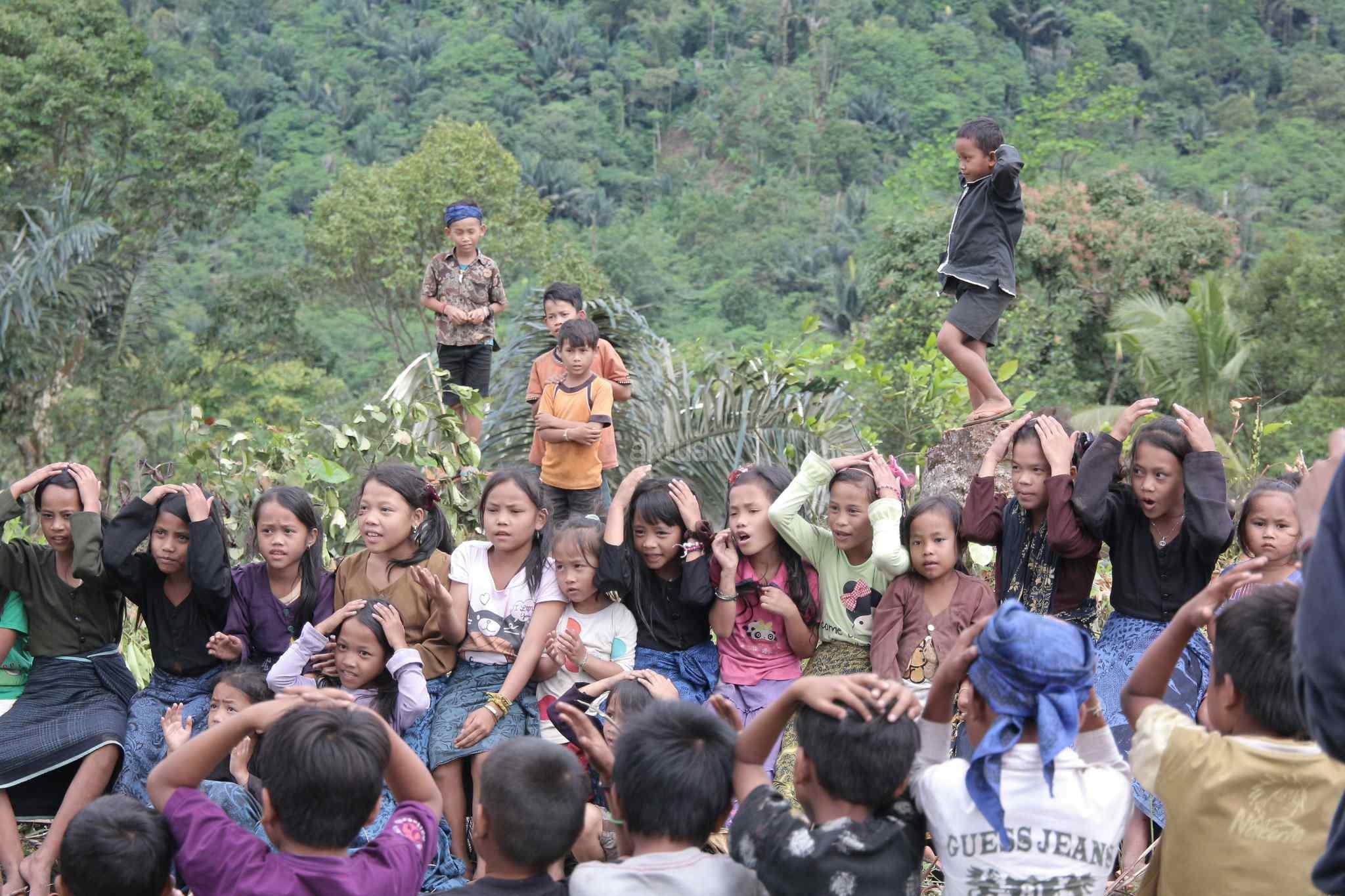 Ekspresi anak anak saat acara bantuan kepada warga Baduy saat kegiatan BNI Berbagi di Kampung Cisaban II, Desa Kanekes, Banten, Kamis (01/6). BNI memberikan bantuan senilai 100juta berupa barang perabotan rumah tangga dan pakaian adat. AKTUAL/Tino Oktaviano