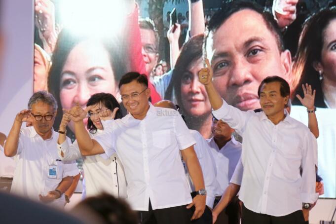 Direktur Utama BNI Achmad Baiquni memberikan mengacungkan jempol dengan jajaran direksi dan komisaris saat acara Celebrate Achievement 2016 & Embrasing Digital Financial Institution BNI di kantor pusat BNI, Jakarta, Kamis (22/12/2016). Pada kesempatan ini, BNI melakukan Launching BNI New Style, BNI New Template dan e-Absensi yang menjadi simbol pertumbuhan budaya yang diharapkan akan mendukung langkah-langkah BNI sebagai Digital Financial Institution. AKTUAL/Tino Oktaviano