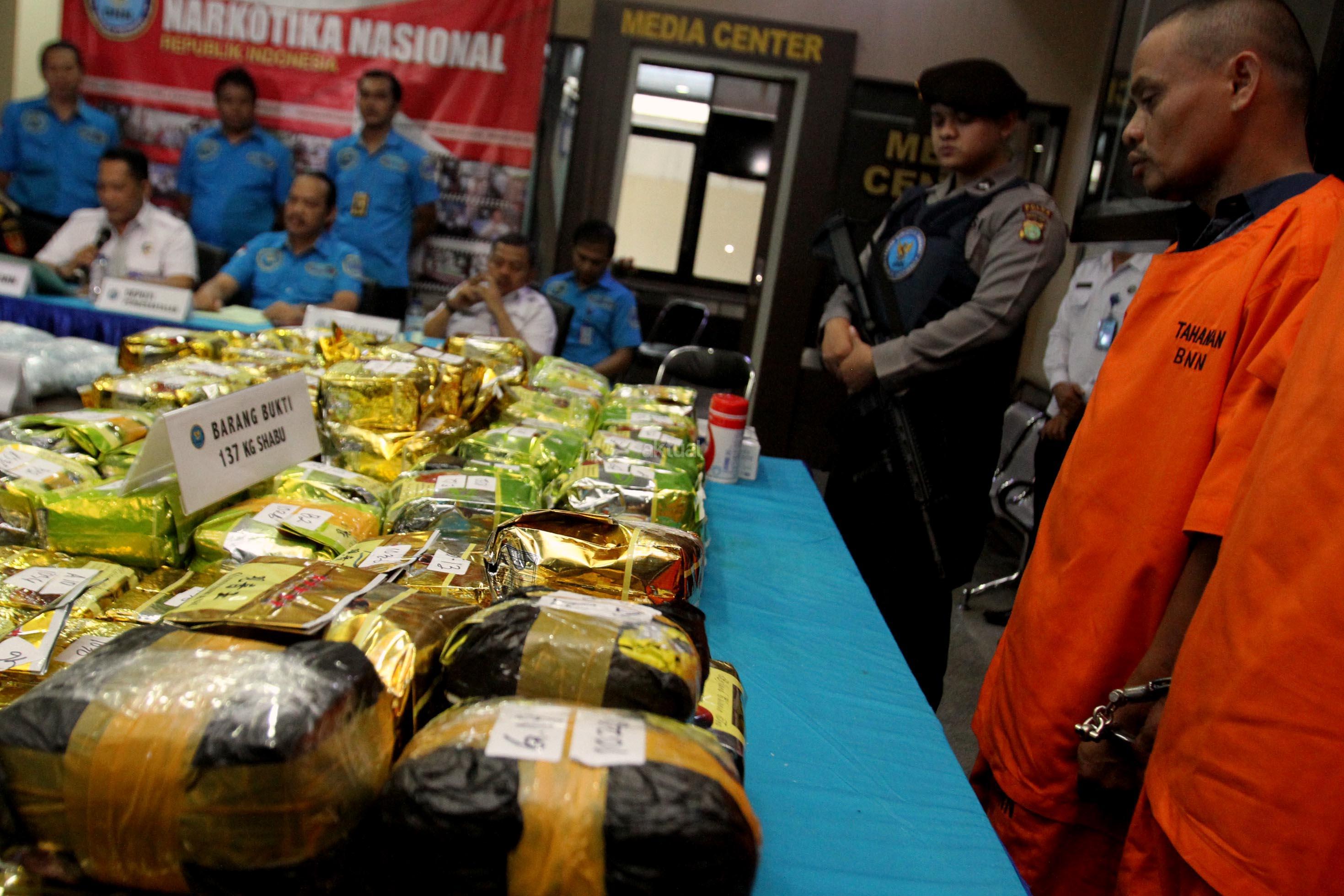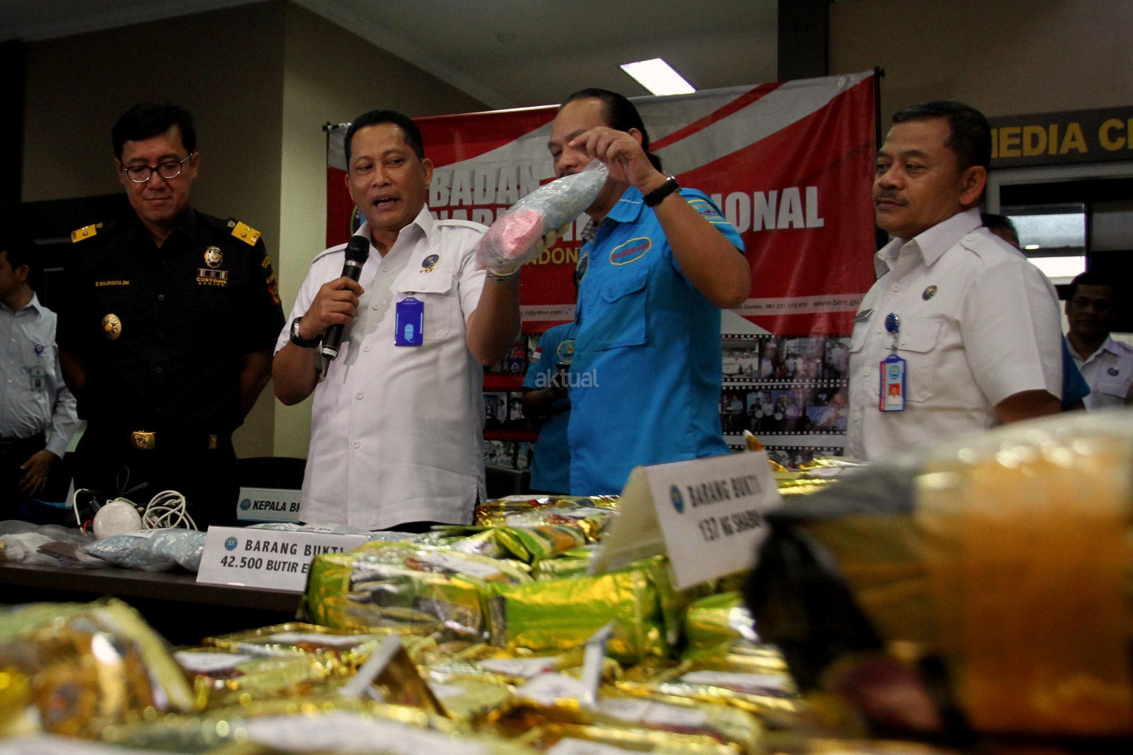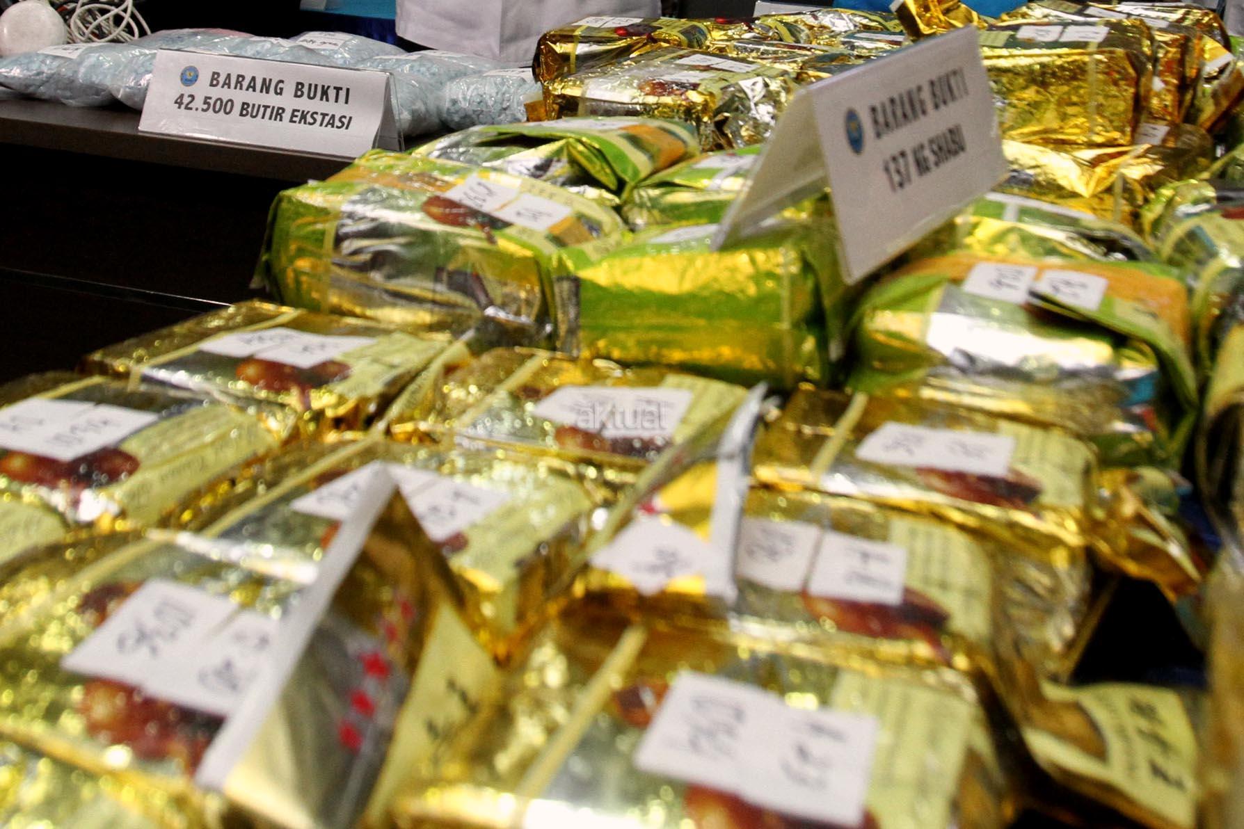 Dalam jumpa persnya BNN bersama Bea dan Cukai berhasil membongkar jaringan peredaran gelap narkotika yang beroperasi di perairan Indonesia dan tim gabungan berhasil mengamankan 137.692 gram sabu dan 42500 butir pil ekstasi di pantai Ujungcuram, Aceh Timur. AKTUAL/Munzir