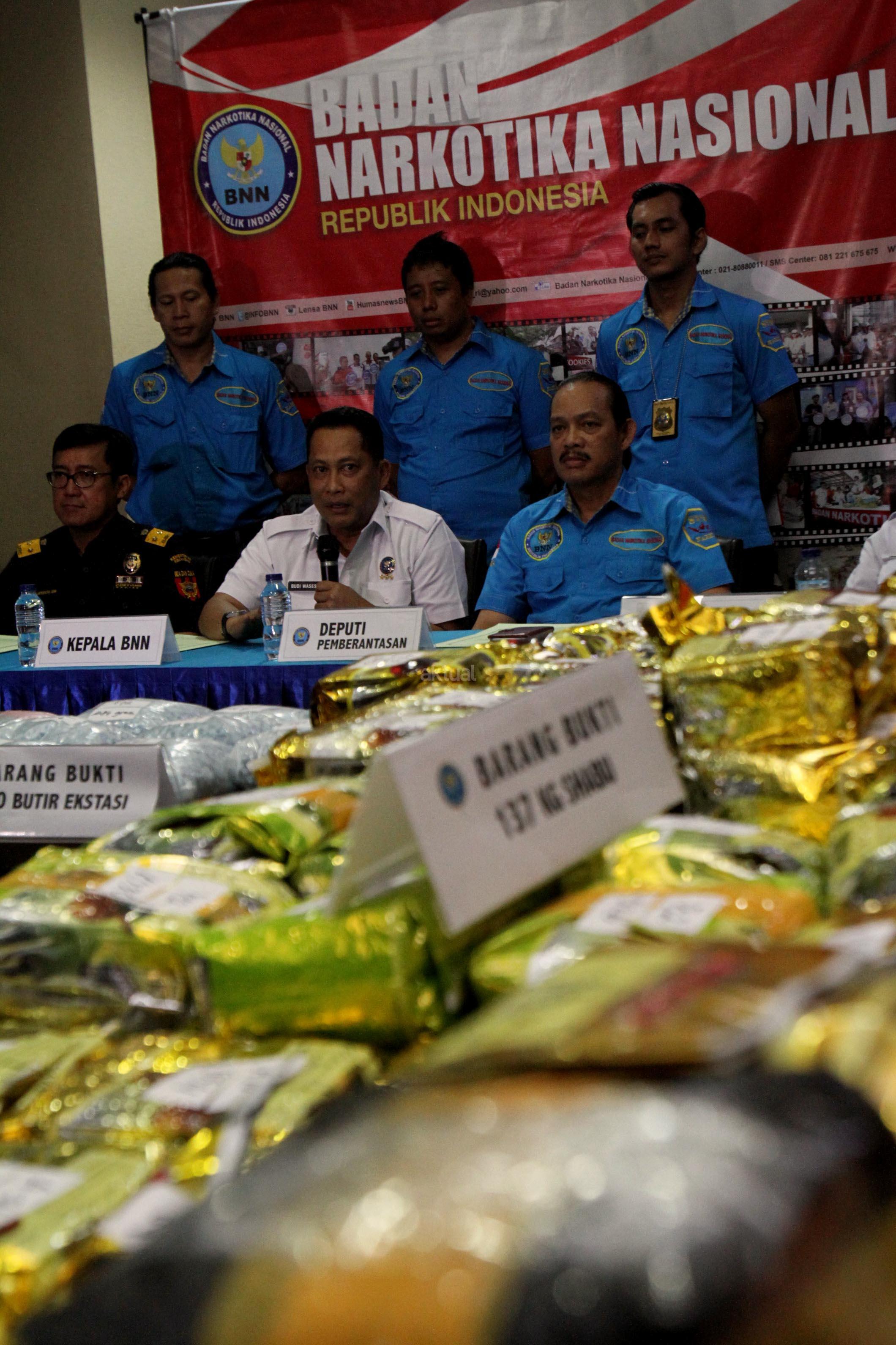Kepala BNN Komjen Pol Budi Waseso (tengah) saat menunjukan barang bukti narkotika saat menggelar jumpa pers di kantor BNN, Jakarta, Rabu, (27/9/2017).Dalam jumpa persnya BNN bersama Bea dan Cukai berhasil membongkar jaringan peredaran gelap narkotika yang beroperasi di perairan Indonesia dan tim gabungan berhasil mengamankan 137.692 gram sabu dan 42500 butir pil ekstasi di pantai Ujungcuram, Aceh Timur. AKTUAL/Munzir