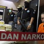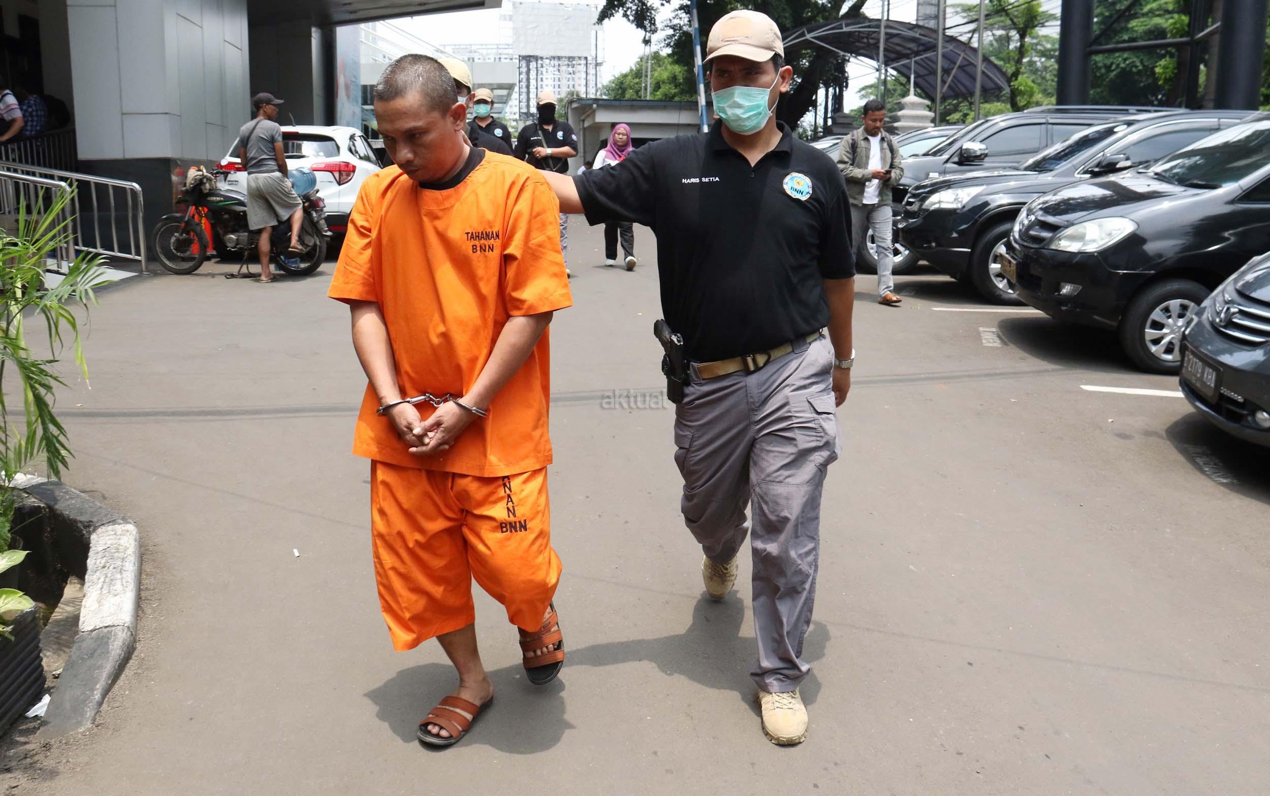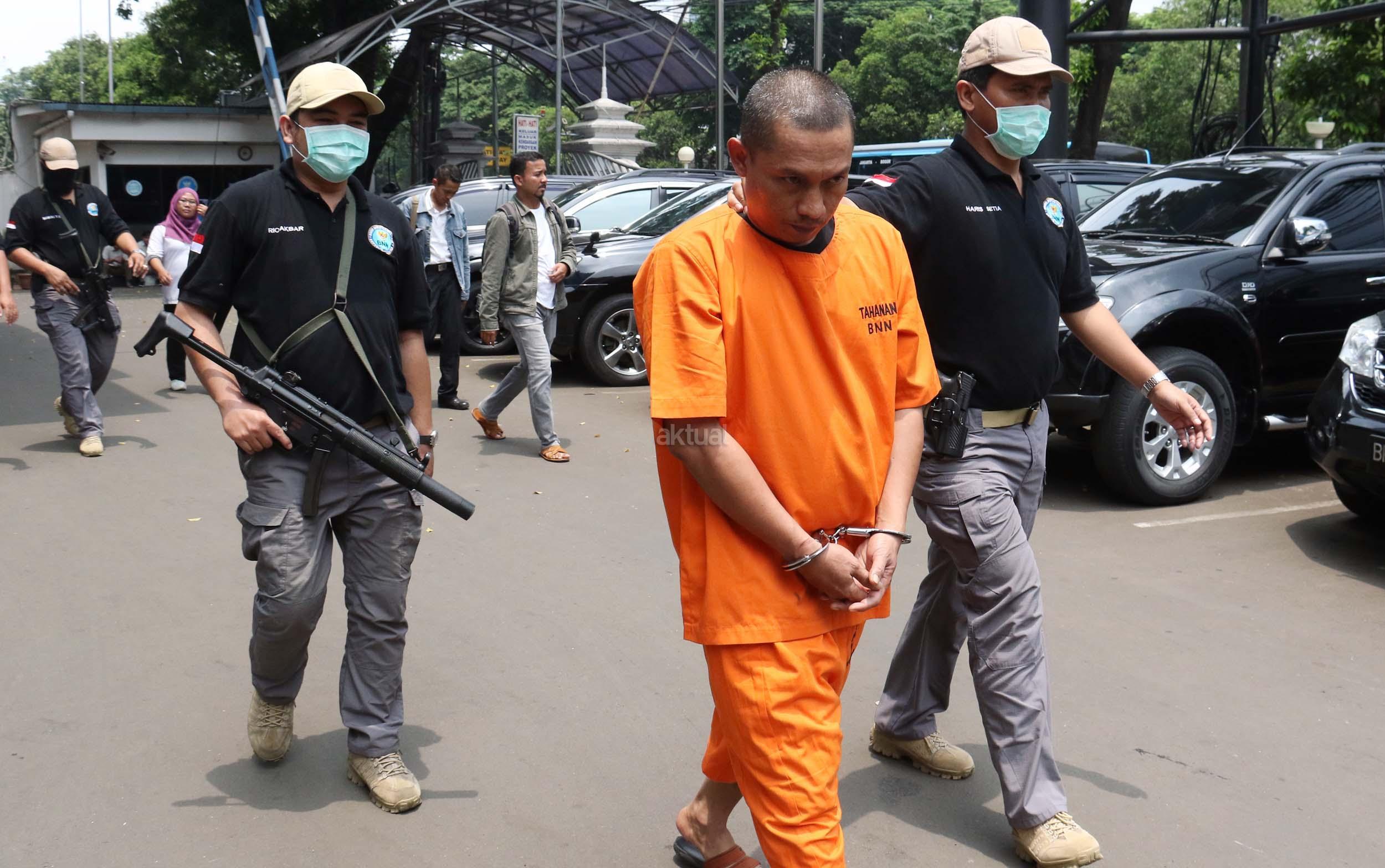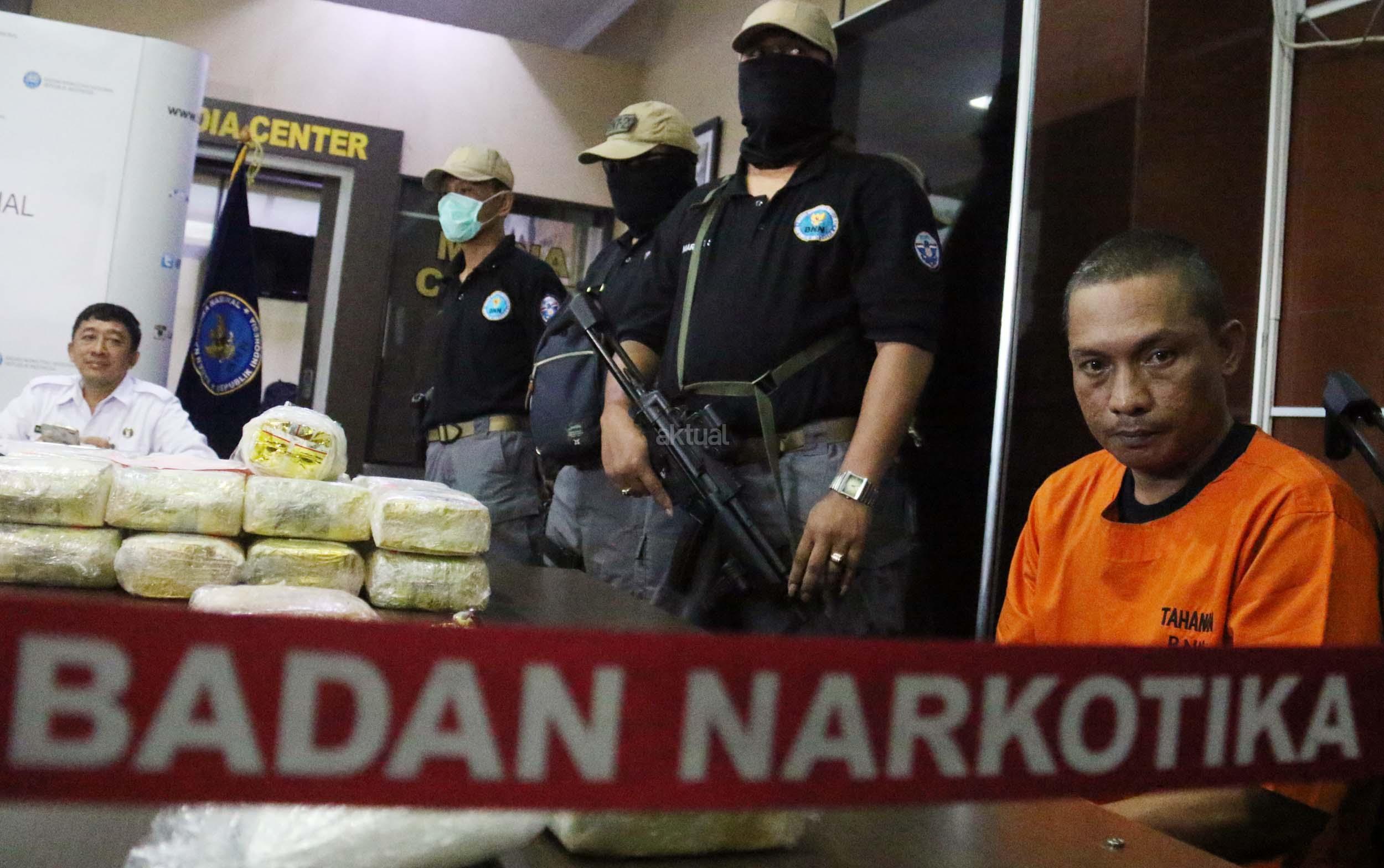 Tersangka dan barang bukti dihadirkan saat rilis kasus narkotika jenis Sabu jaringan Internasional di Kantor BNN, Jakarta, Senin (27/2/2017). Badan Narkotika Nasional (BNN) menggagalkan penyeludupan sabu sebanyak 32 kg asal Malaysia di dua lokasi di Medan Sumatera Barat dengan mengamankan 2 orang pelaku berinisial ABS (29) dan BEP (37) yang berperan sebagai kurir sekaligus pengedar. AKTUAL/Munzir