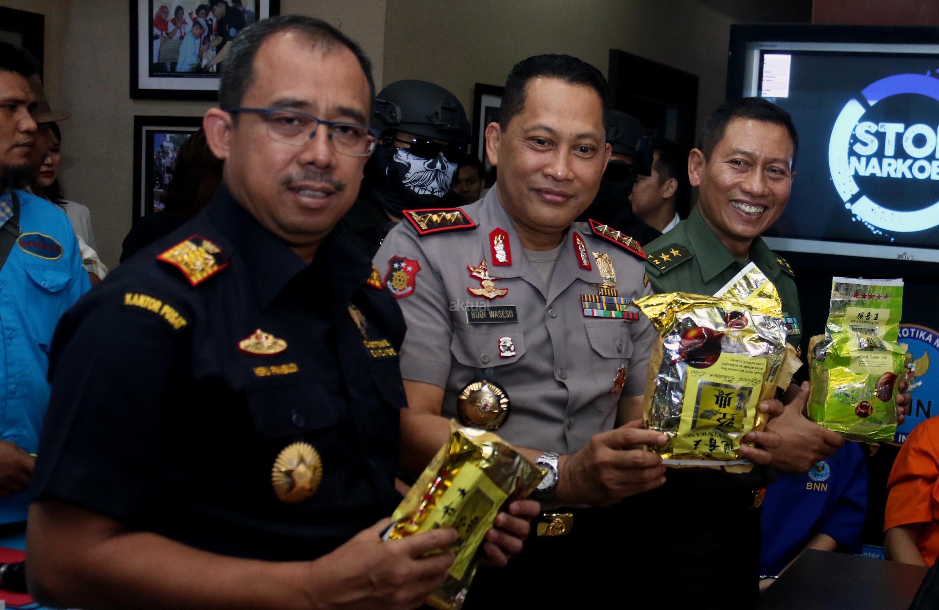 Dirjen Bea dan Cukai Heru Pambudi (kiri) , Kepala BNN Komjen Pol Budi Waseso (tengah), Kapuspen TNI Mayjen Wuryanto (kanan), saat menunjukan barang bukti shabu dalam jumpa persnya di kantro BNN, Jakarta, Selasa (12/9/2017). Dalam jumpa persnya BNN bersama Satgas Pamtas TNI dan Bea dan Cukai berhasil menggagalkan upaya penyeludupan narkotika dari Malaysia ke Indonesia seberat 10,39 kg dan uang tunai sebanya Rp. 1,6 Miliar. AKTUAL/Munzir