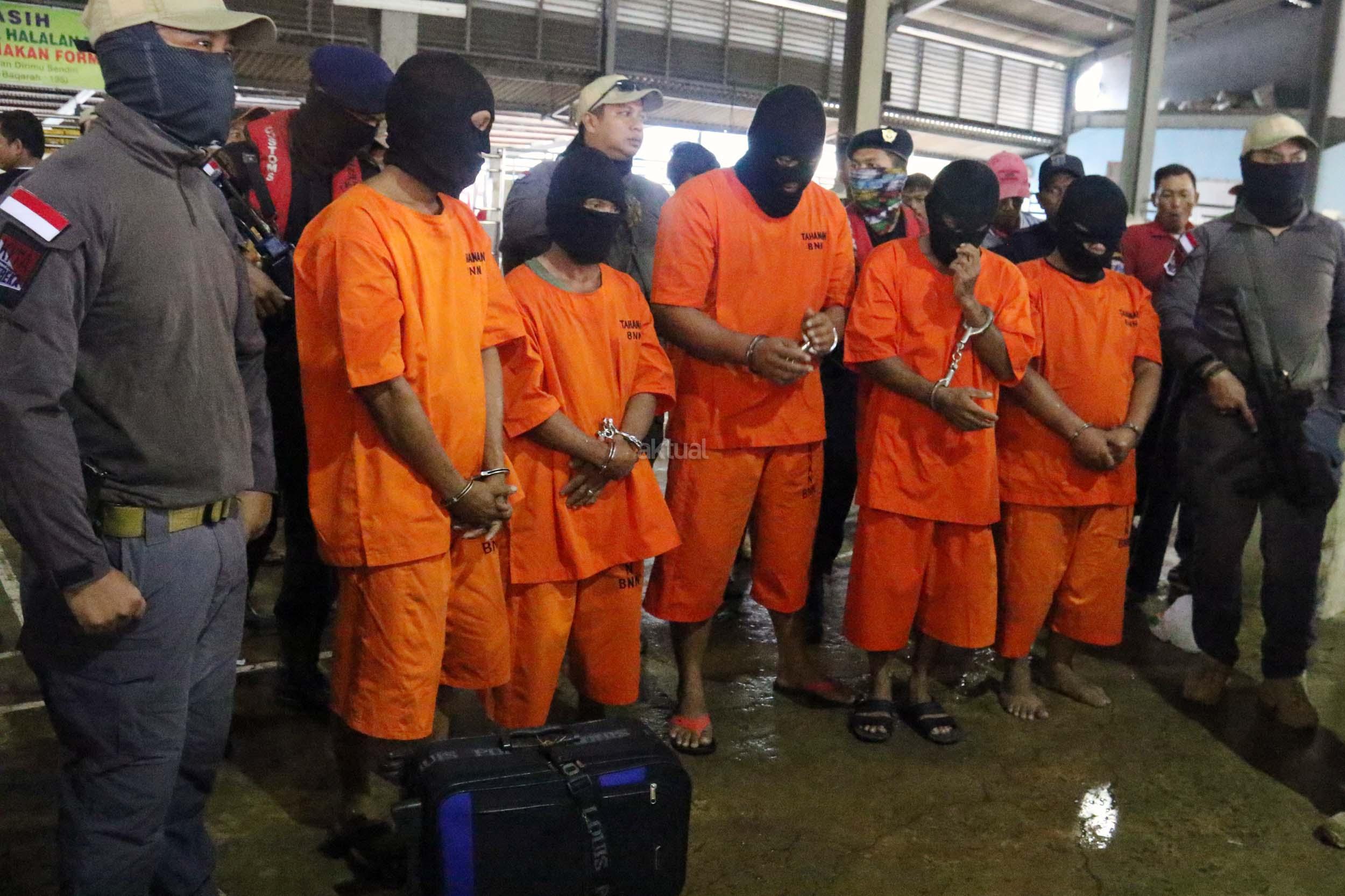 Petugas gabungan BNN dan Bea Cukai berhasil mengamankan lima orang anak buah kapal yang membawa 13,56 kg methampetamine (sabu) serta satu orang warga negara Malaysia tewas saat penangkapan karena melakukan perlawanan, AKTUAL/Munzir.