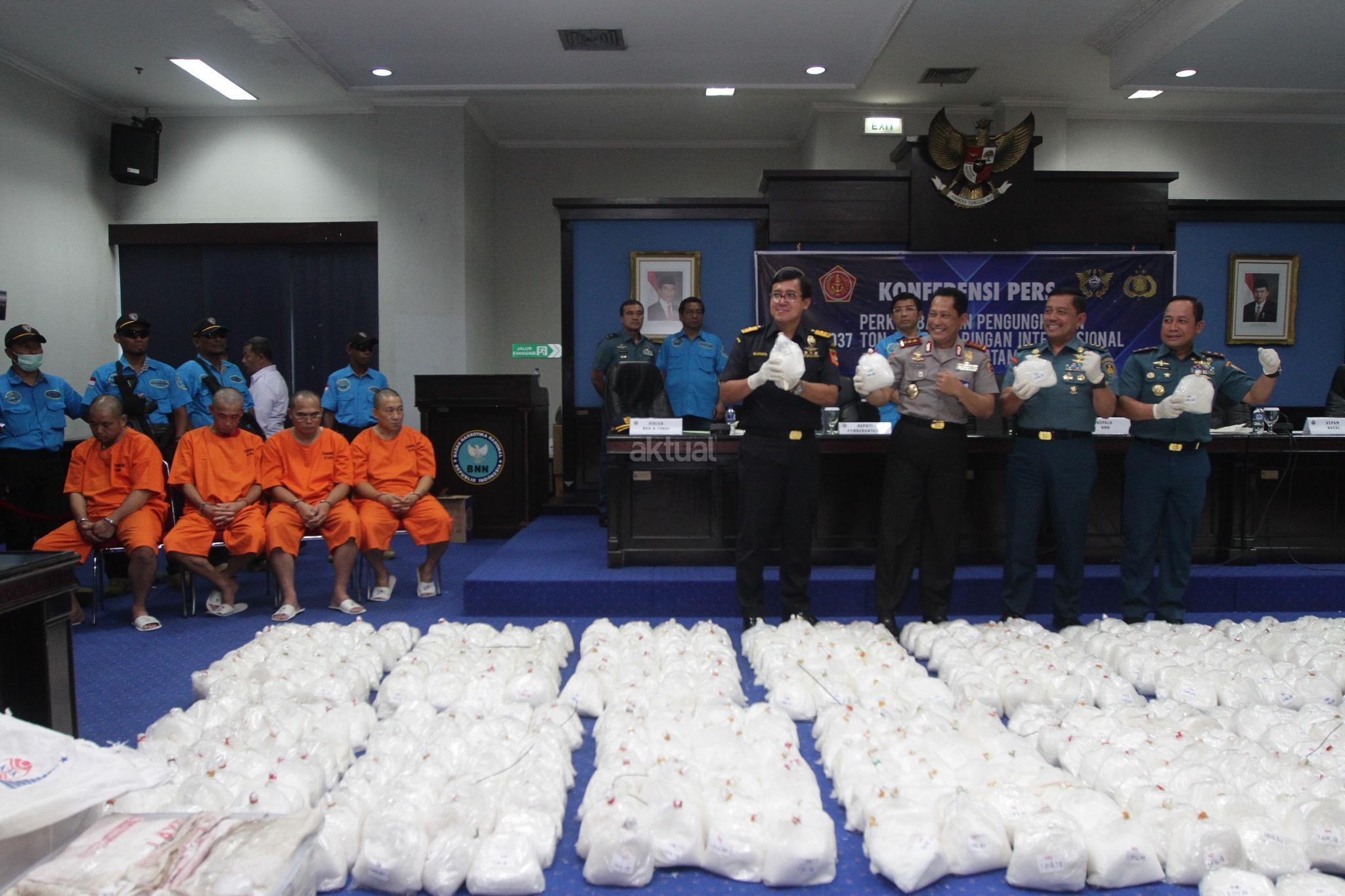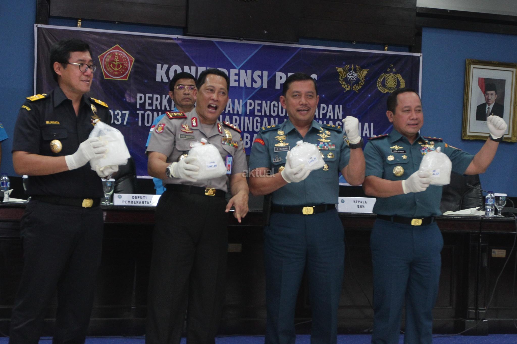 Kepala Badan Narkotika Nasional (BNN) Komjen Budi Waseso bersama Asisten Pengamanan (Aspam) Kepala Staf Angkatan Laut Laksamana Muda TNI Suprianto Irawandan Panglima Armada Barat Laksamana Muda TNI Aan Kurnia merilis barang bukti narkotika golongan I jenis sabu di Kantor Pusat BNN, Jakarta, Selasa (20/2). TNI Angkatan Laut bekerjasama dengan BNN berhasil mengamankan 1037,5 Kg sabu di perairan Batam, Kepulauan Riau serta mengamankan 4 orang tersangka asal Taiwan yang merupakan jaringan Narkotika Internasional. AKTUAL/Tino Oktaviano