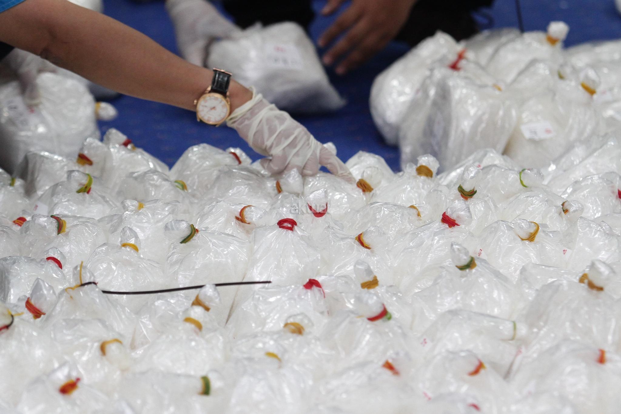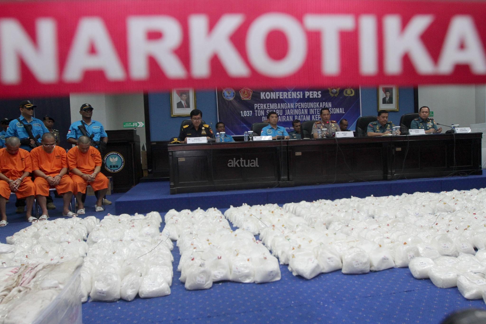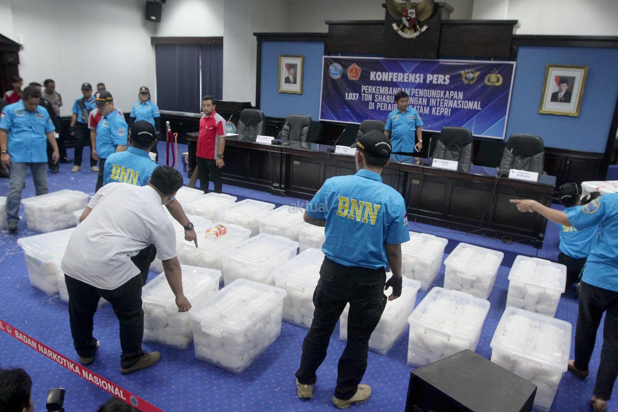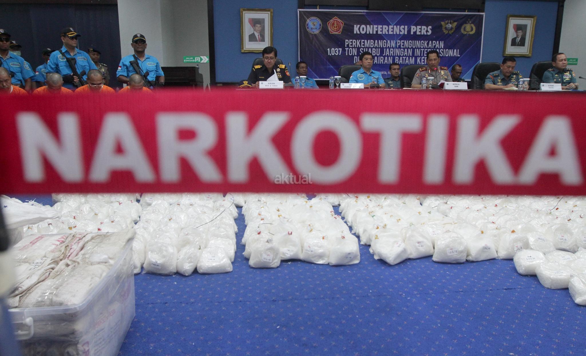 TNI Angkatan Laut bekerjasama dengan BNN berhasil mengamankan 1037,5 Kg sabu di perairan Batam, Kepulauan Riau serta mengamankan 4 orang tersangka asal Taiwan yang merupakan jaringan Narkotika Internasional. AKTUAL/Tino Oktaviano