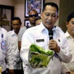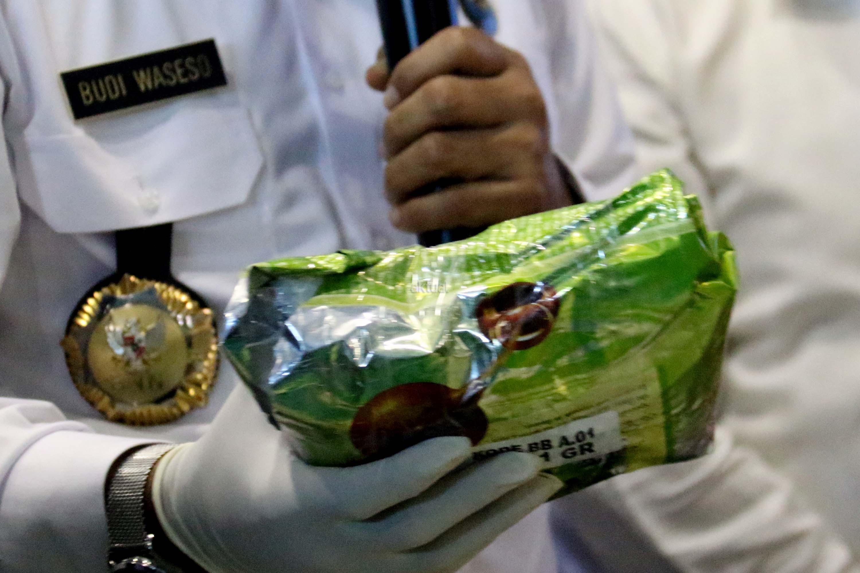 Kepala BNN Komjen Pol Budi Waseso menunjukan barang bukti narkotika kelas 1 berjenis sabu saat menggelar jumpa persnya di kantor BNN, Cawang, Jakarta, Senin (22/5/2017). Badan Narkotika Nasional berhasil mengungkap jaringan sindikat narkotika internasional Malaysia – Aceh dan Medan dengan barang bukti sabu seberat 25 kg yang dikemas dalam bungkus plastik teh tiongkok yang dimasukan dalam kotak pendingin ikan laut dan berhasil membekuk 5 orang tersangka pada tanggal 14 Mei 2017 lalu.