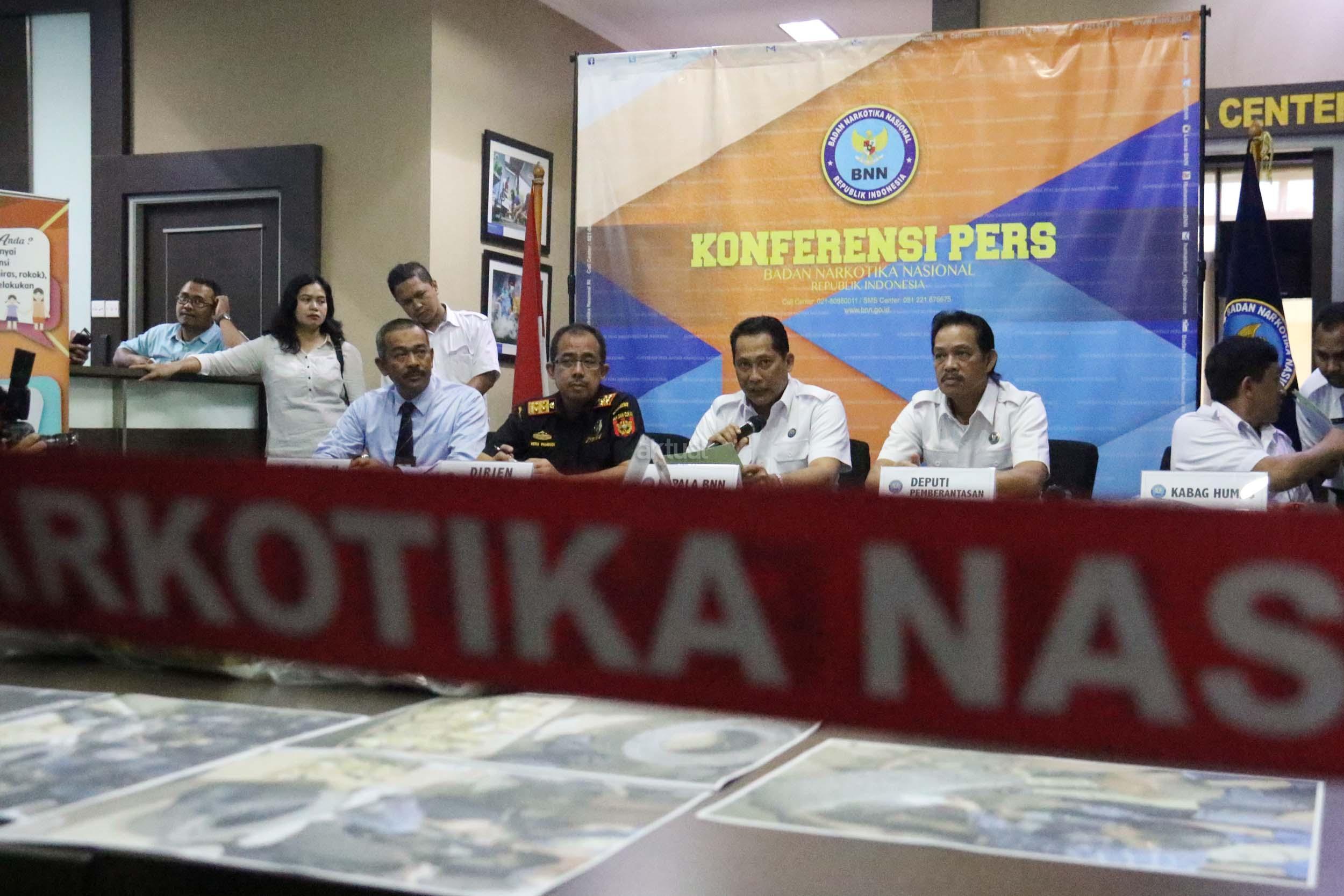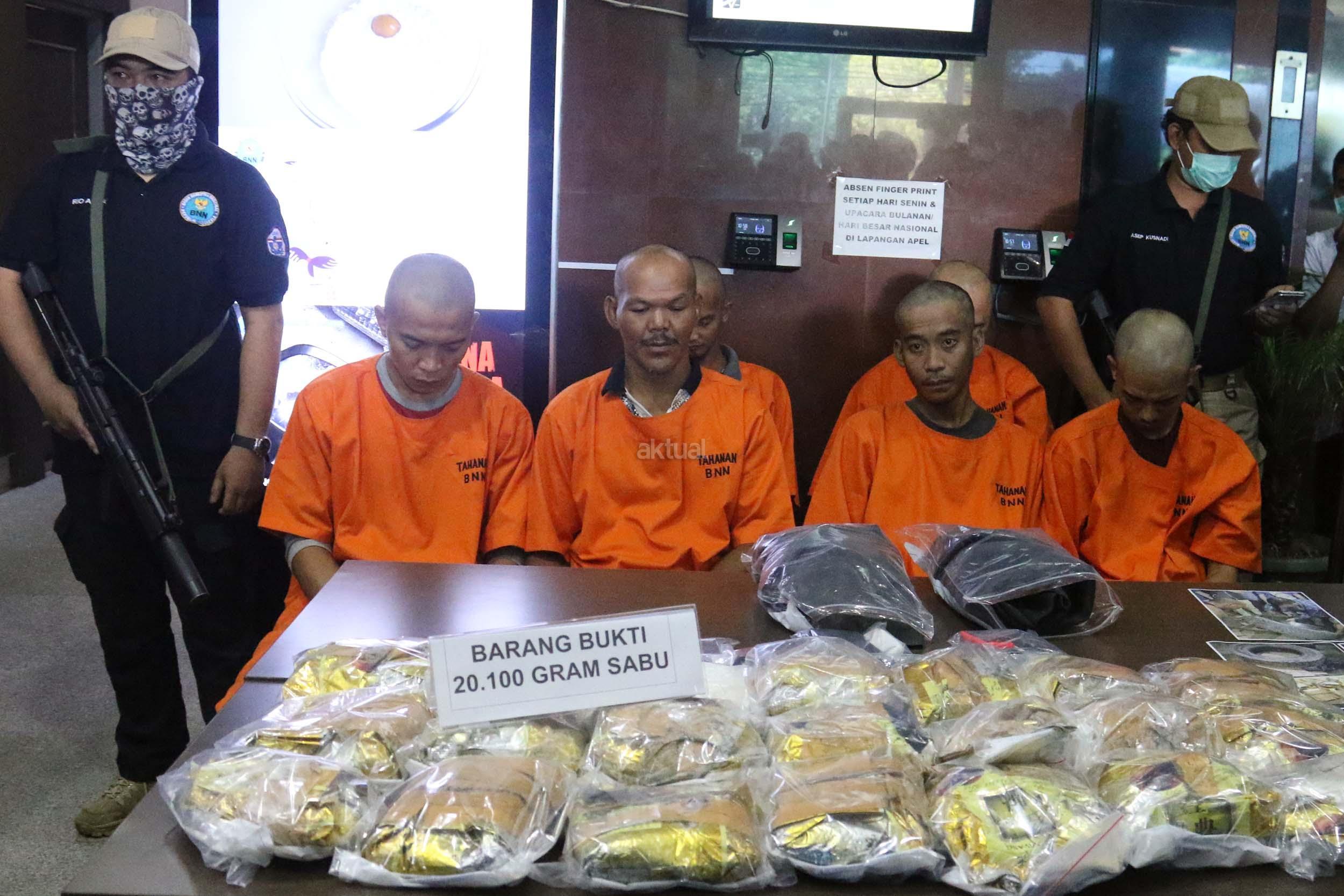 Dalam jumpa persnya Badan Narkotika Nasional (BNN) berhasil mengungkap pengiriman sabu asal Malaysia sebanyak 21 kg melalui perbatasan oleh jaringan lembaga pemasyarakatan (lapas) Pontianak Kalimantan Barat. Petugas mengamankan 6 orang pelaku masing-masing berinsial BW alias Planet, H alias Iyan, GV alias Valen, N alias Nonot, DH alias Mangap dan S alias Ahmad. AKTUAL/Munzir
