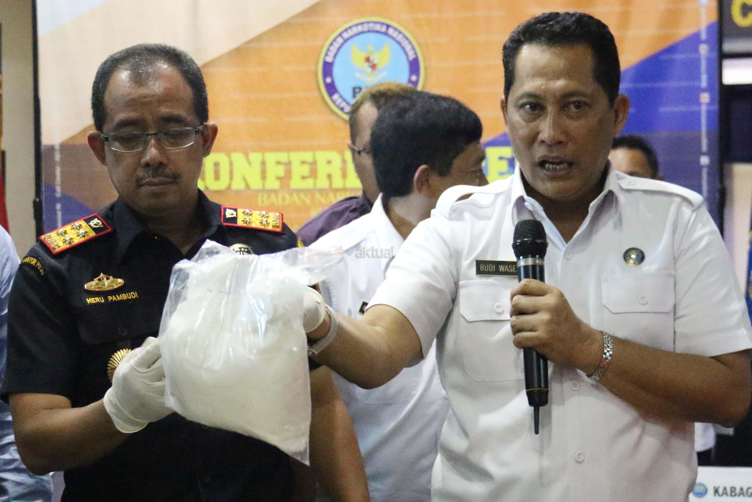 Kepala BNN Kepala BNN Komjen Pol. Budi Waseso (kanan) bersama Dirjen Bea Cukai Heru Pambudi (kiri) menunjuka salah satu barang bukti narkoba berjenis sabu saat jumpa pers di kantor BNN, Jakarta, Rabu (8/2/2017). Dalam jumpa persnya Badan Narkotika Nasional (BNN) berhasil mengungkap pengiriman sabu asal Malaysia sebanyak 21 kg melalui perbatasan oleh jaringan lembaga pemasyarakatan (lapas) Pontianak Kalimantan Barat. Petugas mengamankan 6 orang pelaku masing-masing berinsial BW alias Planet, H alias Iyan, GV alias Valen, N alias Nonot, DH alias Mangap dan S alias Ahmad. AKTUAL/Munzir