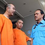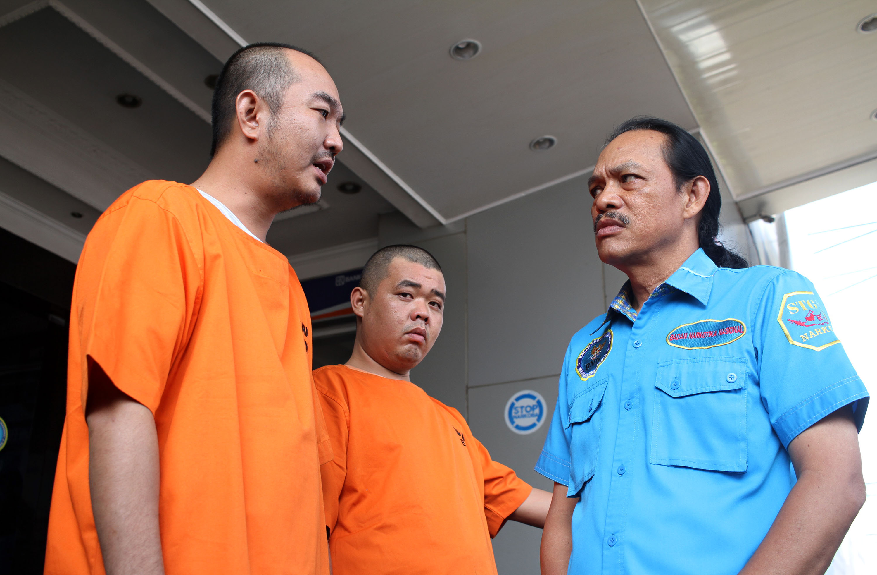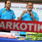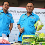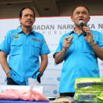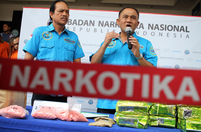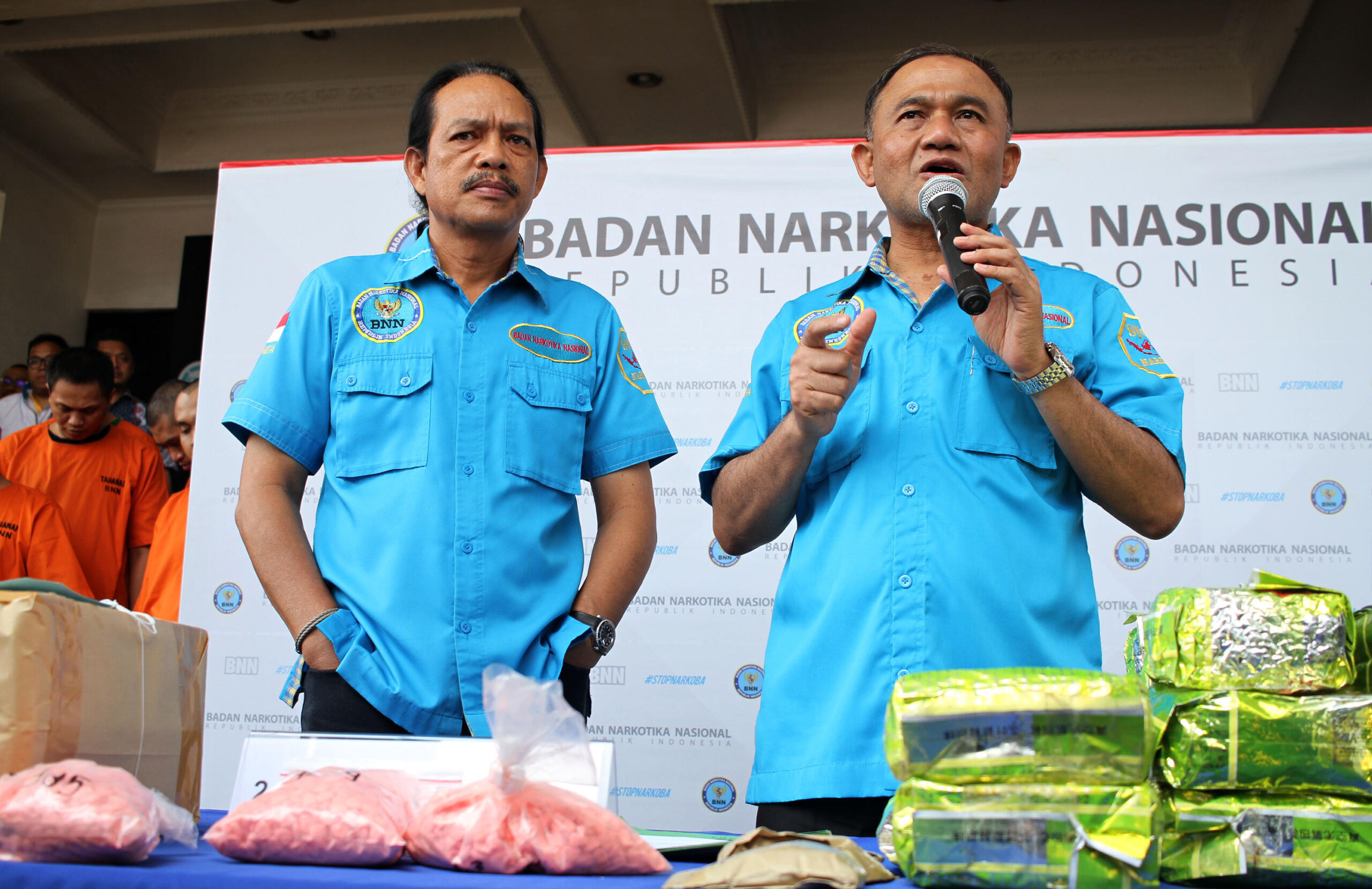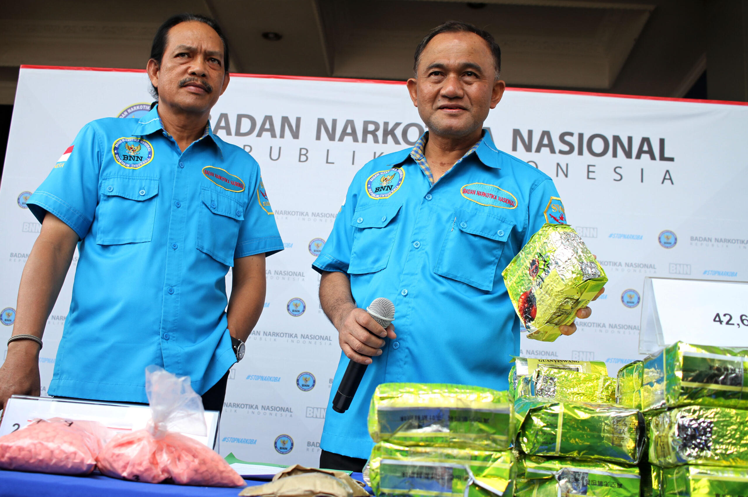 Kepala Badan Narkotika Nasional (BNN) Komjen Pol Heru Winarko (kanan) didampingi Deputi Pemberantasan BNN Irjen Pol Amran Depari (kiri) menunjukkan barang bukti berikut tersangka saat pengungkapan perkara peredaran narkotika di Gedung BNN, Cawang, Jakarta, Jumat (28/9/2018). BNN berhasil mengungkap tiga kasus tindak pidana narkotika dengan menyeret 13 tersangka berikut barang bukti 42,6 kg sabu, 98,7 Kg ganja, serta 2.985 butir ekstasi di tiga lokasi yakni Medan, Tangerang, dan Lubuk Pakam. AKTUAL/Tino Oktaviano