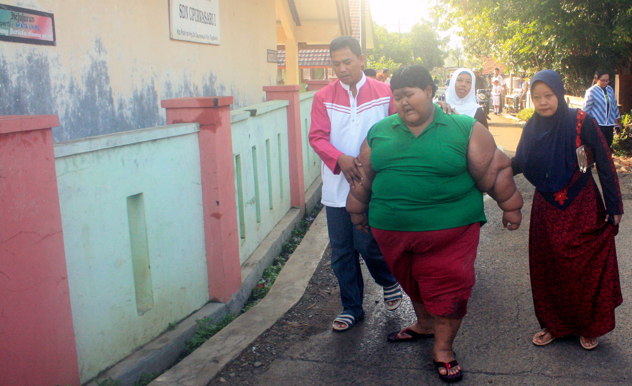 Bocah penderita obesitas ekstrem asal Karawang, Arya Permana, (kiri) bersama teman-temannya bersiap-siap mengikuti pendidikan di kelas IV Sekolah Dasar Negeri Cipurwasari, Kampung Pasir Pining, Desa Cipurwasari, Kecamatan Tegalwaru, Karawang, Jabar, Senin (18/7). Berbeda dengan teman-temannya, bocah berusia 10 tahun yang memiliki berat badan 190 kilogram itu tidak memakai seragam sekolah, karena tidak ada seragam sekolah dasar yang cukup dengan ukuran badannya yang sangat besar. ANTARA FOTO/M. Ali Khumaini/pd/16.