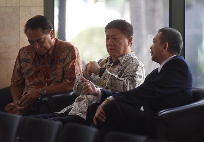 Chairman Agung Sedayu Group Sugianto Kusuma alias Aguan (tengah) menunggu untuk diperiksa di Gedung KPK, Jakarta, Selasa (17/4). Aguan diperiksa sebagai saksi terkait kasus pembahasan Raperda tentang rencana zonasi wilayah pesisir dan pulau-pulau kecil provinsi DKI Jakarta tahun 2015-2035 dan raperda tentang rencana tata ruang kawasan strategis Pantai Utara Jakarta. ANTARA FOTO/Akbar Nugroho Gumay/pd/16
