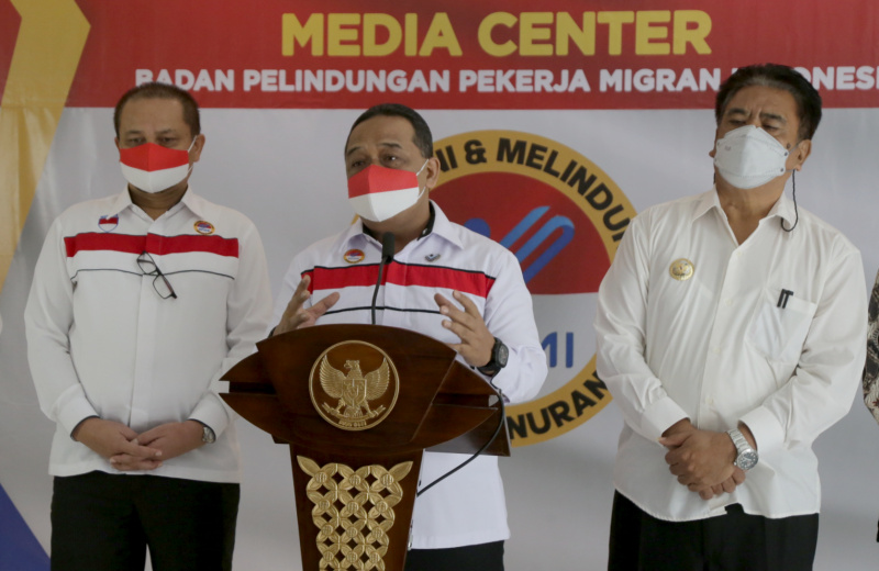 Kepala Badan Perlindungan Pekerja Migran Indonesia (BP2MI) Benny Rhamdani menyampaikan samabutan usai menandatangani Nota Kesepahaman dan Perjanjian Kerja sama di Jakarta, Senin (29/3/2021).