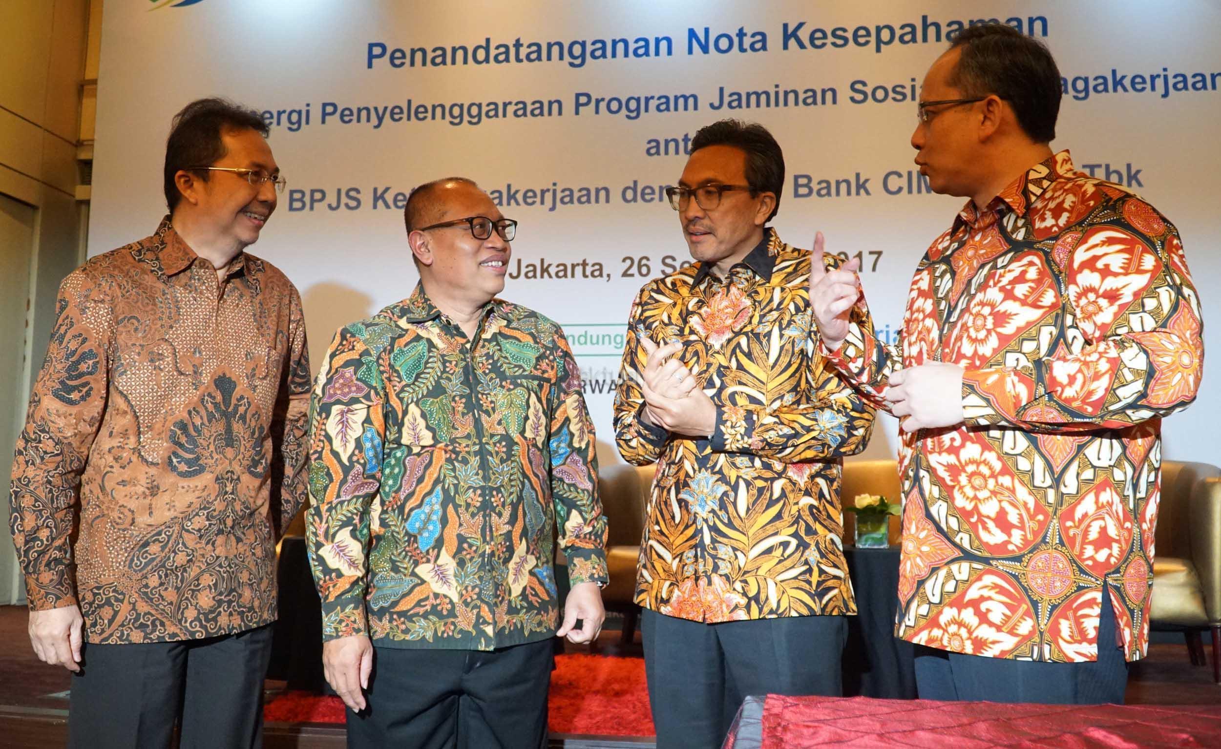 (Dari kiri ke kanan) Direktur Perluasan Kepesertaan BPJS Ketenagakerjaan, E Ilyas Lubis, Direktur Utama BPJS Ketenagakerjaan Agus Susanto, Presiden Direktur CIMB Niaga Tigor M. Siahaan, dan Direktur Business Banking CIMB Niaga Rahardja Alimhamzah berbincang usai penandatanganan Nota Kesepahaman antara CIMB Niaga dan BPJS Ketenagakerjaan tentang Sinergi Penyelenggaraan Program Jaminan Sosial Ketenagakerjaan, di Graha Niaga, Jakarta, Selasa, (26/9/2017). Setelah resmi menyelenggarakan perlindungan bagi Tenaga Kerja Indonesia (TKI),BPJS Ketenagakerjaan terus menjalin berbagai kerjasama strategis untuk memuluskan upaya perlindungannya,Kerjasama dengan CIMB Niaga juga mendukung PERISAI atau Pengerak Jaminan sosial Indonesia yaitu sistem keagenan yang dikembangkan BPJS Ketenagakerjaan untuk memperluas akuisisi pekerja sektor informal. AKTUAL/Eko S Hilman