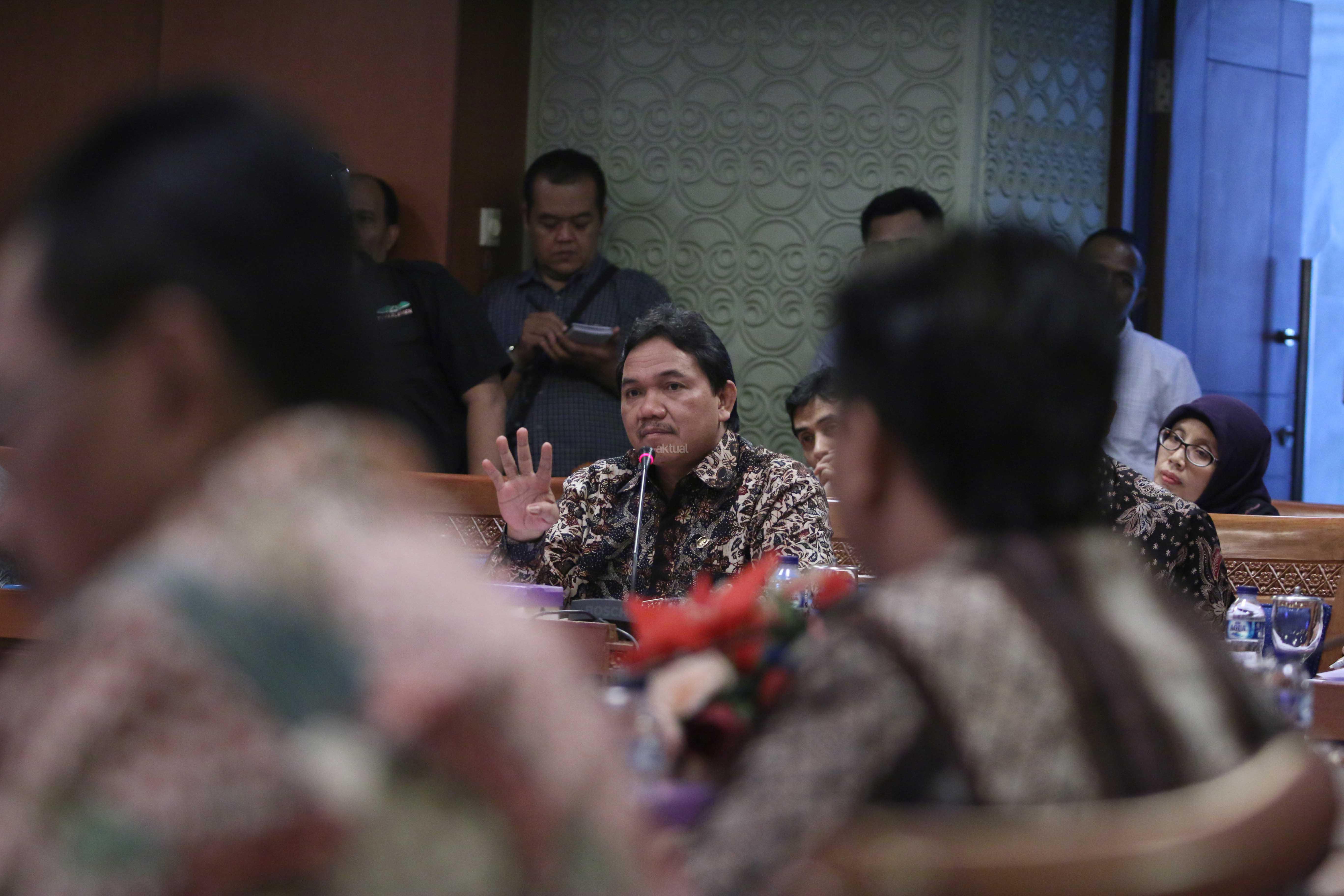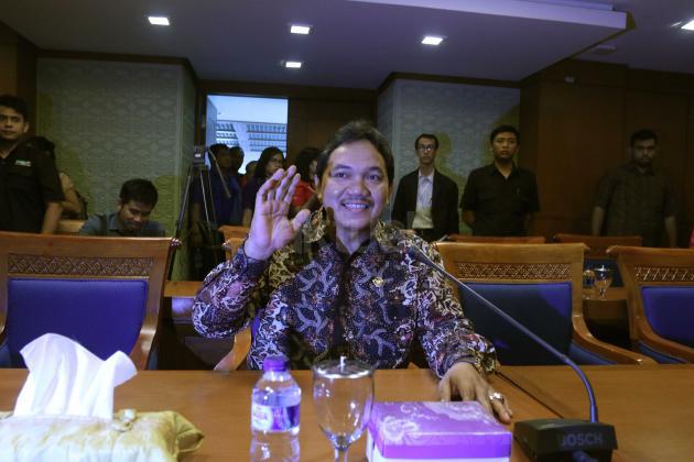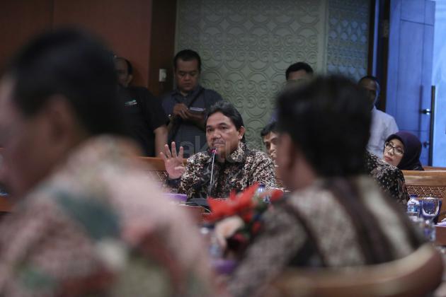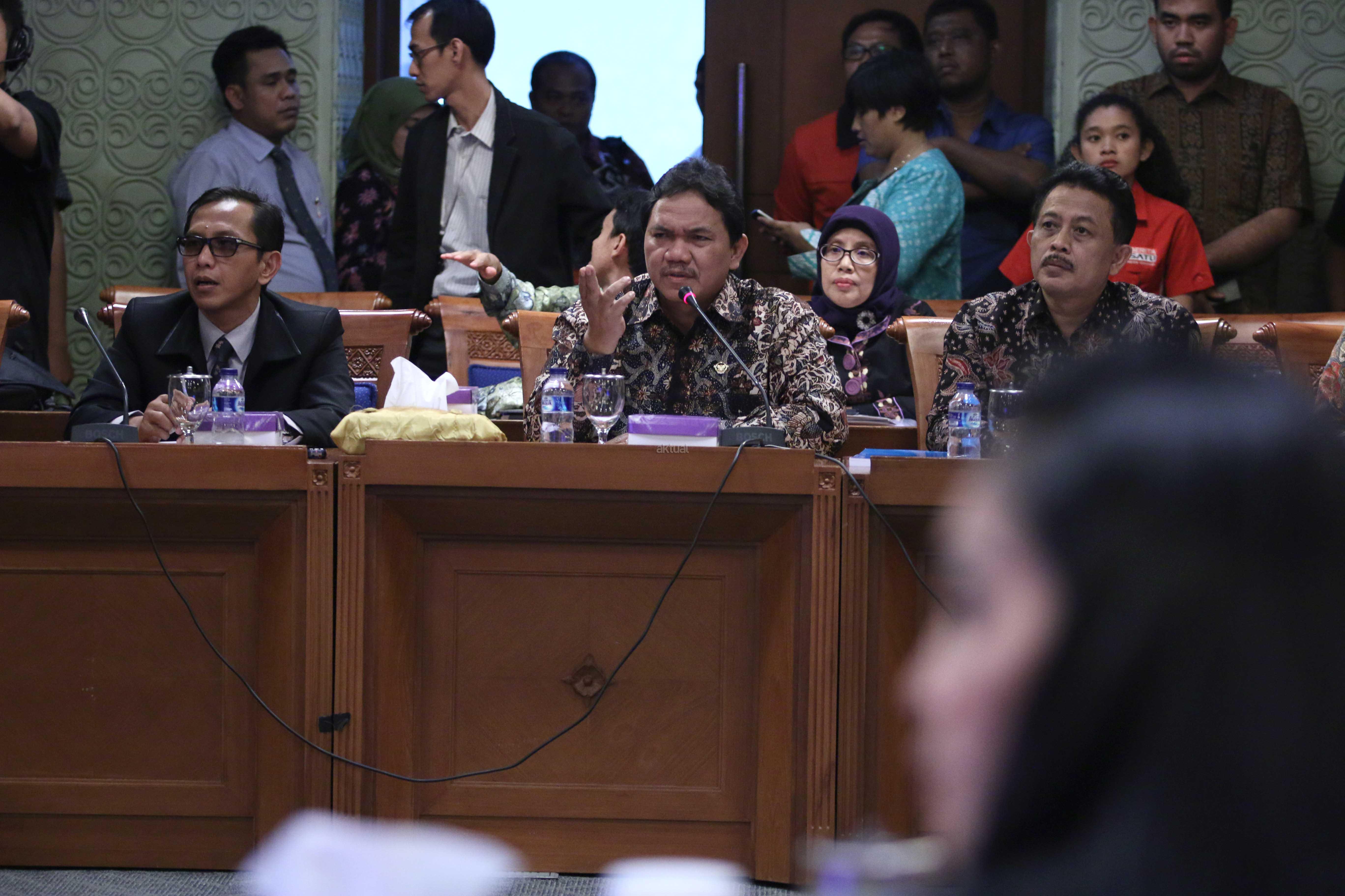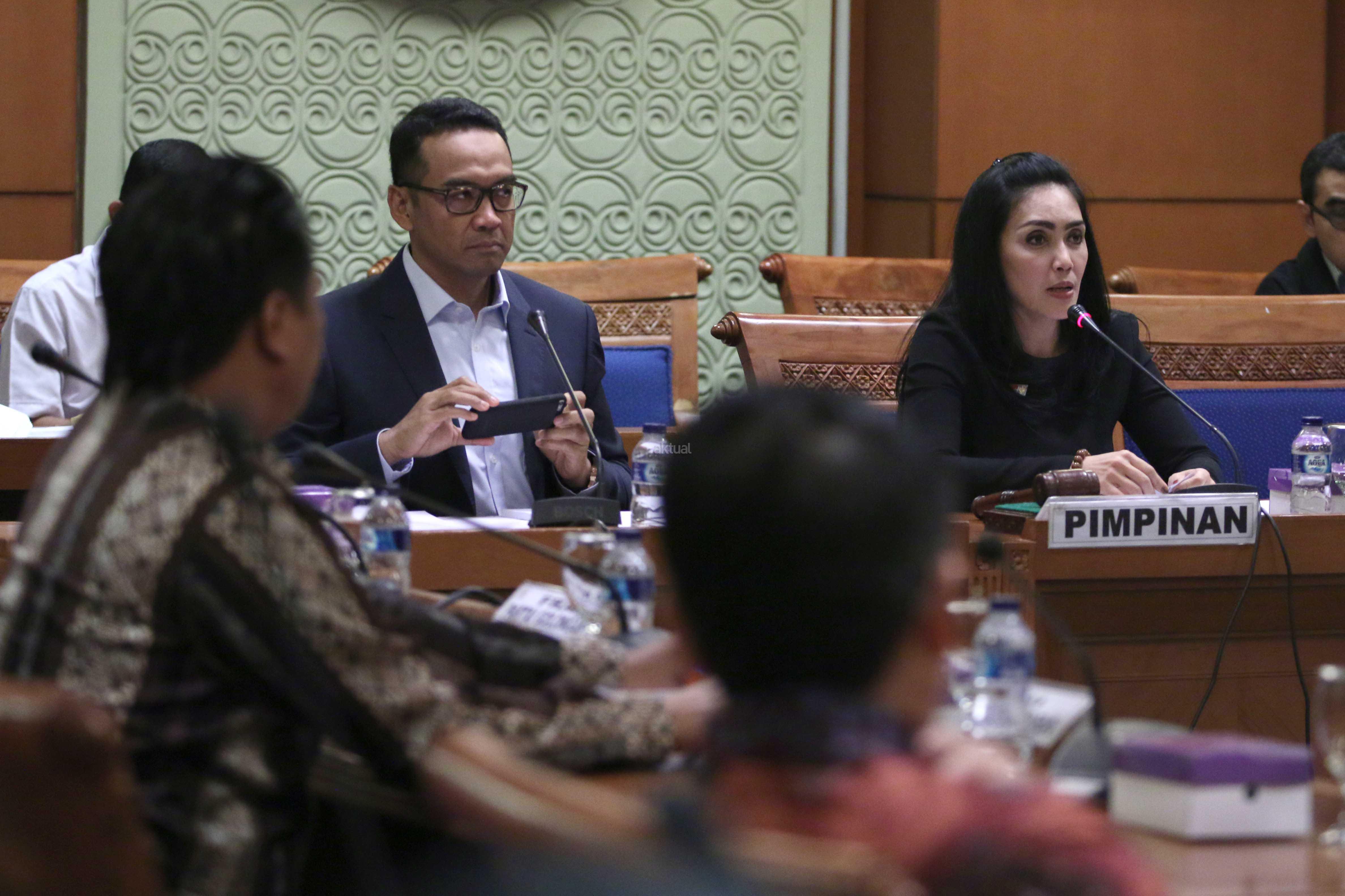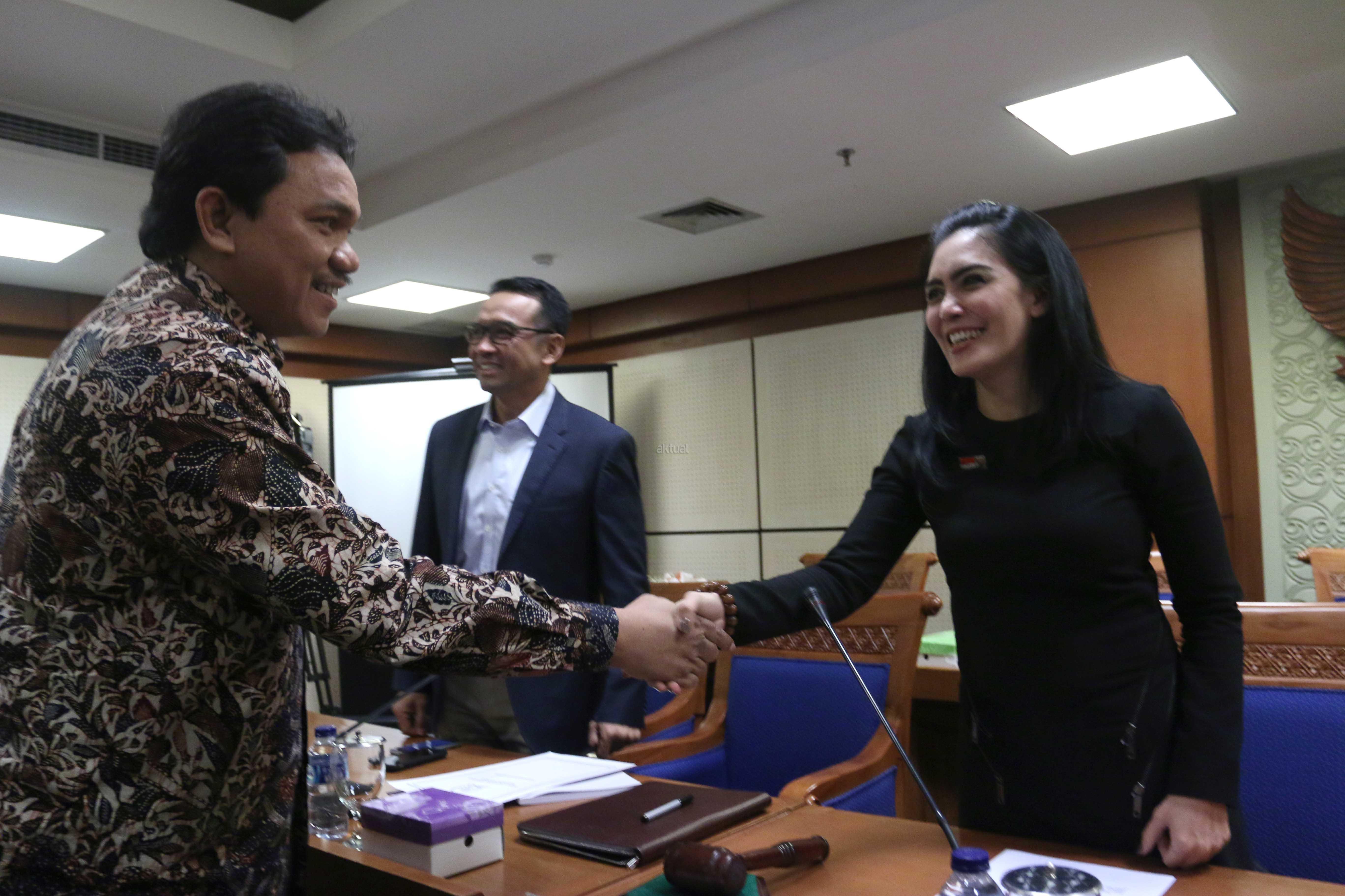 Anggota Badan Pemeriksa Keuangan (BPK) Achsanul Qosasi (kiri) menyalami Ketua Pansus Pelindo II Rieke Diah Pitaloka (kanan) disaksikan Wakil Ketua Pansus Pelindo II Teguh Juwarno sebelum rapat dengan Pansus Pelindo II di Kompleks Parlemen, Jakarta, Kamis (22/10/2015). Selain Anggota BPK Achsanul Qosasi, Pansus hari ini juga menggelar rapat dengan Kepala Pusat Pelaporan Analisis Transaksi Keuangan (PPATK) Muhammad Yusuf dan Jaksa Agung M Prasetyo. Muhammad Yusuf menyarankan agar Pansus meminta hasil audit BPK terhadap perusahaan-perusahaan yang diduga merugikan negara dalam kasus Pelindo II.