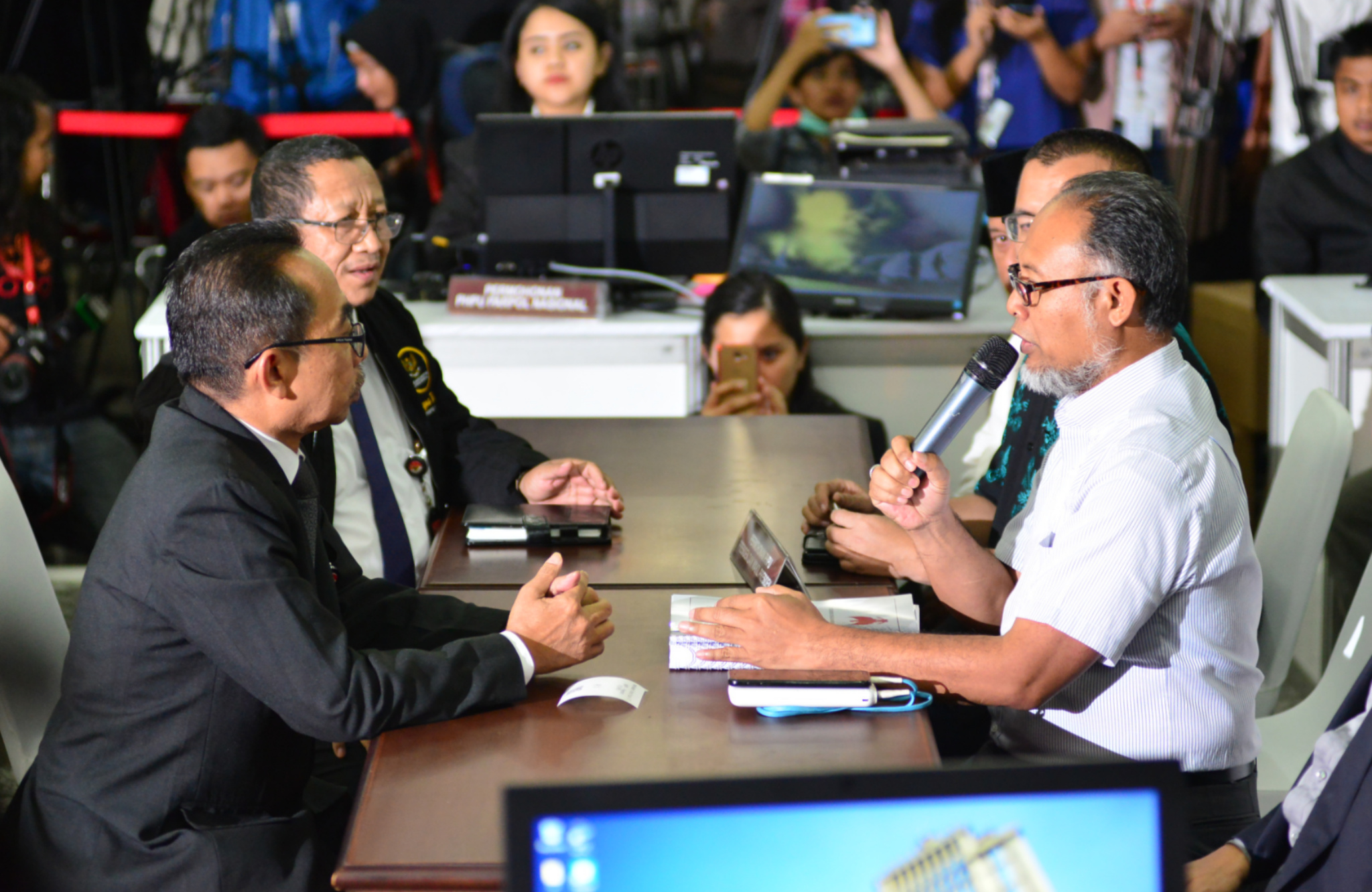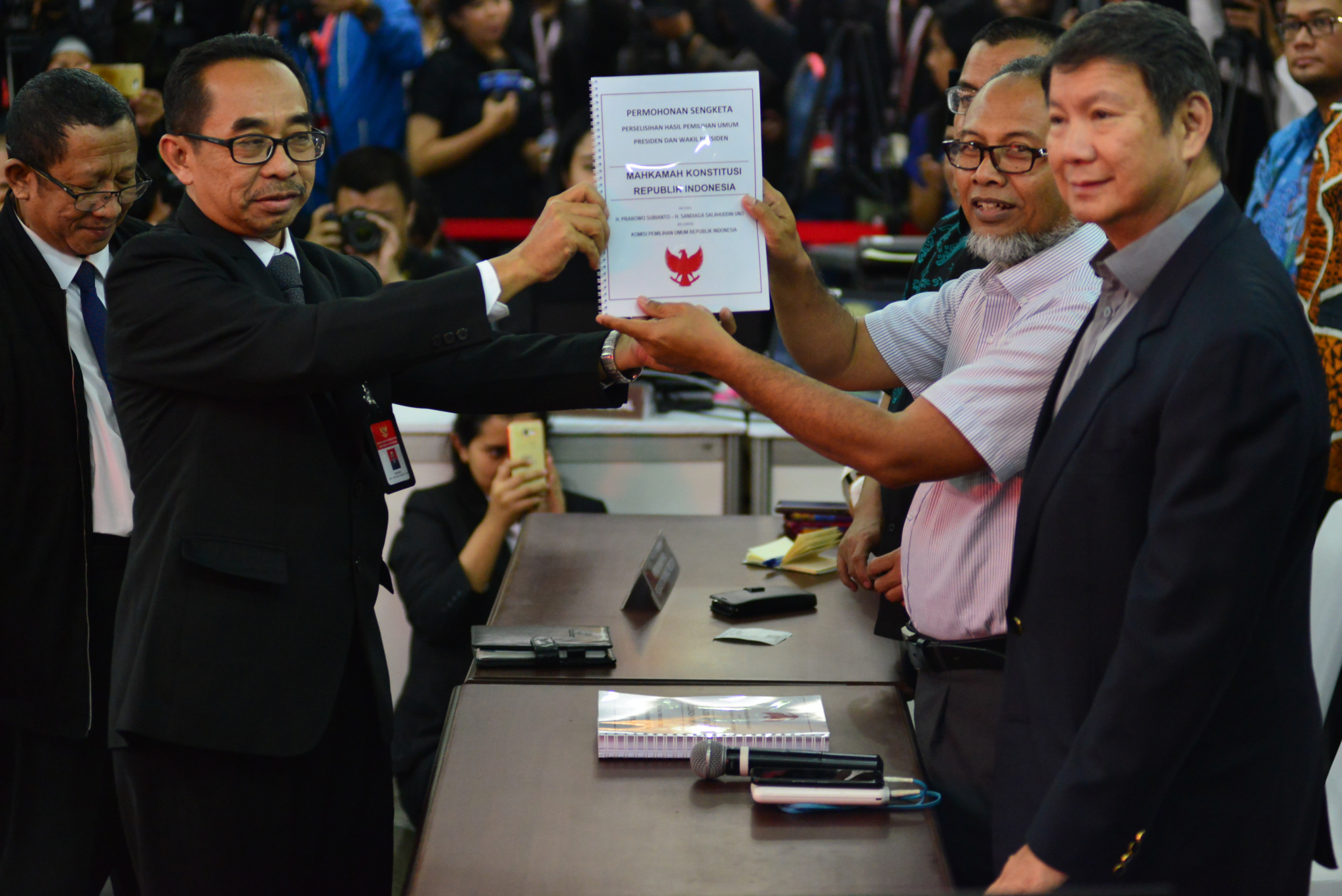 Ketua tim kuasa hukum paslon nomor urut 02 Bambang Widjojanto didampingi Direktur dan Komunikasi Badan Pemenangan Nasional (BPN) Hashim Djojohadikusumo, Tim Pengacara BPN Deny Indrayana dan Ketua Pemenangan BPN Djoko Santoso menyerahkan alat bukti gugatan ke Mahkamah Konstitusi, Jakarta, Jumat (24/5) malam. AKTUAL/Tino Oktaviano