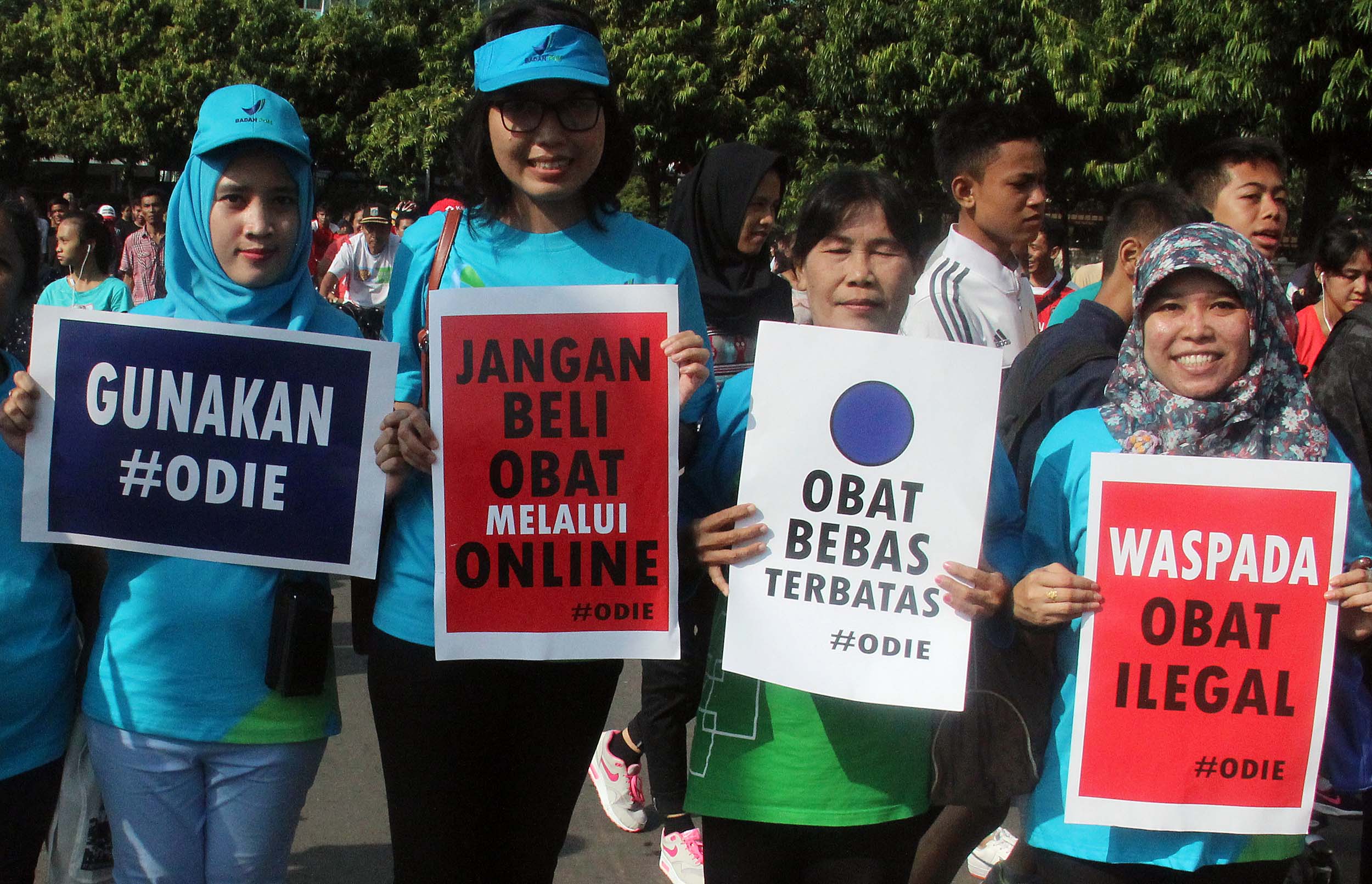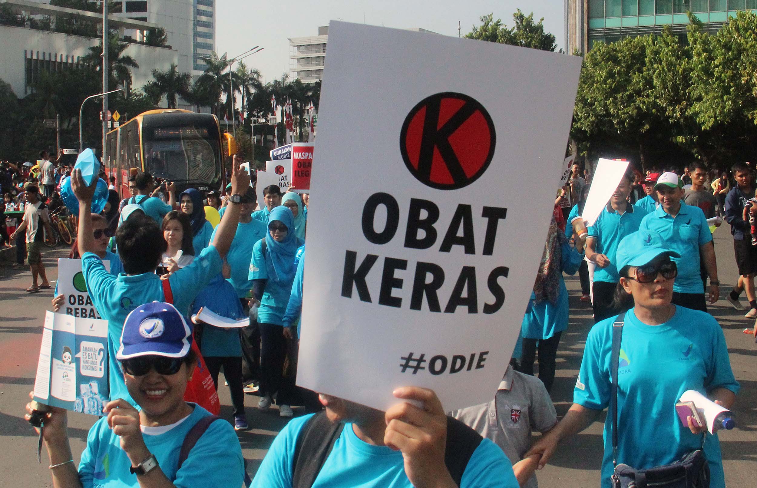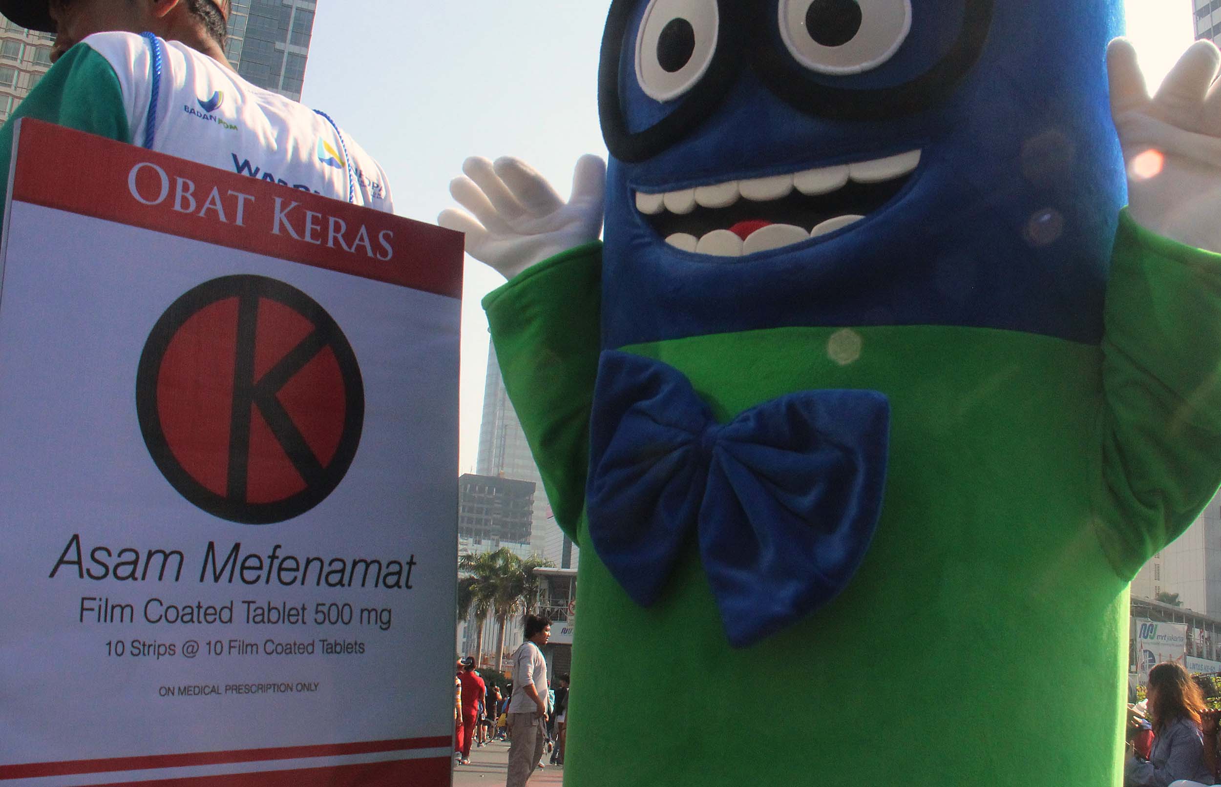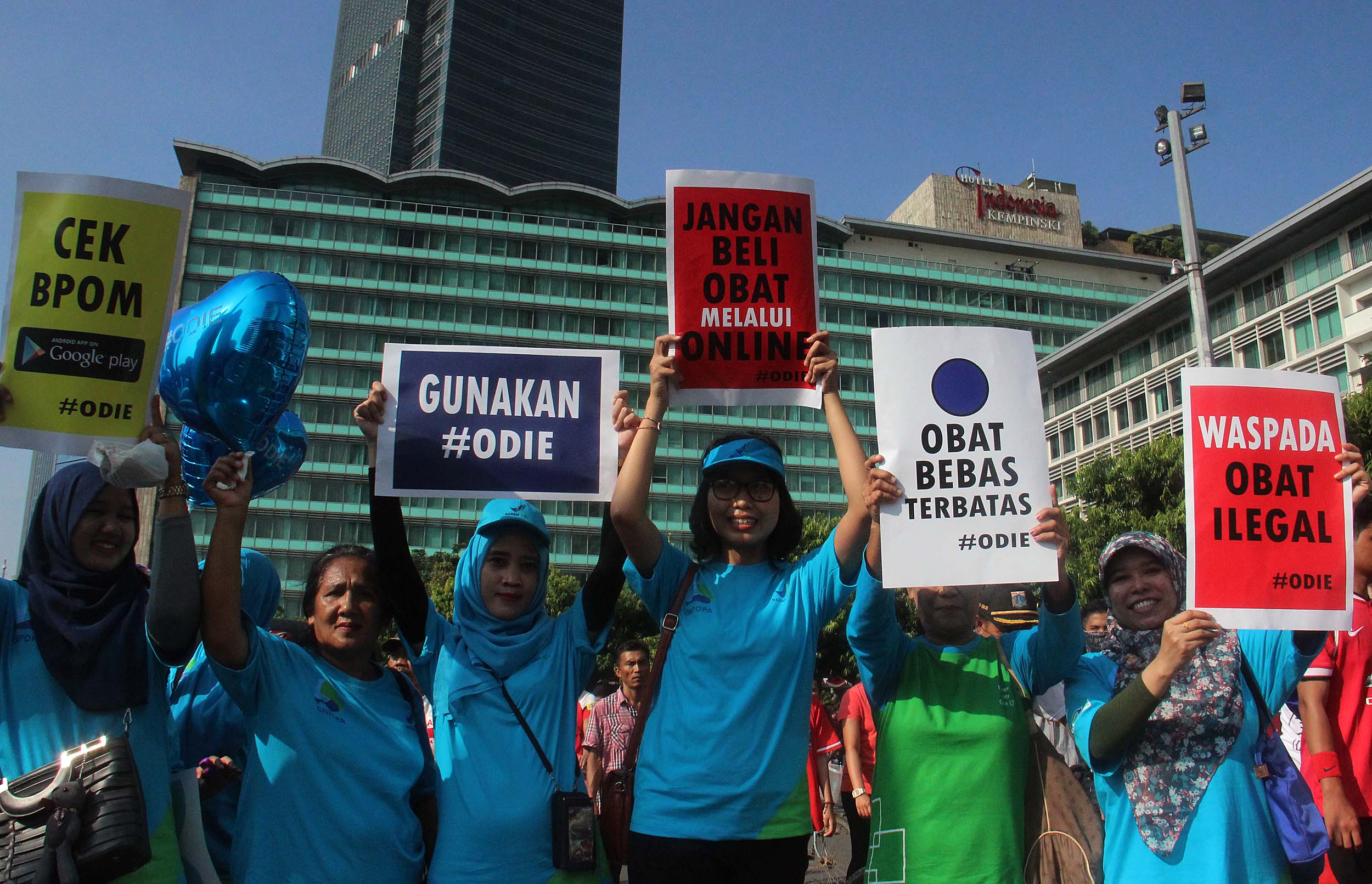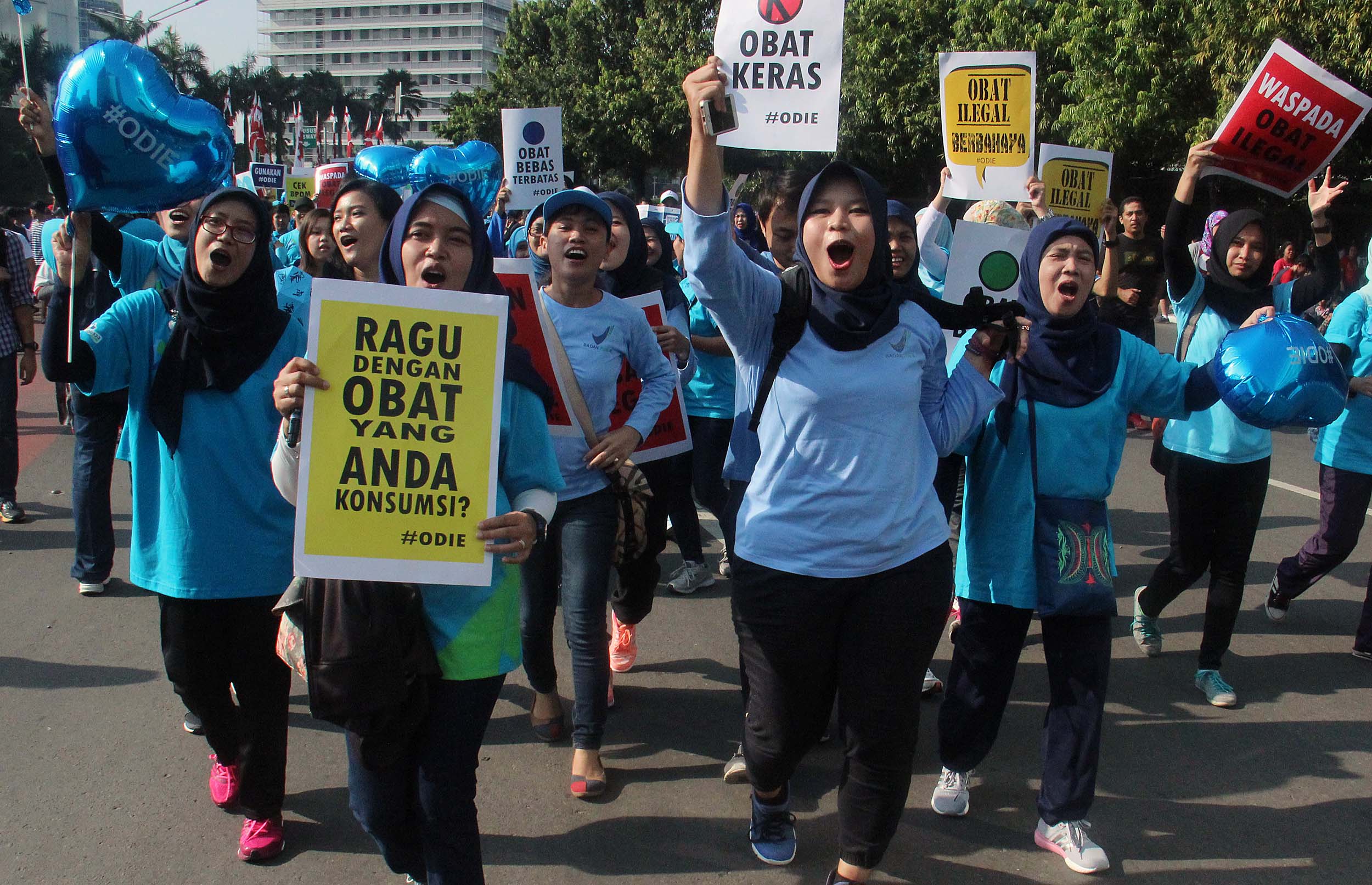 Ratusan pegawai BPOM (Badan Pengawas Obat dan Makanan) melakukan kampanye obat ilegal di arena Car Free Day, Bundaran HI Jakarta, Minggu (21/8/2016). Dalam aksinya para pegawai BPOM Mmemperingatkan warga untuk waspada terhadap penggunaan obat palsu tanpa izin edar.