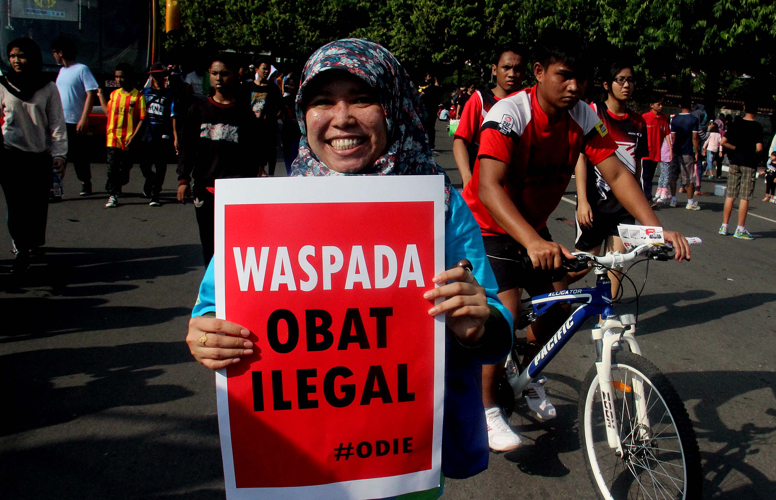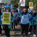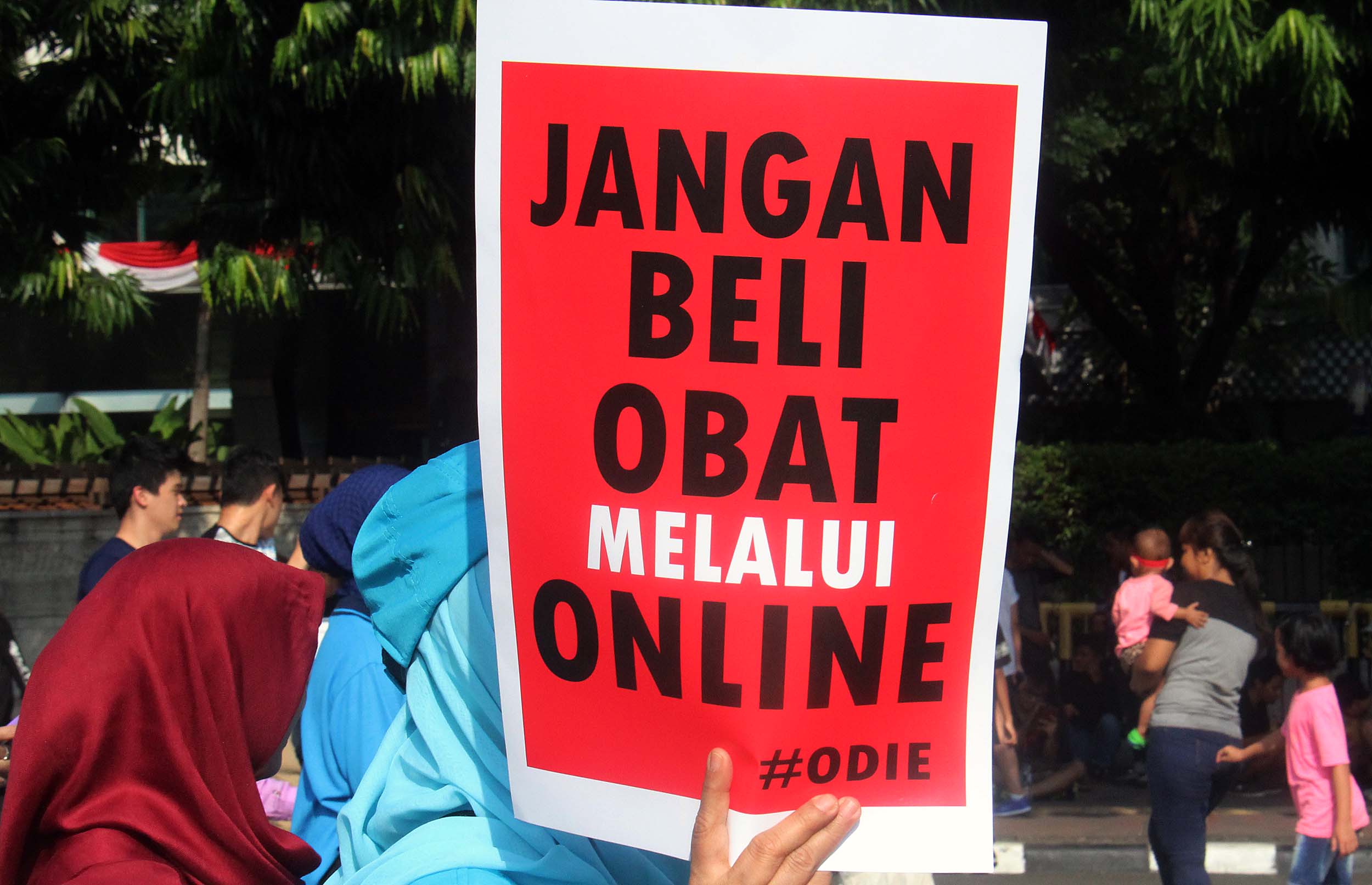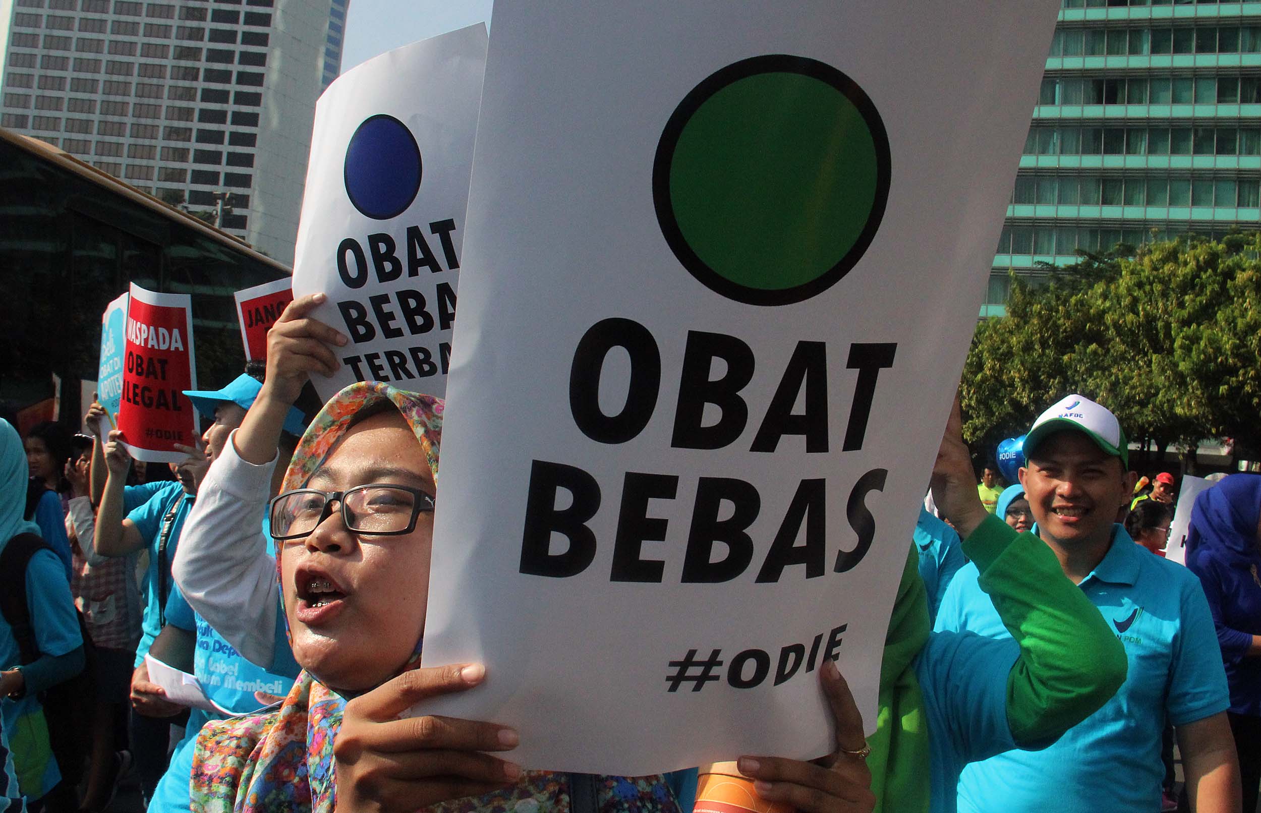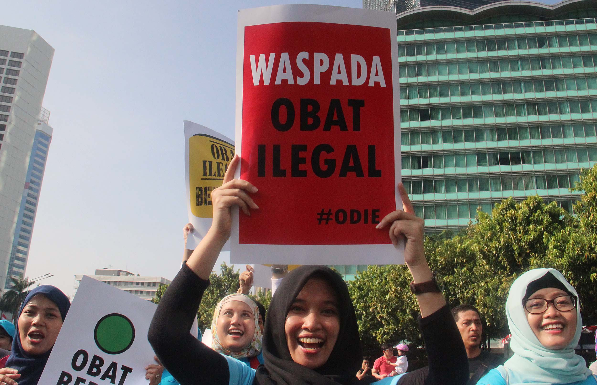 Ratusan pegawai BPOM (Badan Pengawas Obat dan Makanan) melakukan kampanye obat ilegal di arena Car Free Day, Bundaran HI Jakarta, Minggu (21/8/2016). Dalam aksinya para pegawai BPOM Mmemperingatkan warga untuk waspada terhadap penggunaan obat palsu tanpa izin edar.