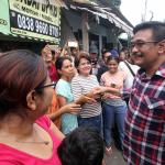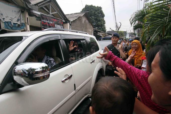 Calon Wakil Gubernur DKI Jakarta Djarot Saiful Hidayat (tengah) menyapa warga saat melakukan blusukan di Kembangan Utara, Jakarta, Rabu (9/11). Meski sempat mendapat penolakan dari sekelompok orang, namun Djarot tetap melakukan blusukan untuk menyerap aspirasi warga. AKTUAL/Tino Oktaviano