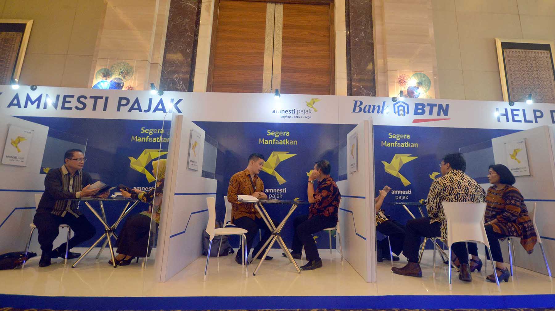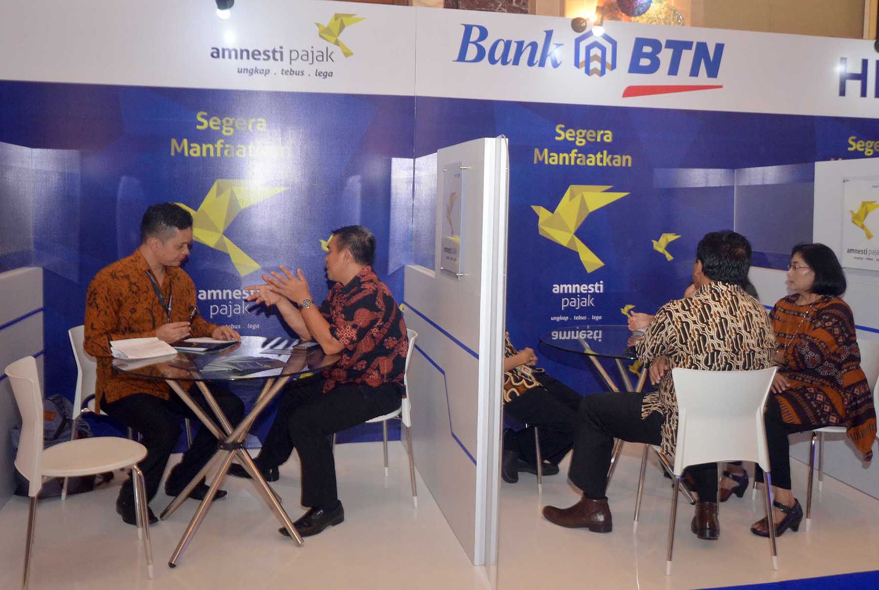 Wajib pajak melakukan konsultasi pengampunan pajak disela seminar dan sosialisasi amnesti pajak kepada para pengembang dan nasabah prioritas di Jakarta, Jumat (19/8). PT. Bank Tabungan Negara (Persero), Tbk. mengajak pengembang dan nasabah prioritas untuk mendukung program pemerintah dalam amnesti pajak.Seminar tersebut dimaksudkan untuk memberikan pemahaman tentang program amnesti pajak kepada pengembang sebagai mitra kerja BTN dan nasabah prioritas.
