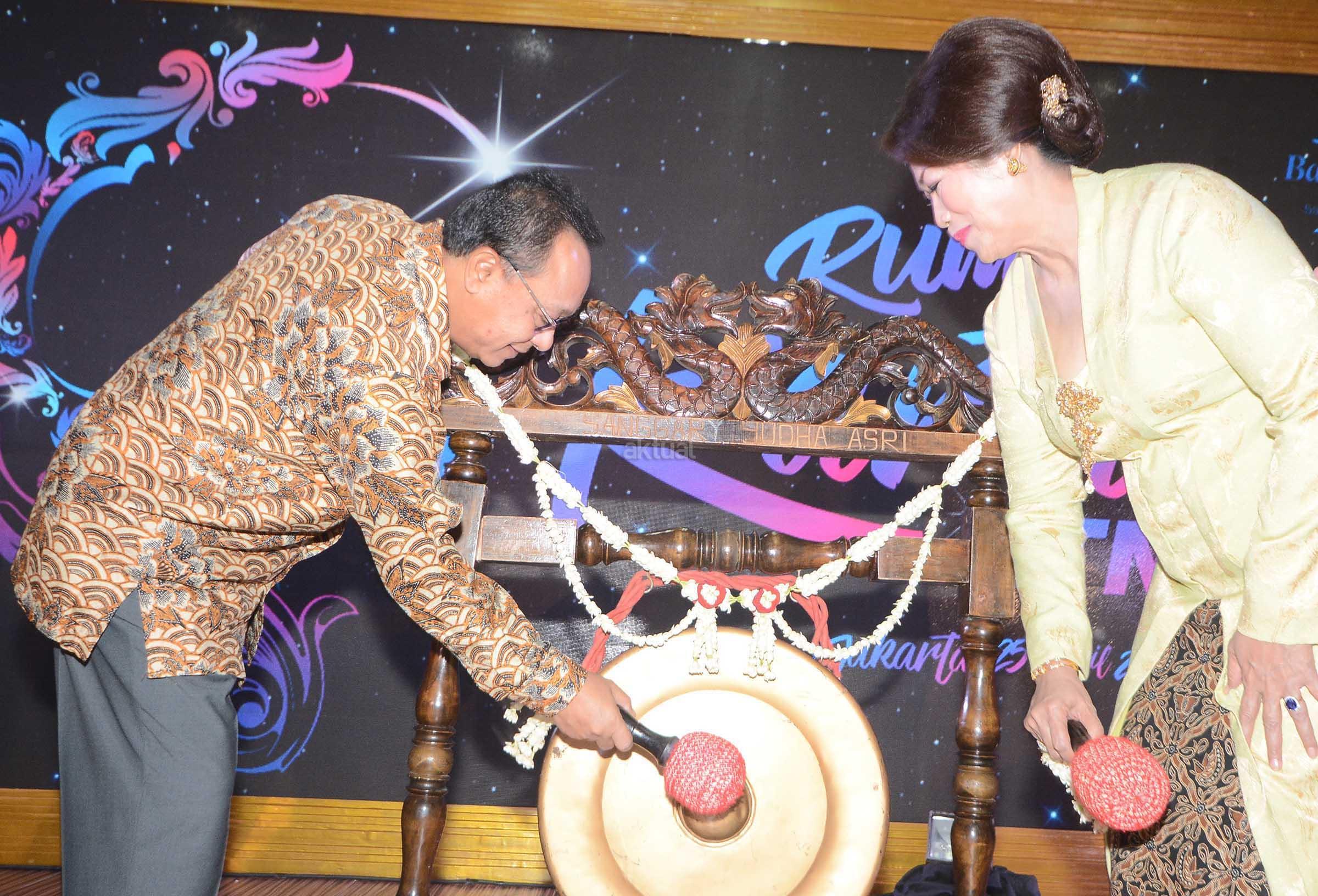 Direktur Utama PT Bank Tabungan Negara (persero) Tbk Maryono (kiri) bersama Ketua IIKPA Dei Maryono memukul gong secara simbolis saat pembukaan acara penghargaan Rumah Kartini BTN di Jakarta, Selasa (25/4). Melalui acara ini, Bank BTN, memberikan penghargaan bagi para perempuan yang terpilih karena memberi inspirasi dalam karya dan jasanya, baik di keluarga maupun di lingkungan kerjanya. Adapun terdapat 7 kategori penghargaan yang diberikan Bank BTN dalam Rumah Kartini BTN yaitu, Kartini bank BTN, Kartini Terinspiratif kategori mitra pendukung perumahan, Kartini terinspiratif untuk penegak integritas, Kategori Organisasi perumahan, Kategori agen properti, kategori developer, dan Nasabah Bank BTN Terinspiratif. AKTUAL/Eko S Hilman