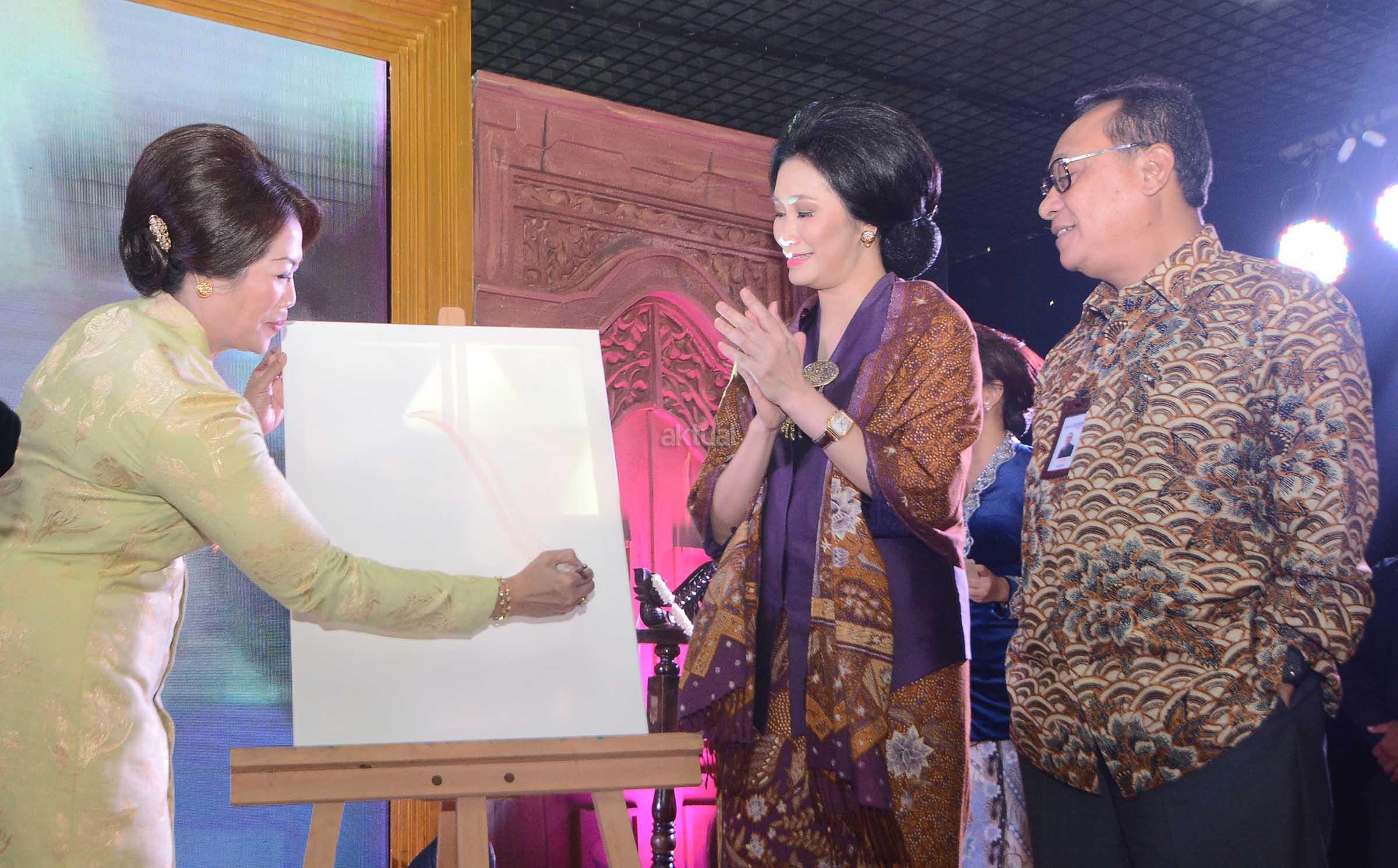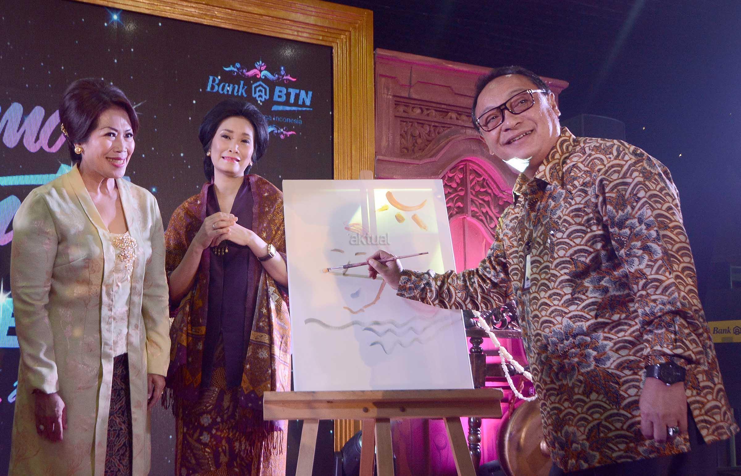 Direktur Utama PT Bank Tabungan Negara (persero) Tbk Maryono (kanan) didampingi Direktur Consumer Banking Bank BTN Handayani (tengah) dan Ketua IIKPA Dei Maryono (kiri) mengoreskan dasar lukisan disela pembukaan acara penghargaan Rumah Kartini BTN di Jakarta, Selasa (25/4). Melalui acara ini, Bank BTN, memberikan penghargaan bagi para perempuan yang terpilih karena memberi inspirasi dalam karya dan jasanya, baik di keluarga maupun di lingkungan kerjanya. Adapun terdapat 7 kategori penghargaan yang diberikan Bank BTN dalam Rumah Kartini BTN yaitu, Kartini bank BTN, Kartini Terinspiratif kategori mitra pendukung perumahan, Kartini terinspiratif untuk penegak integritas, Kategori Organisasi perumahan, Kategori agen properti, kategori developer, dan Nasabah Bank BTN Terinspiratif. AKTUAL/Eko S Hilman