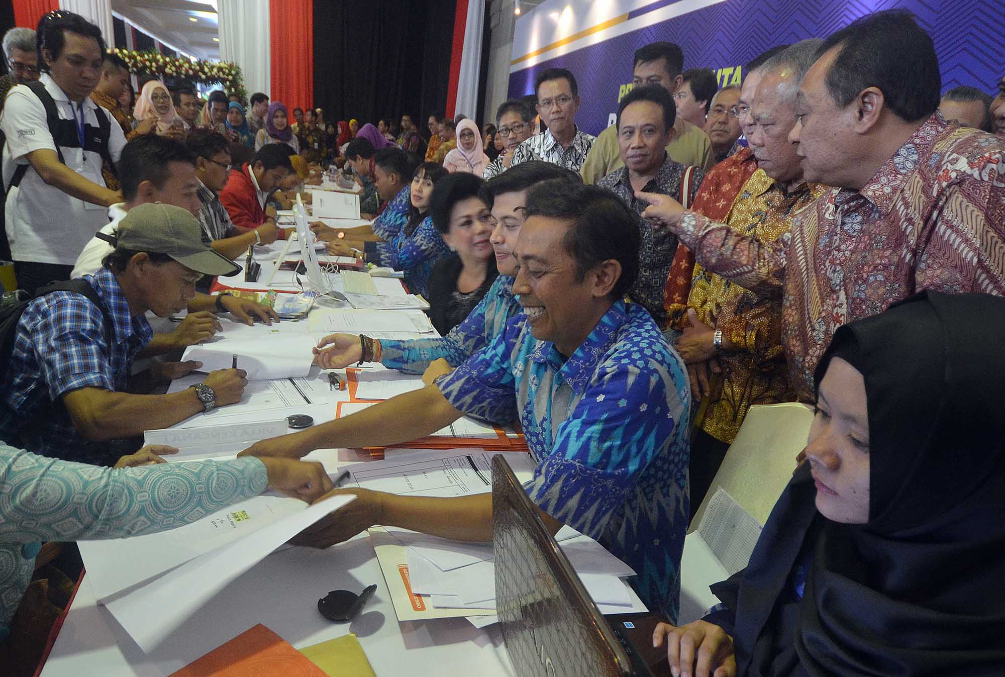 Menteri Pekerjaan Umum dan Perumahan Rakyat, Basuki Hadimuljono (belakang kiri) bersama Direktur Utama Bank BTN, Maryono (belakang kanan) menyaksikan akad kredit program sejuta rumah dari para calon pemilik rumah seusai pembukaan Indonesia Property Expo (IPEX) 2016 di,JCC, Senayan, Jakarta Sabtu (13/8). Kredit yang disalurkan BTN Tumbuh 18,39% dari Rp 126,125 triliun pada tahun 2015 menjadi Rp 149,316 triliun .Menyambut geliat permintaan akan rumah dalam negeri yang terus meninggi Bank BTN kembali menggelar IPEX 2016 yang dijadwalkan berlangsung dari tanggal 13 hingga 21 Agustus 2016 tersebut dengan didukung lebih dari 200 pengembang yang akan memamerkan lebih dari 700 proyek perumahan tersebar di seluruh Indonesia.