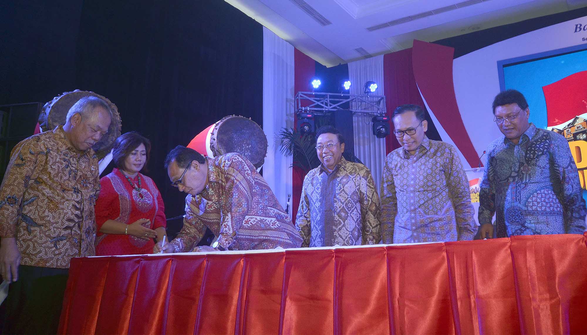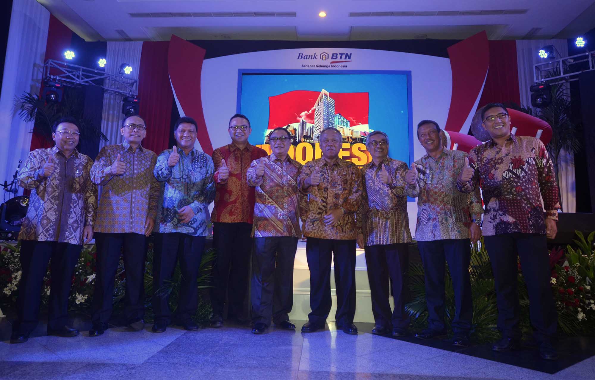 Direktur Utama Bank BTN, Maryono (tengah) dan Menteri Pekerjaan Umum dan Perumahan Rakyat, Basuki Hadimuljono (ke empat dari kanan) ) dan para Direksi BUMN seusai menandatangan naskah kerjasama guna mendukung realisasi program sejuta rumah saat pembukaan IPEX 2016 di JCC, Senayan, Jakarta, Sabtu (13/8) seusai pembukaan IPEX 2016.Menyambut geliat permintaan akan rumah dalam negeri yang terus meninggi Bank BTN kembali menggelar IPEX 2016 yang dijadwalkan berlangsung dari tanggal 13 hingga 21 Agustus 2016 tersebut dengan didukung lebih dari 200 pengembang yang akan memamerkan lebih dari 700 proyek perumahan tersebar di seluruh Indonesia.