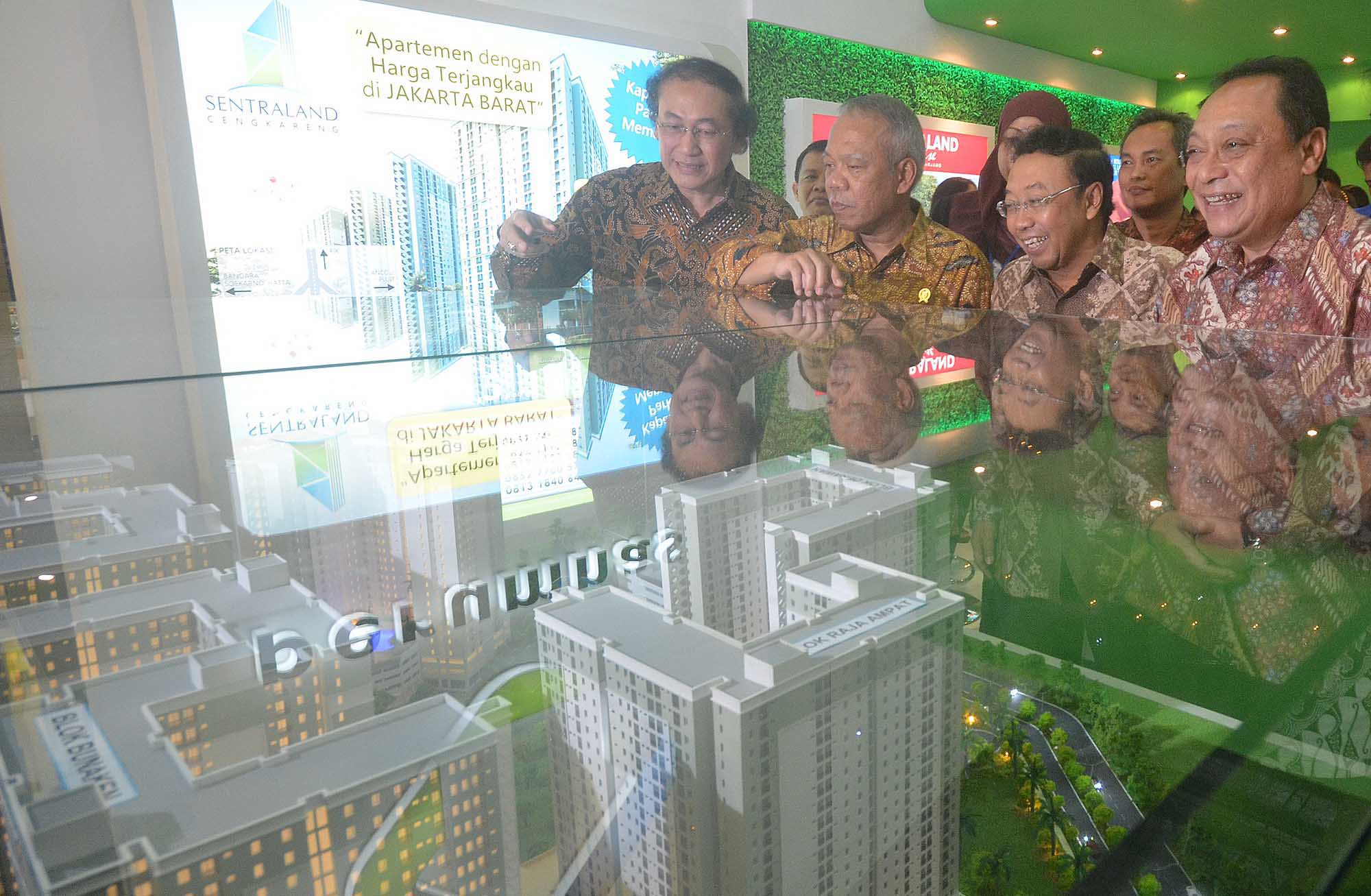 Menteri Pekerjaan Umum dan Perumahan Rakyat, Basuki Hadimuljono (kedua dari kiri) bersama Direktur Utama Perum Perumnas , Bambang Triwibowo (ketiga dari kiri) dan Direktur Utama Bank BTN, Maryono (kanan) mendengarkan penjelasan dari Direktur Pemasaran Perum Perumnas, Muhammmad Nawir (kiri) mengenai proyek Rusunami Cengkareng saat melakukan peninjauan di arena IPEX 2016 di JCC, Senayan, Jakarta, Sabtu (13/8).Rusunami Cengkareng yang merupakan rusunami bersubsidi adalah satu dari 12 proyek strategis yang tengah dikembangkan Perum Perumnas guna mendukung realisasi program 1 juta rumah.