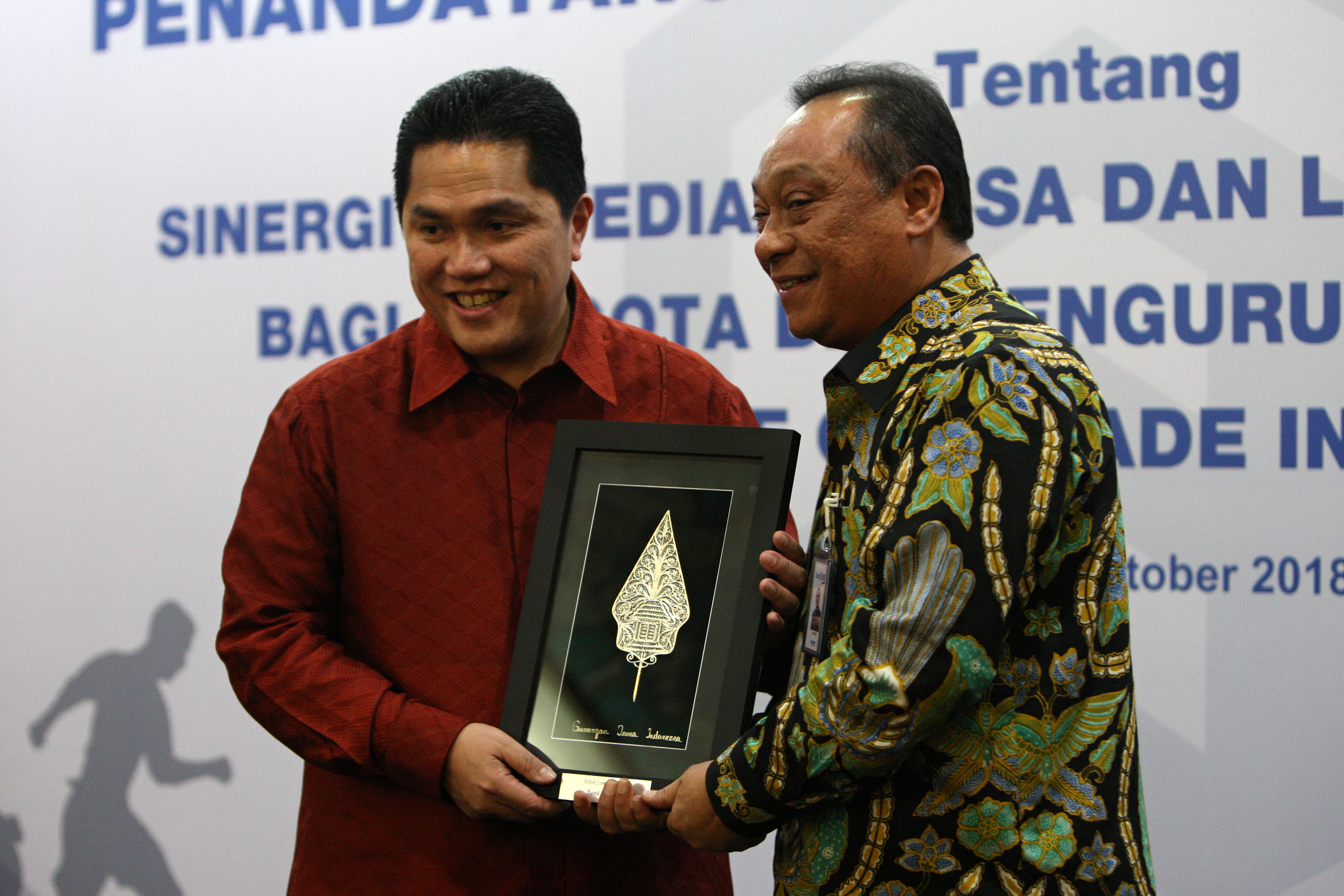 Direktur Utama PT Bank Tabungan Negara (Persero) Tbk Maryono (kanan), Ketua Komite Olimpiade Indonesia (KOI) Erick Thohir (kiri) melakukan perjanjian kerjasama saat acara penandatangan Nota Kesepahaman (Memorandum of Understanding) tentang Sinergi Jasa Layanan Perbankan bagi Anggota dan Pengurus di Lingkungan Komite Olimpiade Indonesia antara KOI dengan Bank BTN di Menara BTN, Jakarta, Senin (15/10/2018). Kerja sama ini dilakukan sebagai wujud dukungan terhadap atlit nasional yang berprestasi sekaligus mendukung kesuksesan Program Satu Juta Rumah. Melalui kemitraan tersebut, pengurus, anggota dan ribuan atlet nasional yang tergabung dalam KOI bisa memiliki rumah dengan skema menarik dan terjangkau. Para atlet pun bisa mengajukan KPR mulai dari usia 18 tahun dengan jangka waktu kredit hingga 30 tahun. Bank BTN juga menawarkan berbagai promosi khusus yakni uang muka mulai dari 5%, bebas biaya administrasi dan provisi, bebas biaya appraisal, dan hanya mengangsur bunga selama dua tahun pertama. AKTUAL/Eko S Hilman