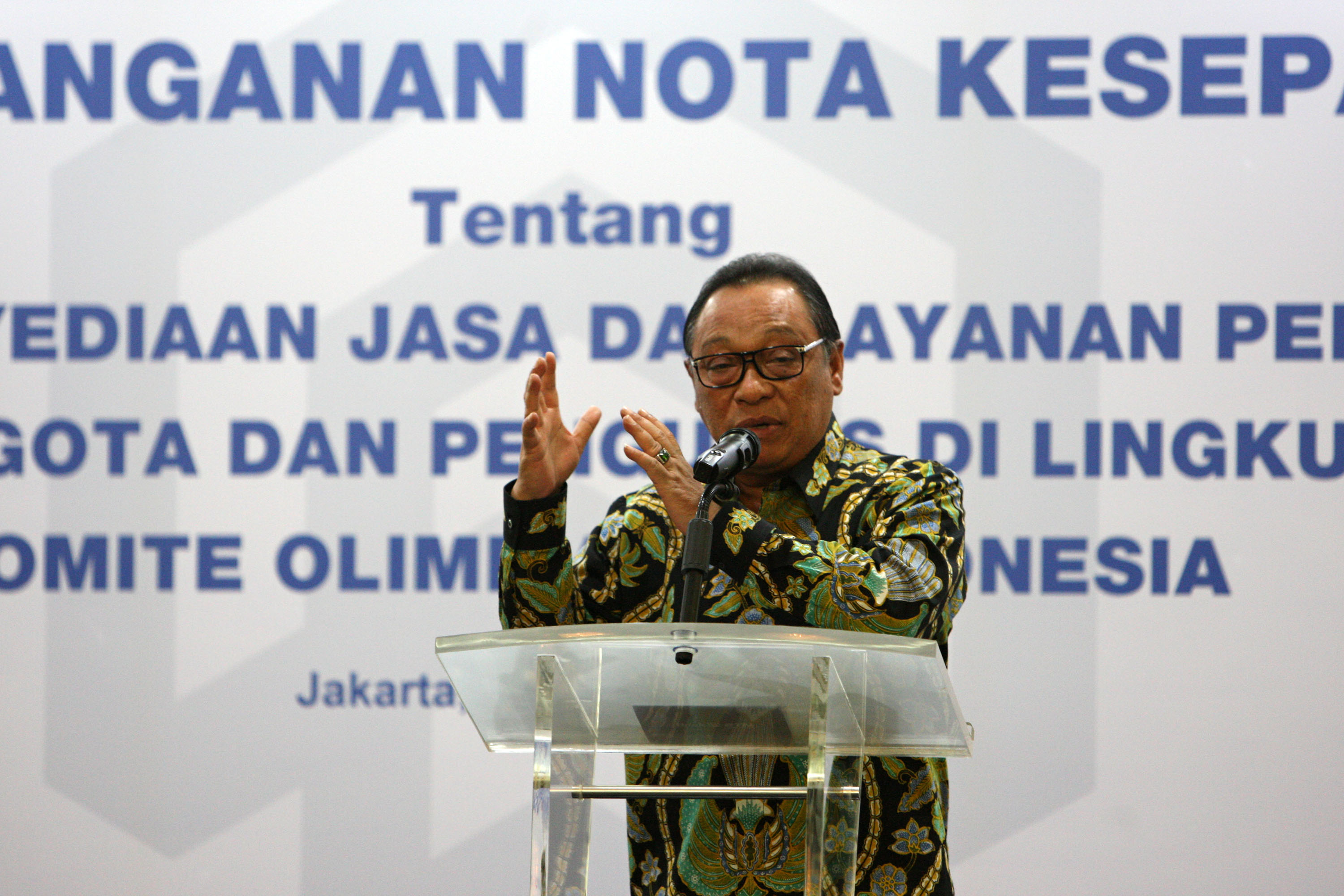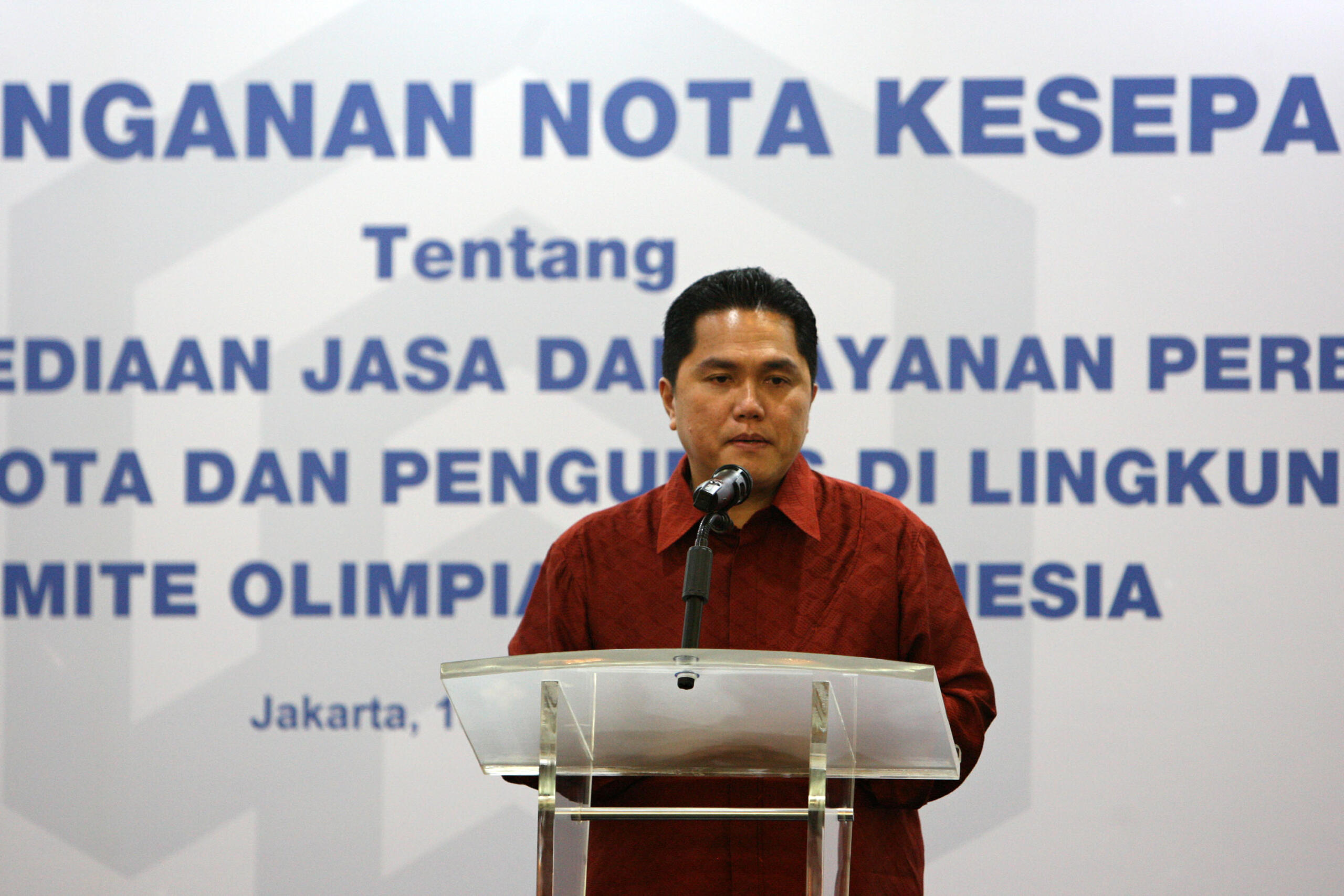 Ketua Komite Olimpiade Indonesia (KOI) Erick Thohir memberikan sambutan saat acara penandatangan Nota Kesepahaman (Memorandum of Understanding) tentang Sinergi Jasa Layanan Perbankan bagi Anggota dan Pengurus di Lingkungan Komite Olimpiade Indonesia antara KOI dengan Bank BTN di Menara BTN, Jakarta, Senin (15/10/2018). Kerja sama ini dilakukan sebagai wujud dukungan terhadap atlit nasional yang berprestasi sekaligus mendukung kesuksesan Program Satu Juta Rumah. Melalui kemitraan tersebut, pengurus, anggota dan ribuan atlet nasional yang tergabung dalam KOI bisa memiliki rumah dengan skema menarik dan terjangkau. Para atlet pun bisa mengajukan KPR mulai dari usia 18 tahun dengan jangka waktu kredit hingga 30 tahun. Bank BTN juga menawarkan berbagai promosi khusus yakni uang muka mulai dari 5%, bebas biaya administrasi dan provisi, bebas biaya appraisal, dan hanya mengangsur bunga selama dua tahun pertama. AKTUAL/Eko S Hilman