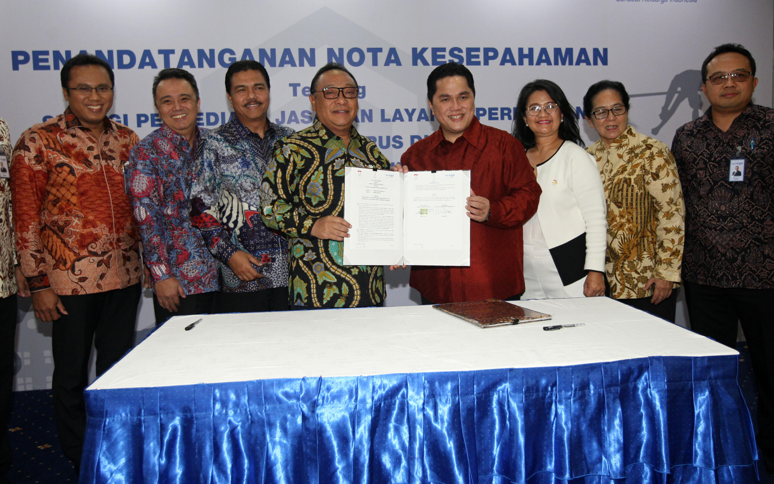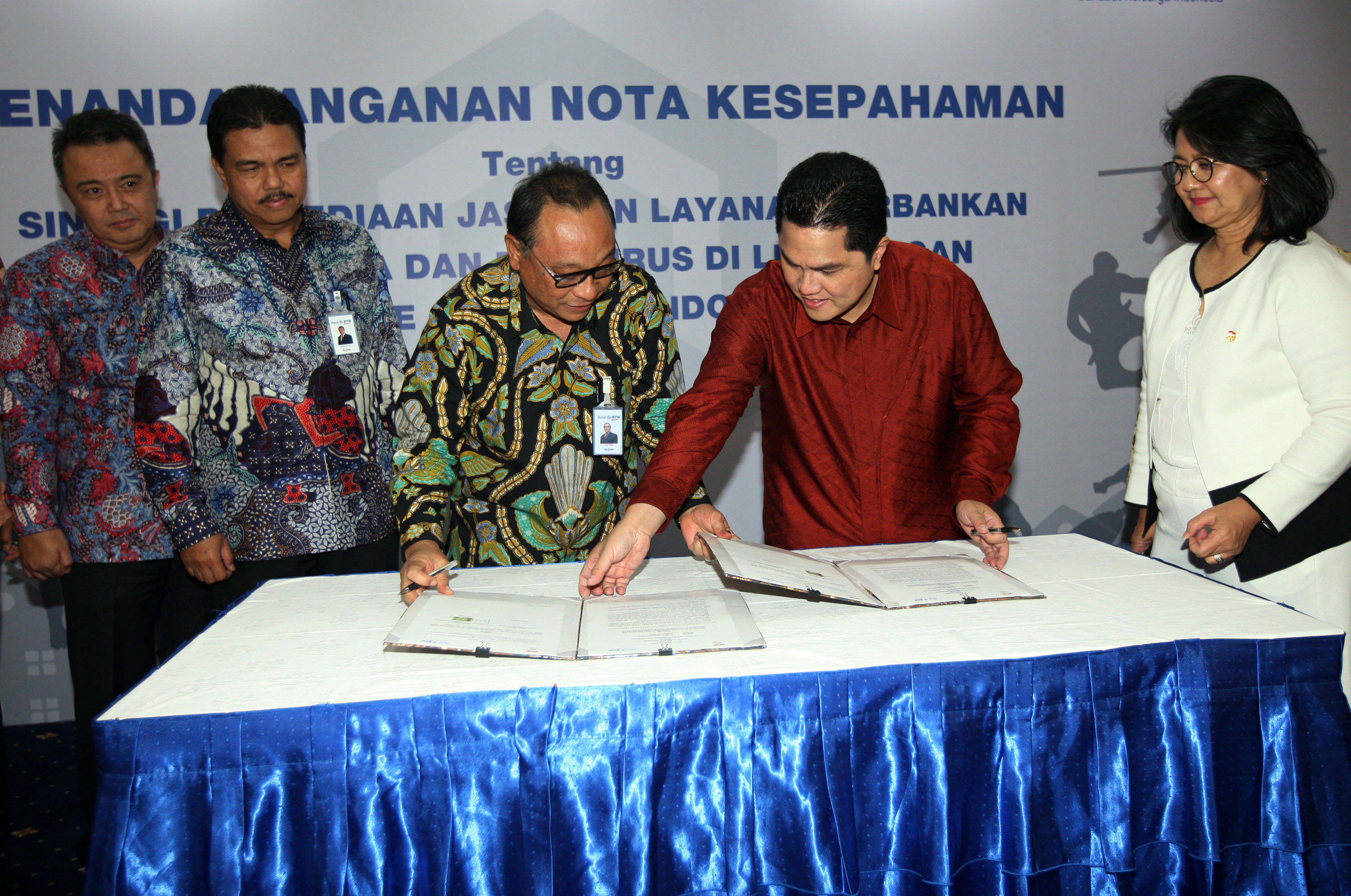 Direktur Utama PT Bank Tabungan Negara (Persero) Tbk Maryono (tengah), Ketua Komite Olimpiade Indonesia (KOI) Erick Thohir (kedua kanan) melakukan perjanjian kerjasama disaksikan Direktur Bank BTN Budi Satria (kedua kiri), Oni Febriarto (kiri) dan Plt Sekjen KOI Hellen Sarita Delima (kanan) saat acara penandatangan Nota Kesepahaman (Memorandum of Understanding) tentang Sinergi Jasa Layanan Perbankan bagi Anggota dan Pengurus di Lingkungan Komite Olimpiade Indonesia antara KOI dengan Bank BTN di Menara BTN, Jakarta, Senin (15/10/2018). Kerja sama ini dilakukan sebagai wujud dukungan terhadap atlit nasional yang berprestasi sekaligus mendukung kesuksesan Program Satu Juta Rumah. Melalui kemitraan tersebut, pengurus, anggota dan ribuan atlet nasional yang tergabung dalam KOI bisa memiliki rumah dengan skema menarik dan terjangkau. Para atlet pun bisa mengajukan KPR mulai dari usia 18 tahun dengan jangka waktu kredit hingga 30 tahun. Bank BTN juga menawarkan berbagai promosi khusus yakni uang muka mulai dari 5%, bebas biaya administrasi dan provisi, bebas biaya appraisal, dan hanya mengangsur bunga selama dua tahun pertama. AKTUAL/Eko S Hilman