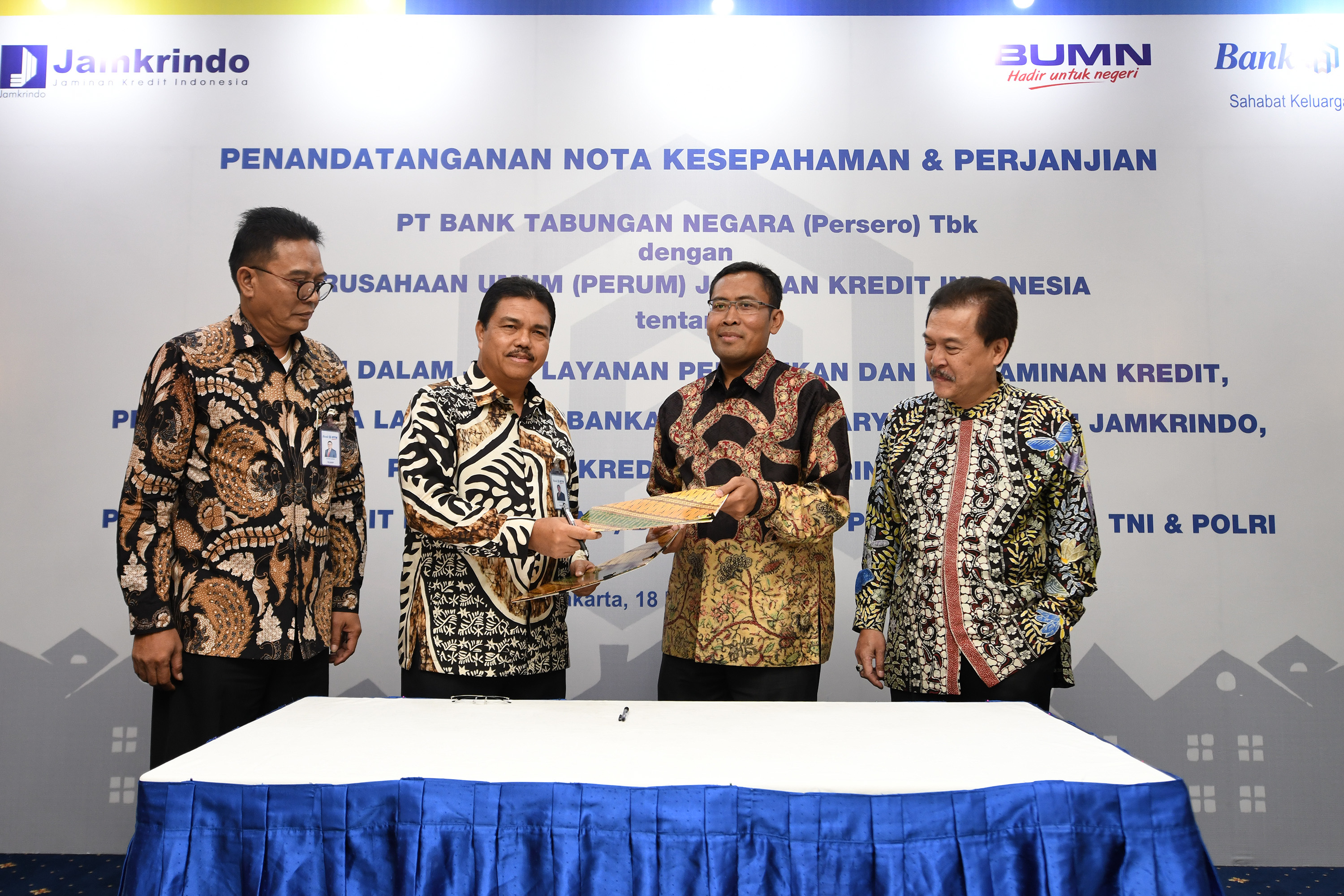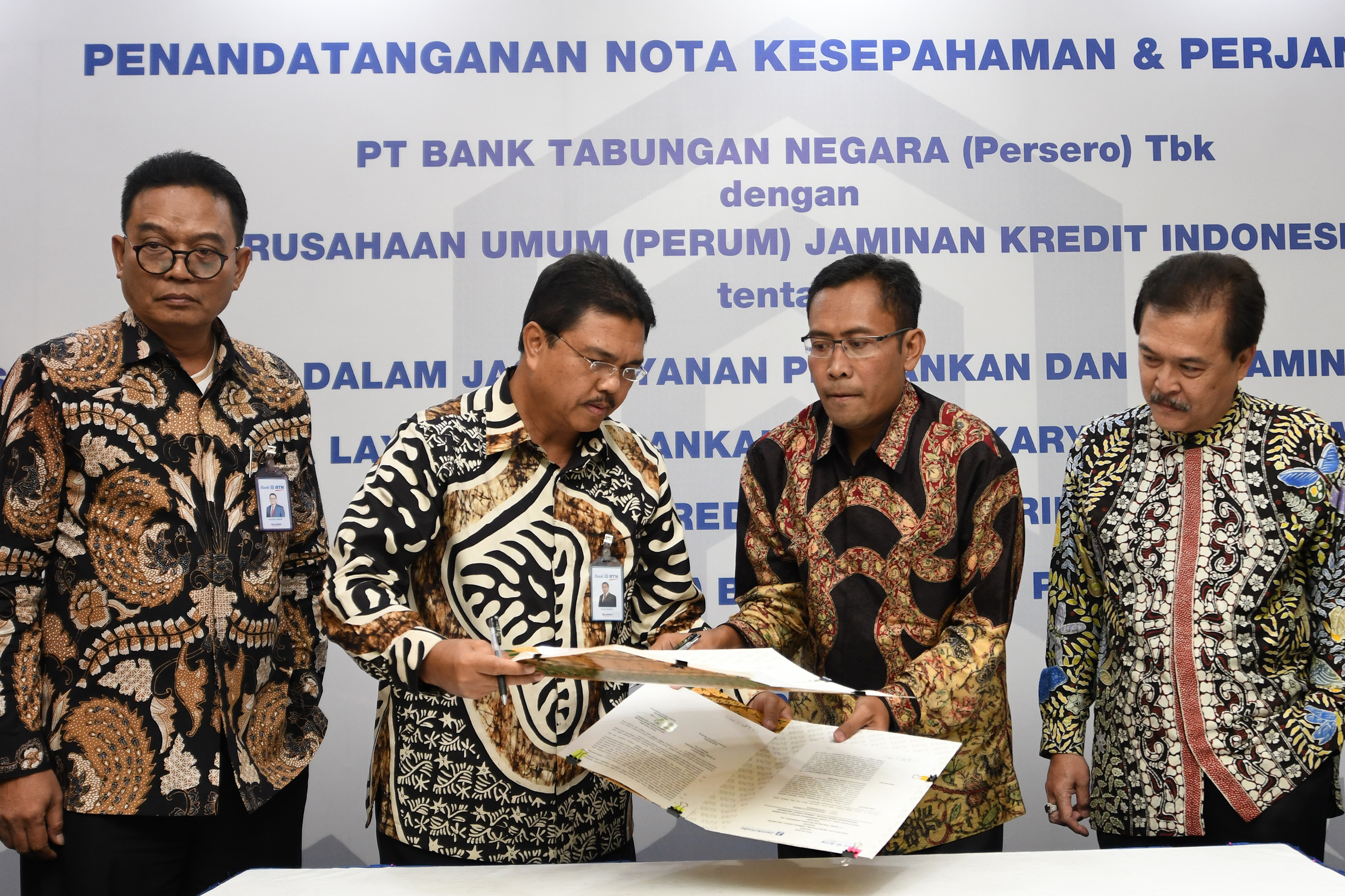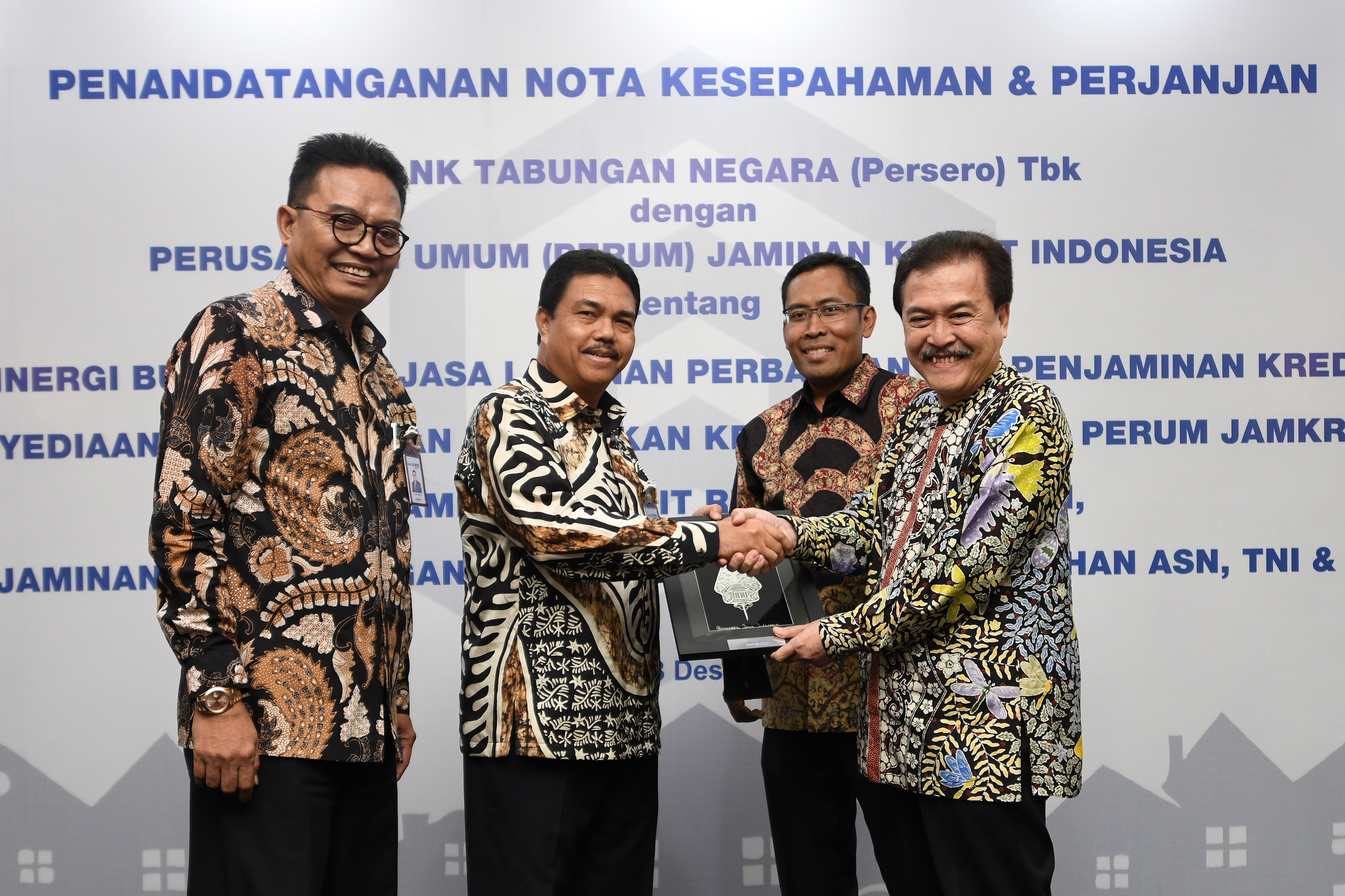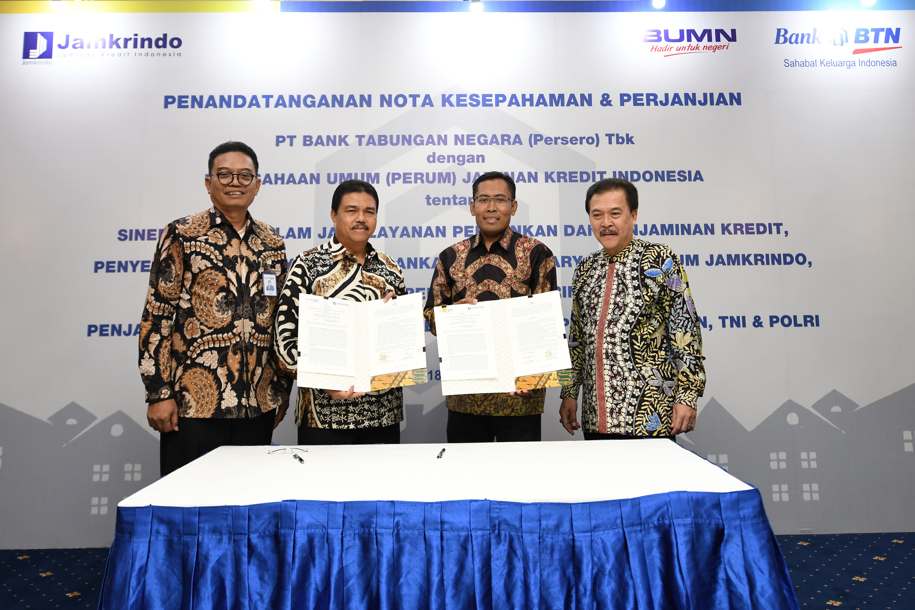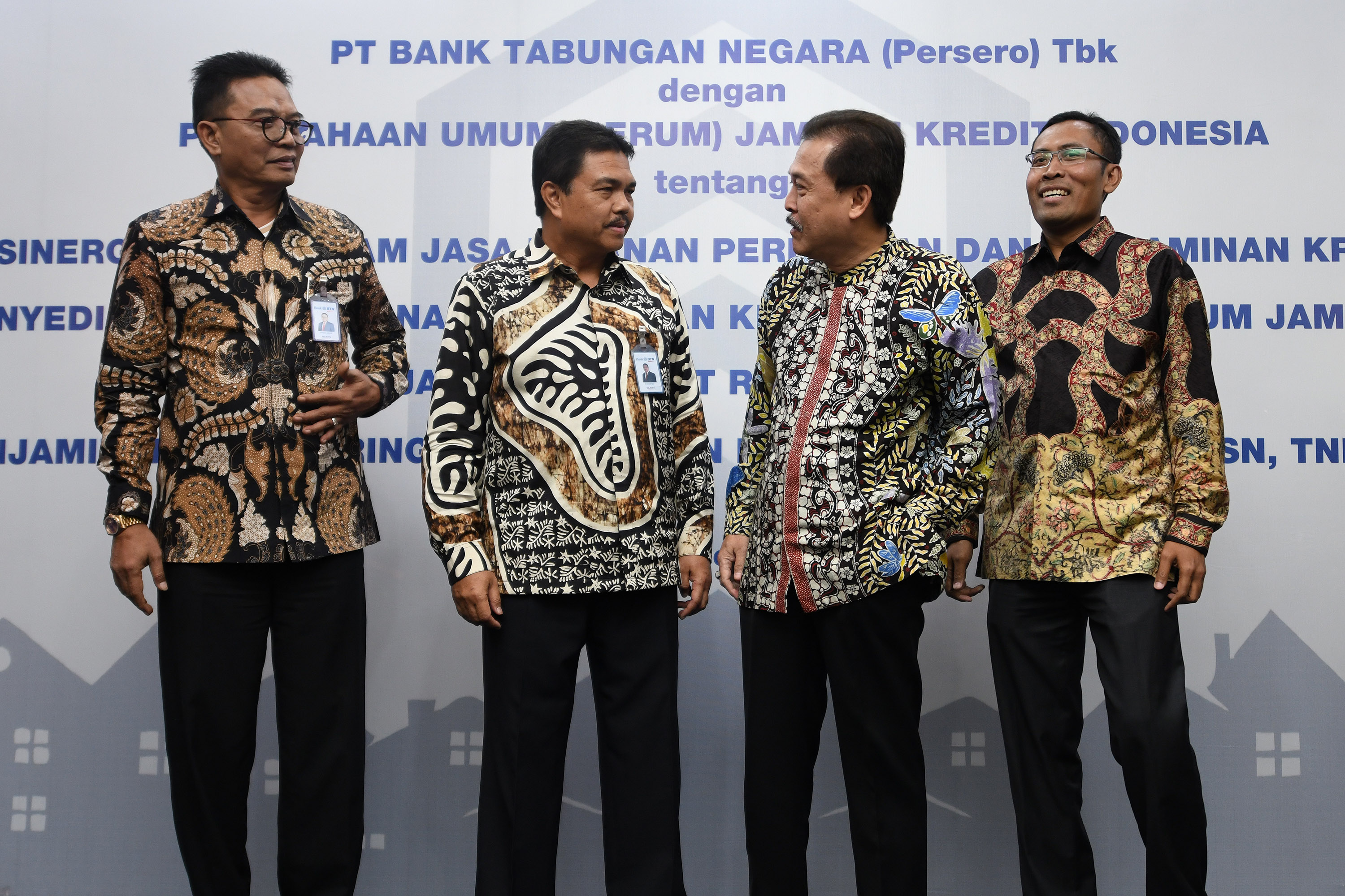 Direktur BTN Budi Satria (kedua kiri) dan Direktur BTN Dasuki Amsir (kiri) bersama Direktur Utama Perum Jamkrindo Randi Anto (kedua kanan) serta Direktur Bisnis Perum Jamkrindo Amin Mas'udi (kanan) berbincang usai penandatanganan kerjasama di Jakarta, Selasa (18/12). Kerjasama ini sebagai sinergi BUMN untuk fokus penyediaan jasa layanan perbankan, penjaminan kredit ringan (Kring) BTN, penjaminan Kring BTN program perumahan bagi ASN, TNI dan Polri. Dan dapat membantu Bank BTN mengelola kualitas kredit dan pengelolaan cadangan kerugian penurunan nilai (CKPN) atau coverage ratio serta memenuhi aturan PSAK 71. AKTUAL/Eko S Hilman