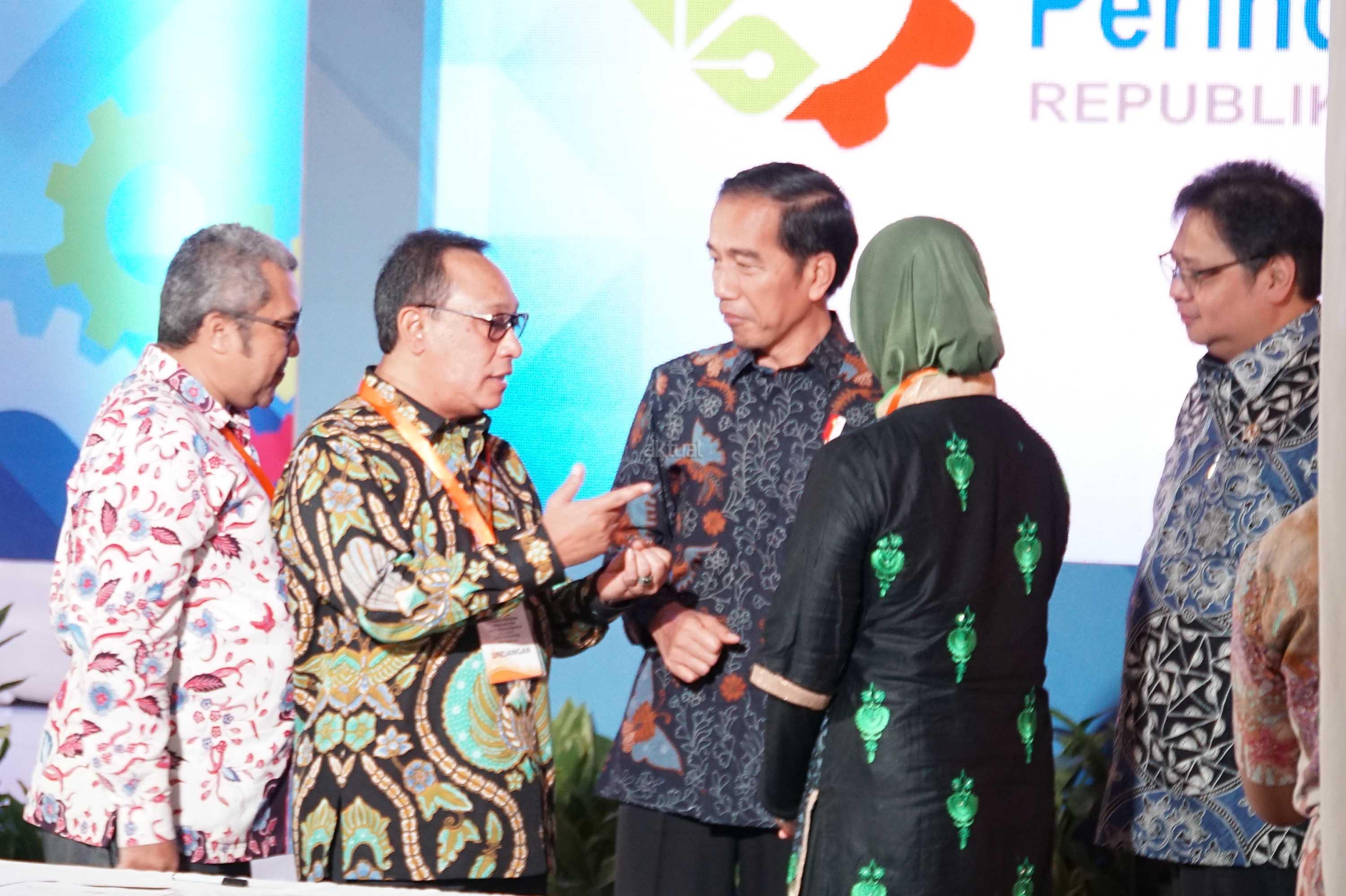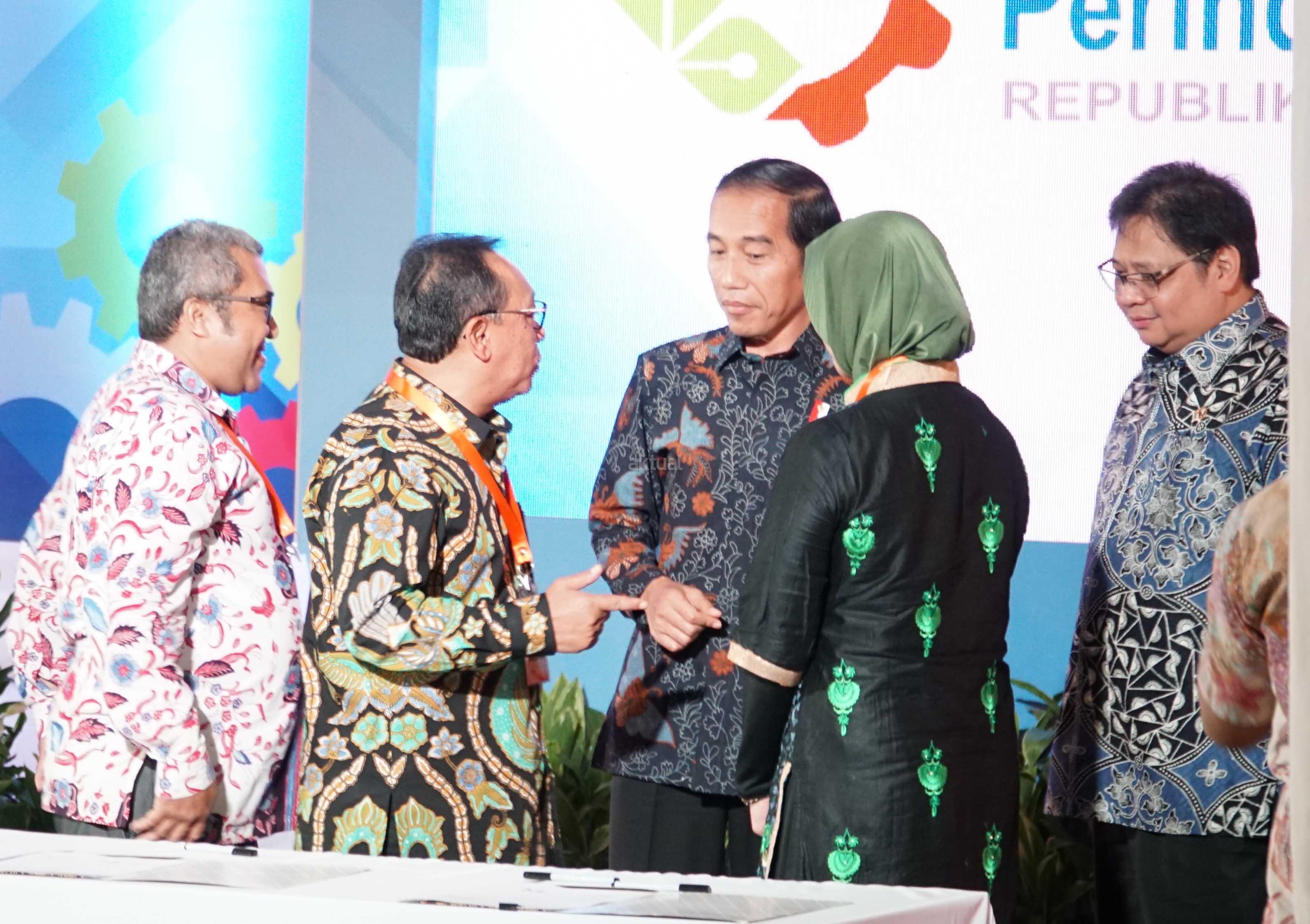 Direktur Utama PT Bank Tabungan Negara (Persero) Tbk Maryono bersama Pimpinan Pondok Pesantren Al Ashriyyah Nurul Iman Waheeda Binti Abdul Rahman dan Direktur Utama PT Data Aksara Matra Aditya Riyadi menandatangani Nota Kesepahaman (MoU) disaksikan Presiden Joko Widodo dan Menteri Perindustrian Airlangga Hartarto di Cikarang, Bekasi, Jawa Barat, Jumat (29/7). MoU tersebut bertujuan mengembangkan kemandirian Pondok Pesantren di bidang ekonomi digital melalui penggunaan financial technology untuk menggunakan jasa produk perbankan syariah BTN seperti pembiayaan KPR BTN iB, payroll/gaji, Deposito , Giro, Tabungan iB dan jasa perbankan lainnya. AKTUAL/HO
