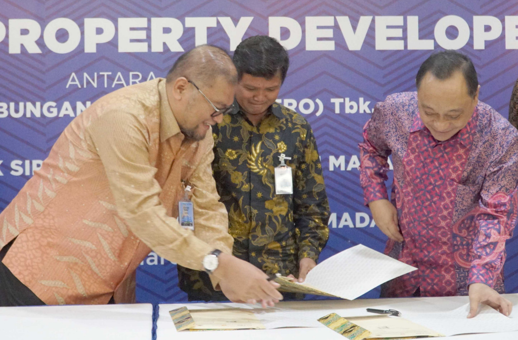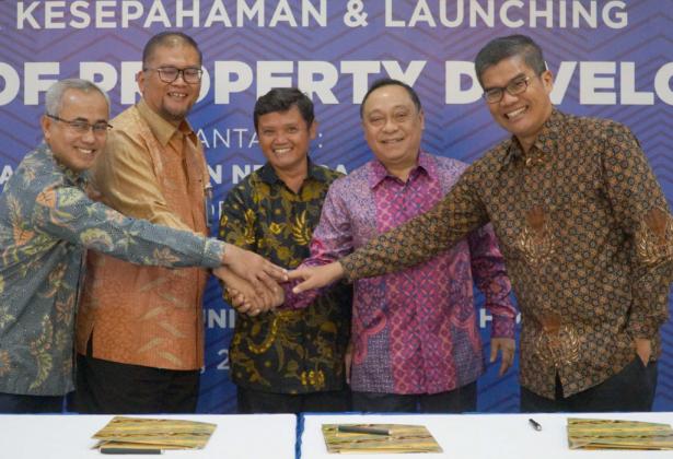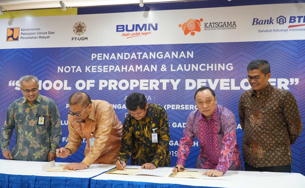 Direktur Utama PT Bank Tabungan Negara (Persero) Tbk Maryono (kedua kanan) menandatangani MoU tentang Pengembangan SDM dan Riset disaksikan (kiri ke kanan) Sekretaris Ditjen Penyediaan Perumahan Kementerian PUPR Dadang Rukmana (kiri), Ketua Keluarga Alumni Teknik Sipil Universitas Gadjah Mada (KATSGAMA) Mursyid Suyadi (kedua kiri), Perwakilan Fakultas Teknik UGM Joko Sumiyanto (tengah) dan Stafsus Wapres RI Wijayanto Samirin (kanan), di Jakarta, Rabu (20/3). AKTUAL/STR-Eko S Hilman