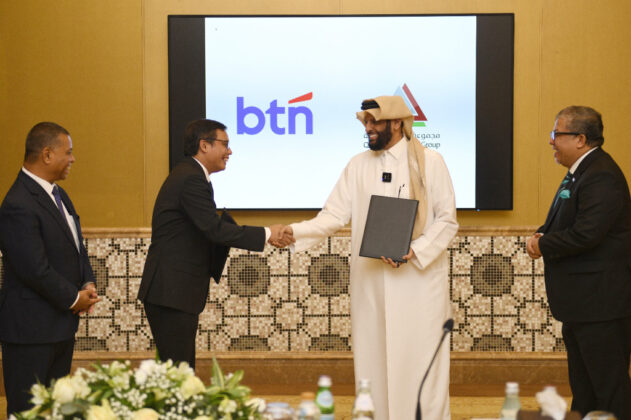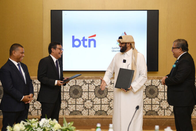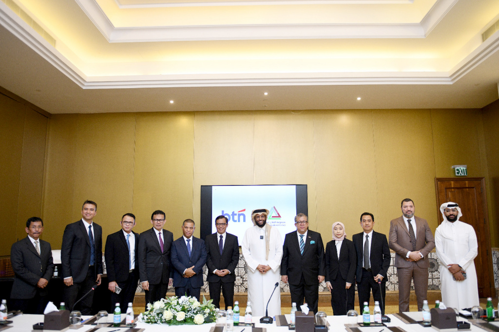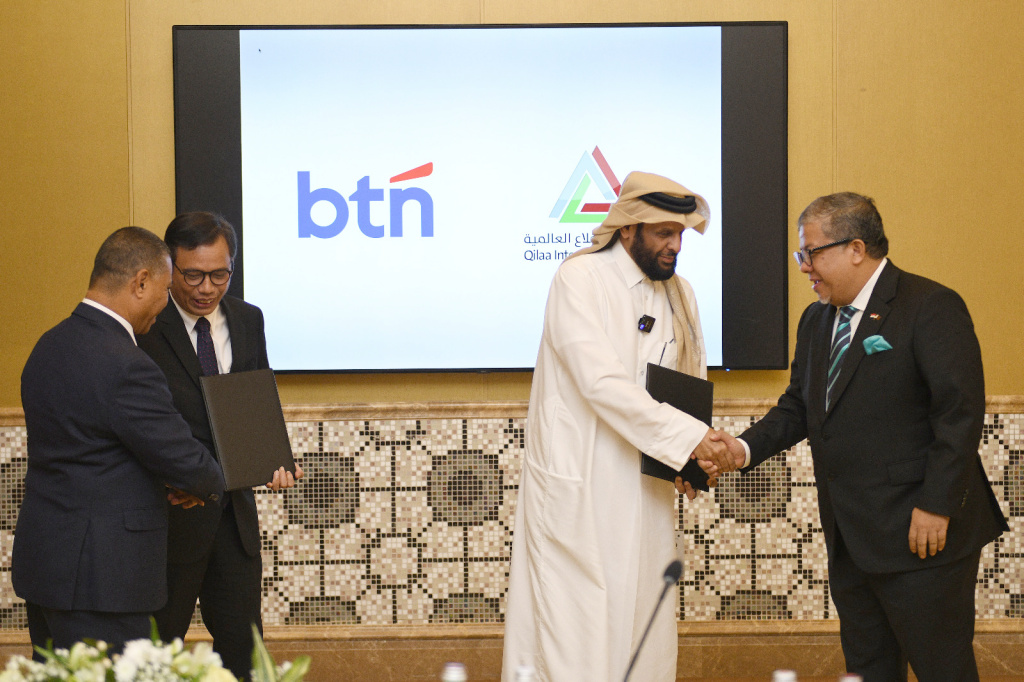 Direktur Utama BTN Nixon LP Napitupulu bersama Chairman AlQilaa International Group, Sheikh Abdulaziz bin Abdulrahman Al Thani melakukan penandatanganan naskah kerja sama disaksikan Wakil Menteri Perumahan dan Kawasan Permukiman (PKP) Fahri Hamzah dan Duta Besar Indonesia untuk Qatar Ridwan Hassan di Doha, Qatar, Selasa (8/4/2025).